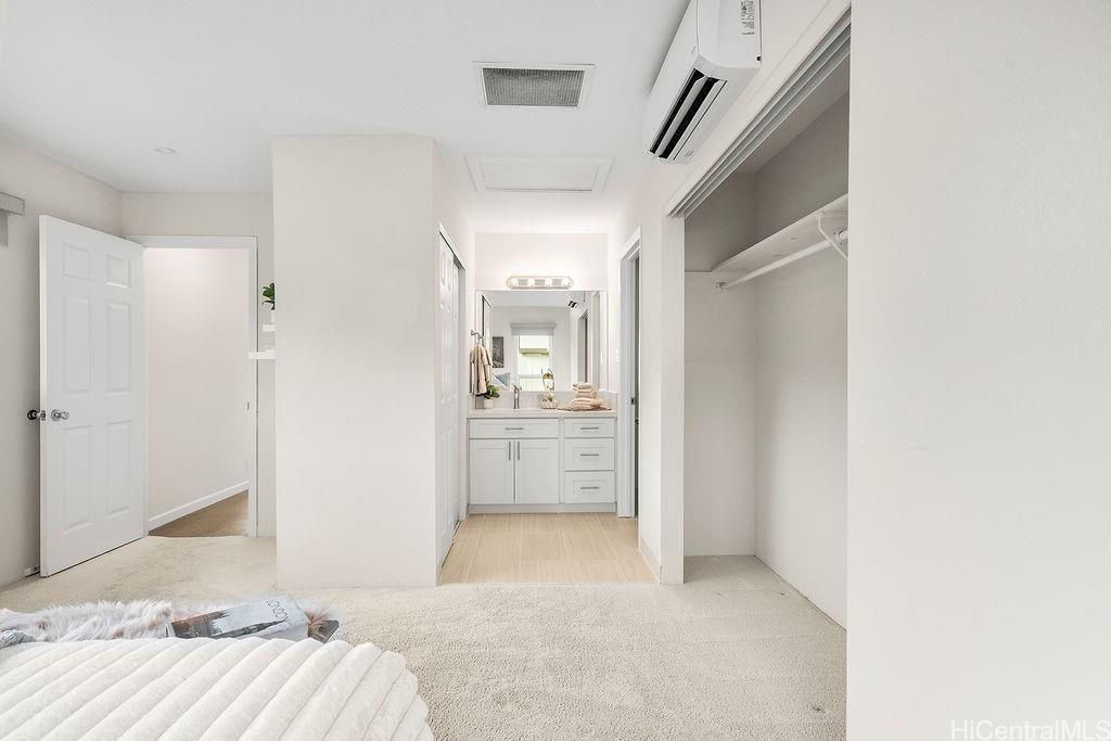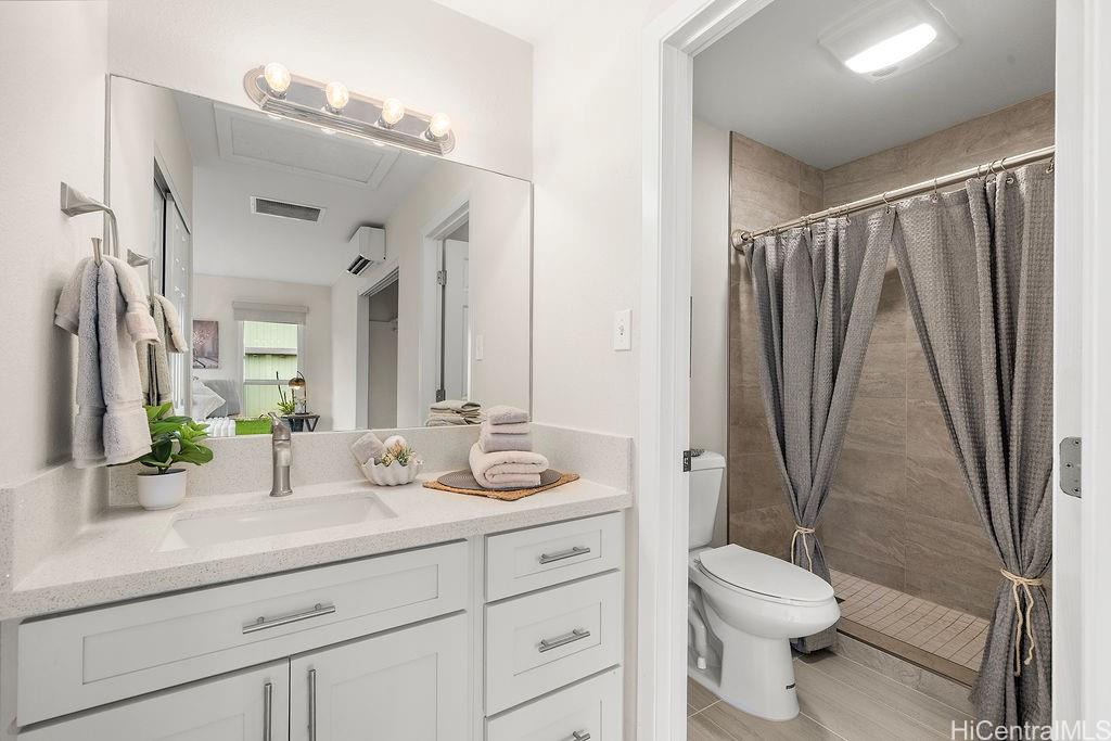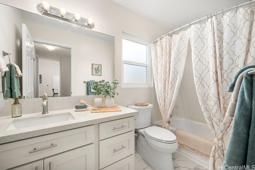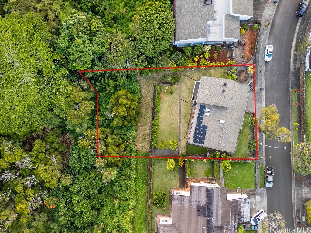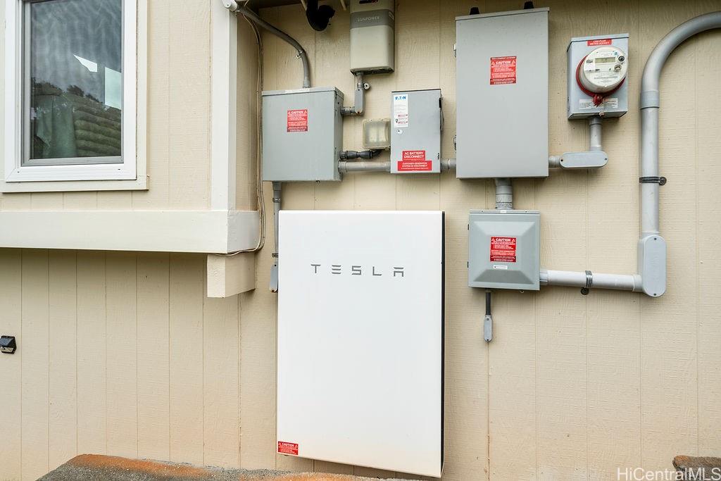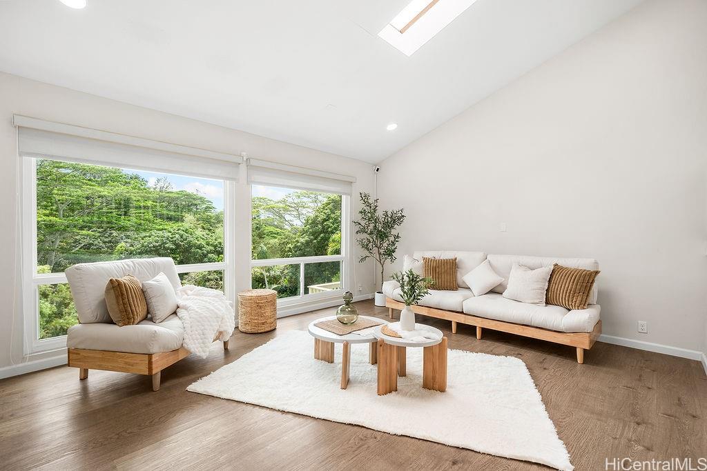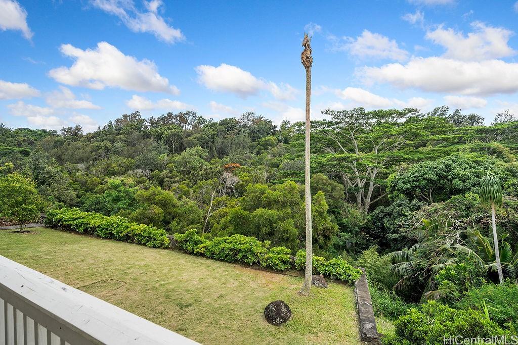 Peaceful and private retreat, lined with lush greenery, welcomes you home to Newtown Estates! This updated 3 bedroom, 2.5 bath home, on a large rim lot, features two spacious living areas with vaulted ceilings, skylights and large picture windows taking in plenty of natural light. Also included are split A/C in each room, an owned Photovoltaic System with Tesla battery and a bonus storage room with additional storage areas in the attic space as well as below the home. The primary living area, with 2 bedrooms, full bath, kitchen, living room and laundry, is located on the street/carport level for easy accessibility. Conveniently located near Pearlridge Center, hospitals, restaurants and military bases. Don’t miss this opportunity to experience the serenity of island hillside living!