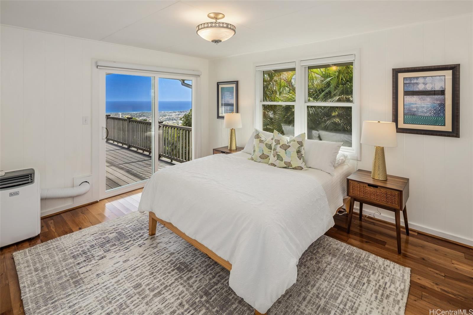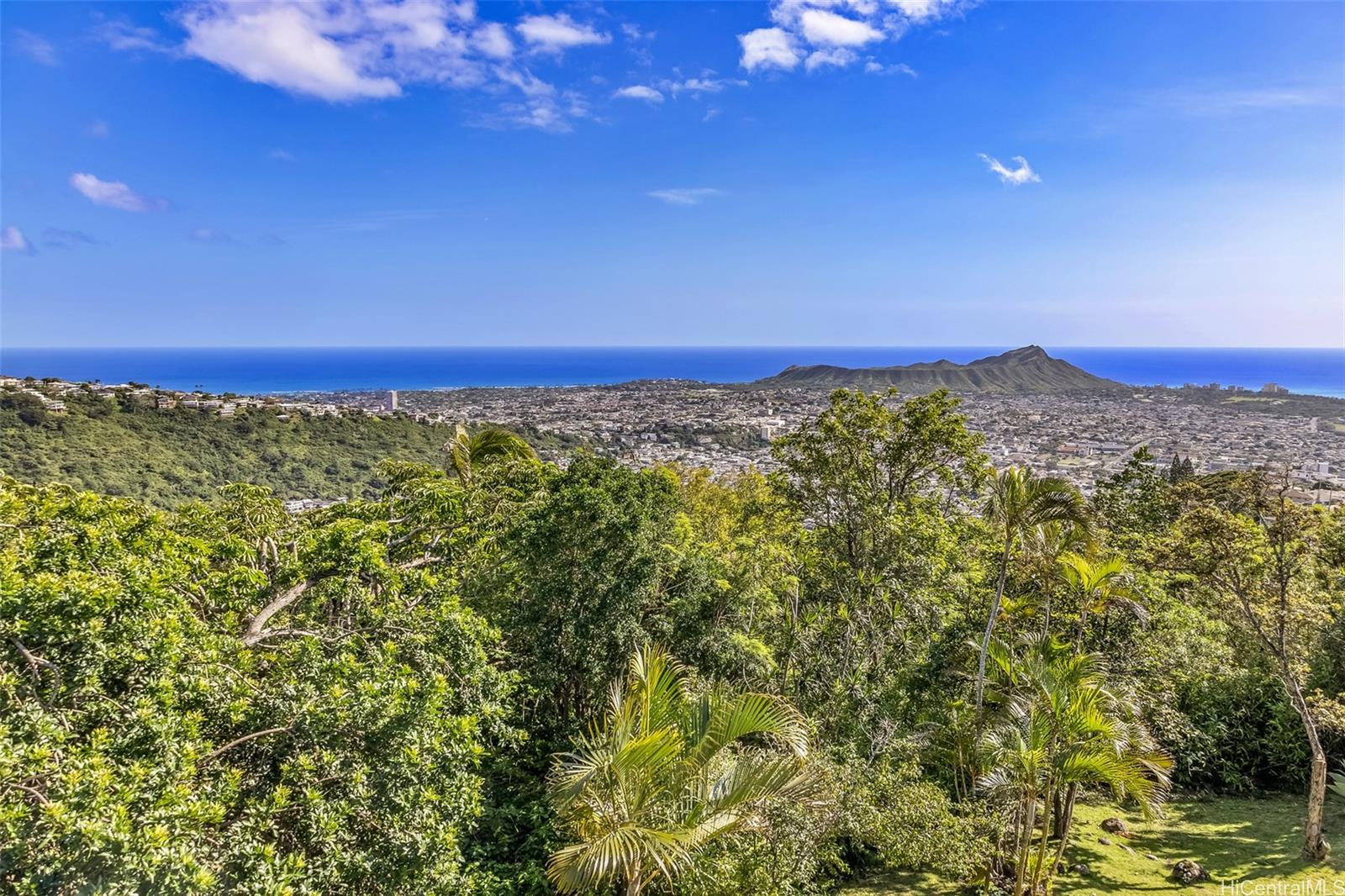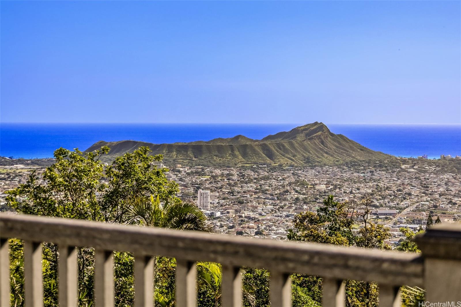 Poised at the top of St. Louis Heights on a quiet cul-de-ac, this rim-lot 3BD/2BA single-level home captures sweeping Ewa, Diamond Head and Kahala views with cooling trade winds and rare privacy. No homes directly across (Dept. of Water property) and backing to C&C land. Remodeled and expanded in 2012 by Sunworks Construction, LLC (approx. 300 sf addition), the home features a spacious primary suite with walk-in closet and ensuite bath. Upgrades include Acacia hardwood flooring, custom cabinetry, Granite countertops and backsplash, large Japanese kitchen sink with built-in Kangen filtration, recessed LED lighting, Italian fixtures, new windows, new copper plumbing, custom vanities, dedicated shower and soaking tub in primary bath, new toilets, four automatic blinds, and two window AC units. Fresh interior/exterior paint. Trex deck and railing, new exterior sconces, storage below house. Lush landscaping with drip irrigation and mature fruits trees (avocado, red grapefruit, pomelo, tangelo), red sealing wax palm, puakenikeni and more. New roof (2021), front yard cedar fencing and stone wall (2021), new refrigerator, range & washer (2025). Two-car carport and ample street parking.