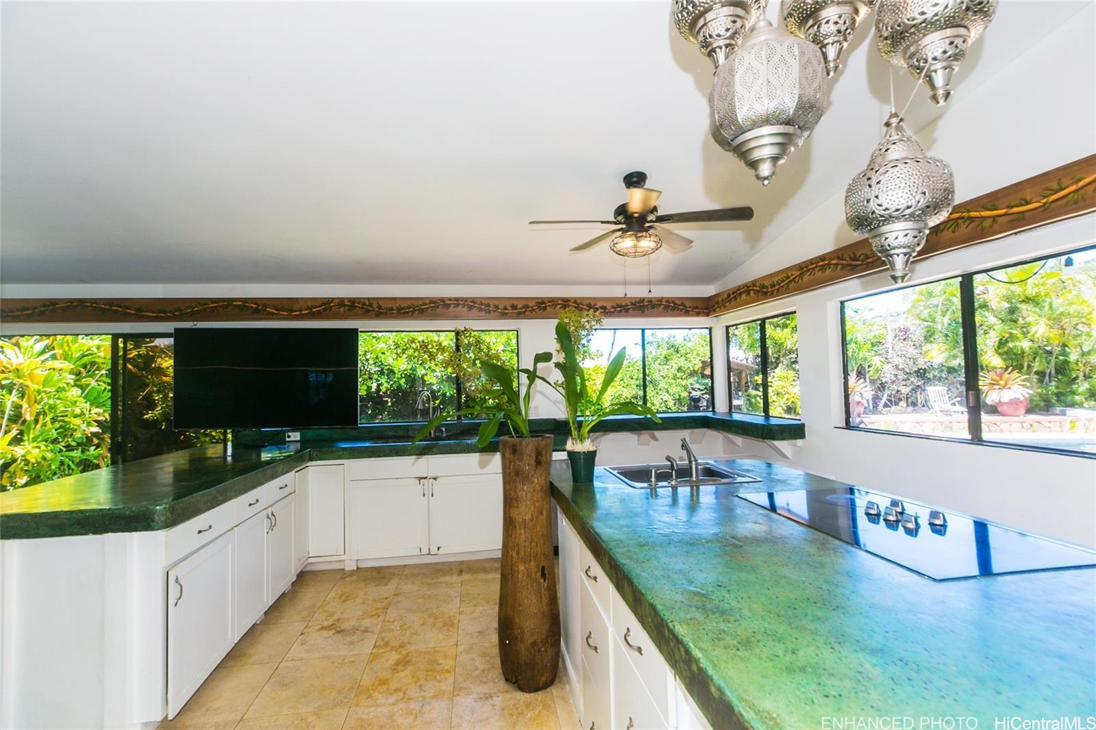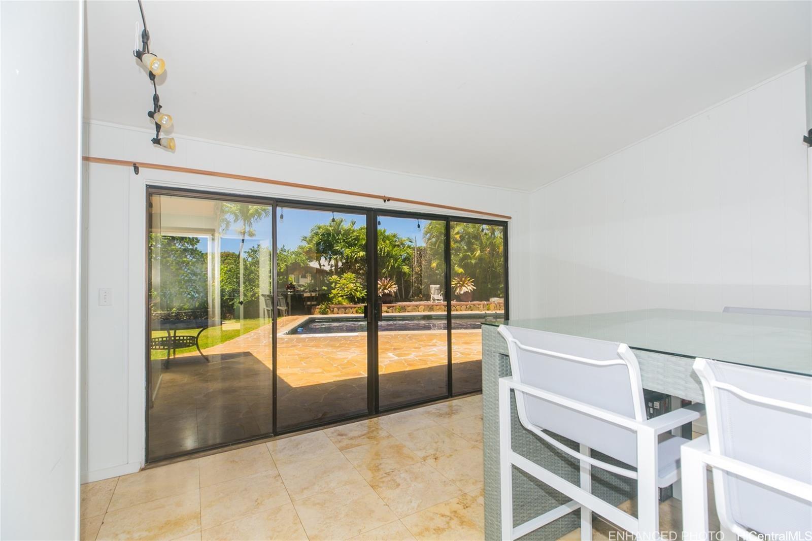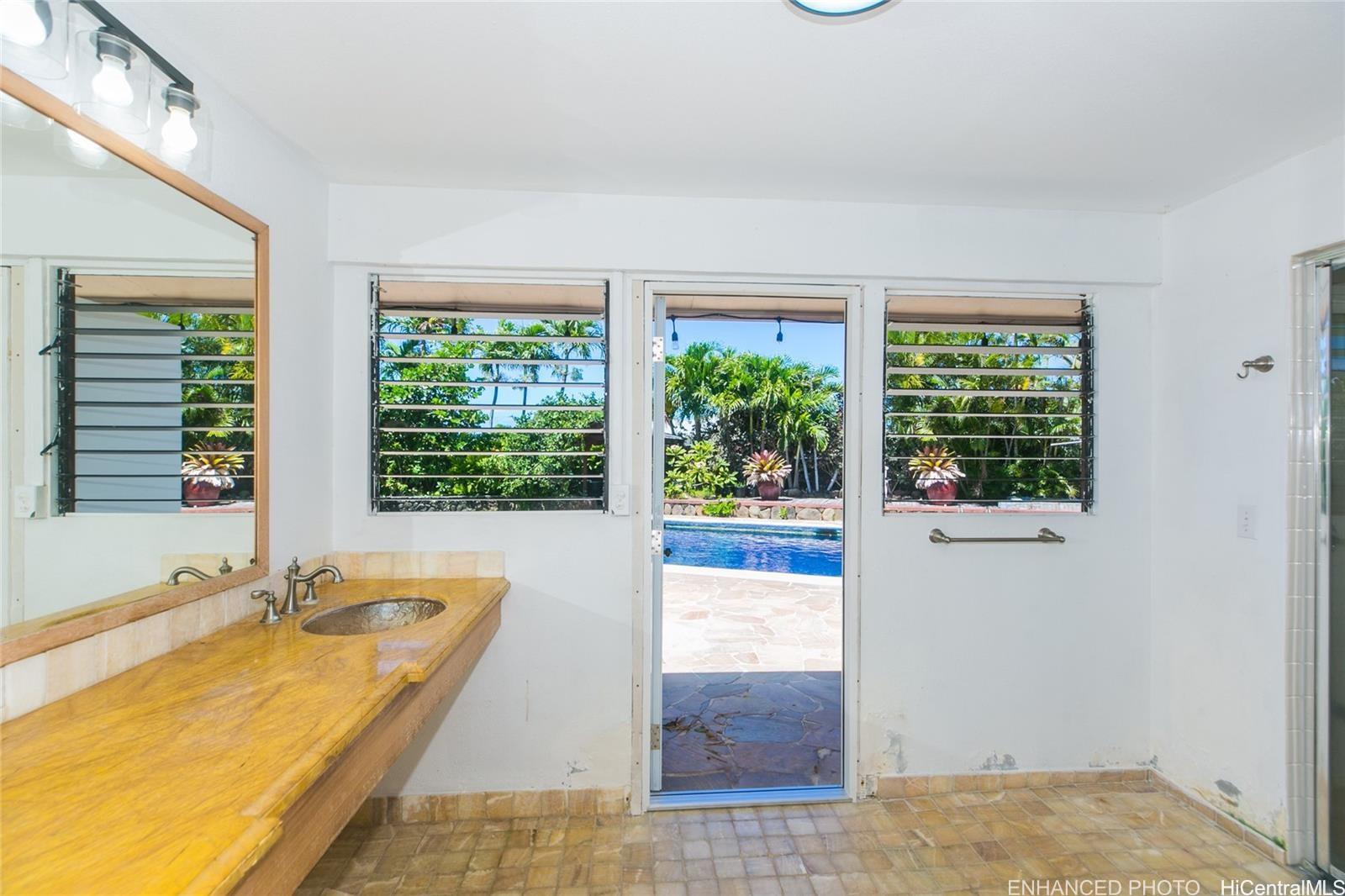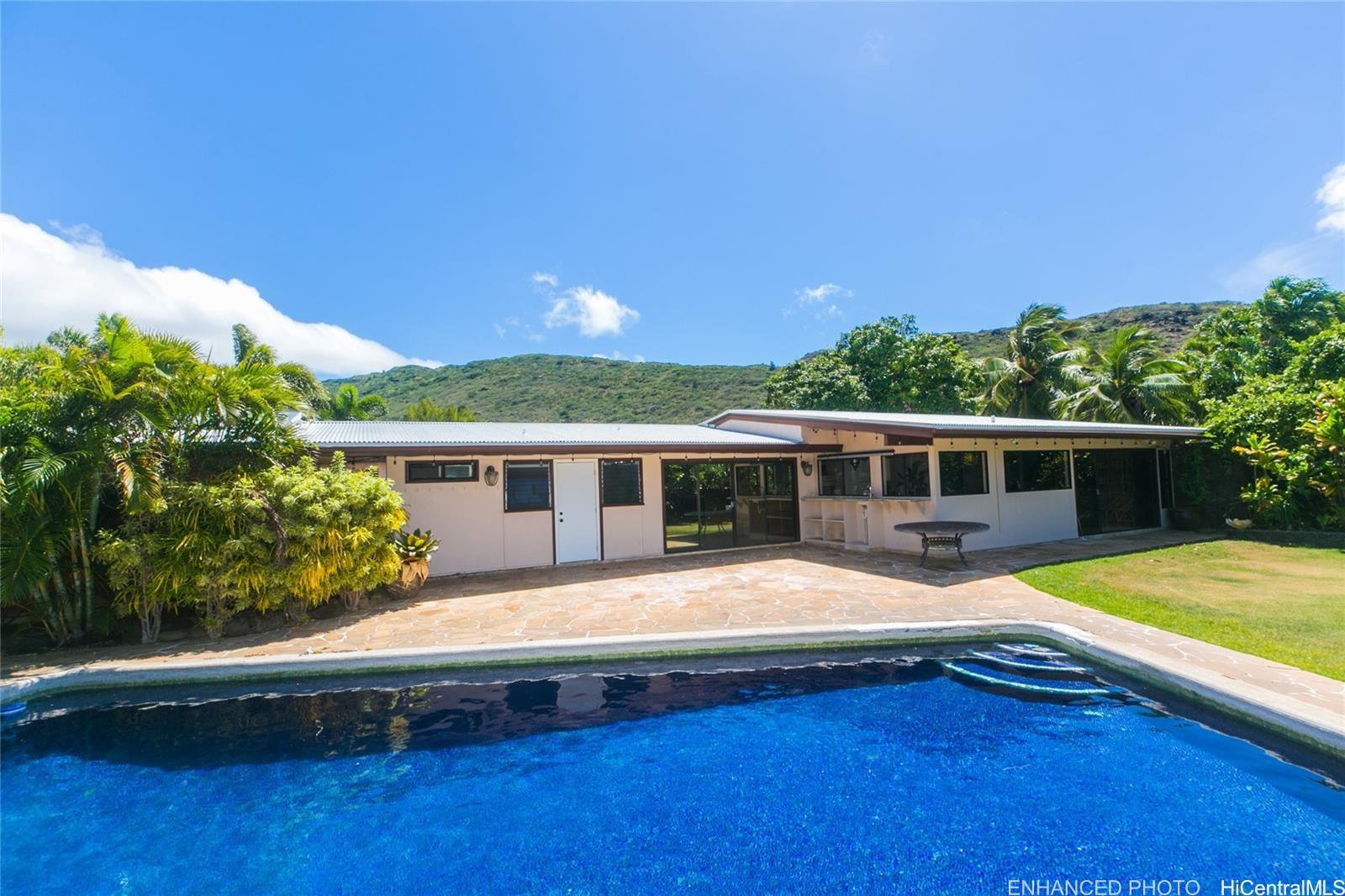 Wonderful corner lot property conveniently placed just minutes away from shopping, dining, gas stations andschools. Unique layout with spacious bedrooms that have living spaces between each other. Large family room witha versatile kitchen and a large dining area. Sprawling backyard, with fruit trees, flowers and fauna galore. Swimmingpool with spacious seating area and a rustic sauna just waiting to be brought back to life for everyday enjoyment.Walk to Niu Valley, 7-11 and wonderful restaurants too. This is a short sale listing, which means the lender willreview the offers and make the decisions for the possible transaction and sale. Buyer is responsible to do their owndue diligence. This property is sold as-is.