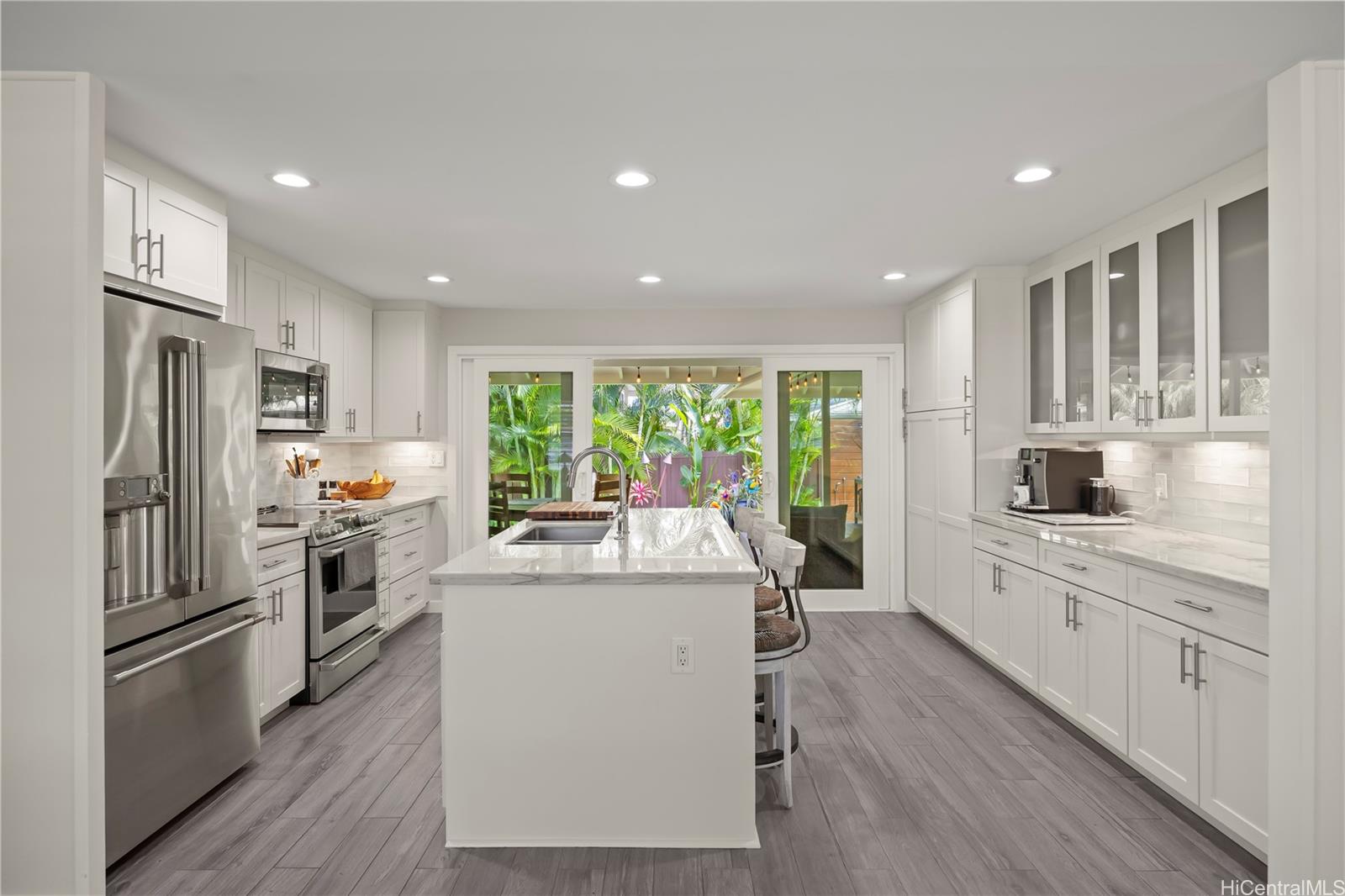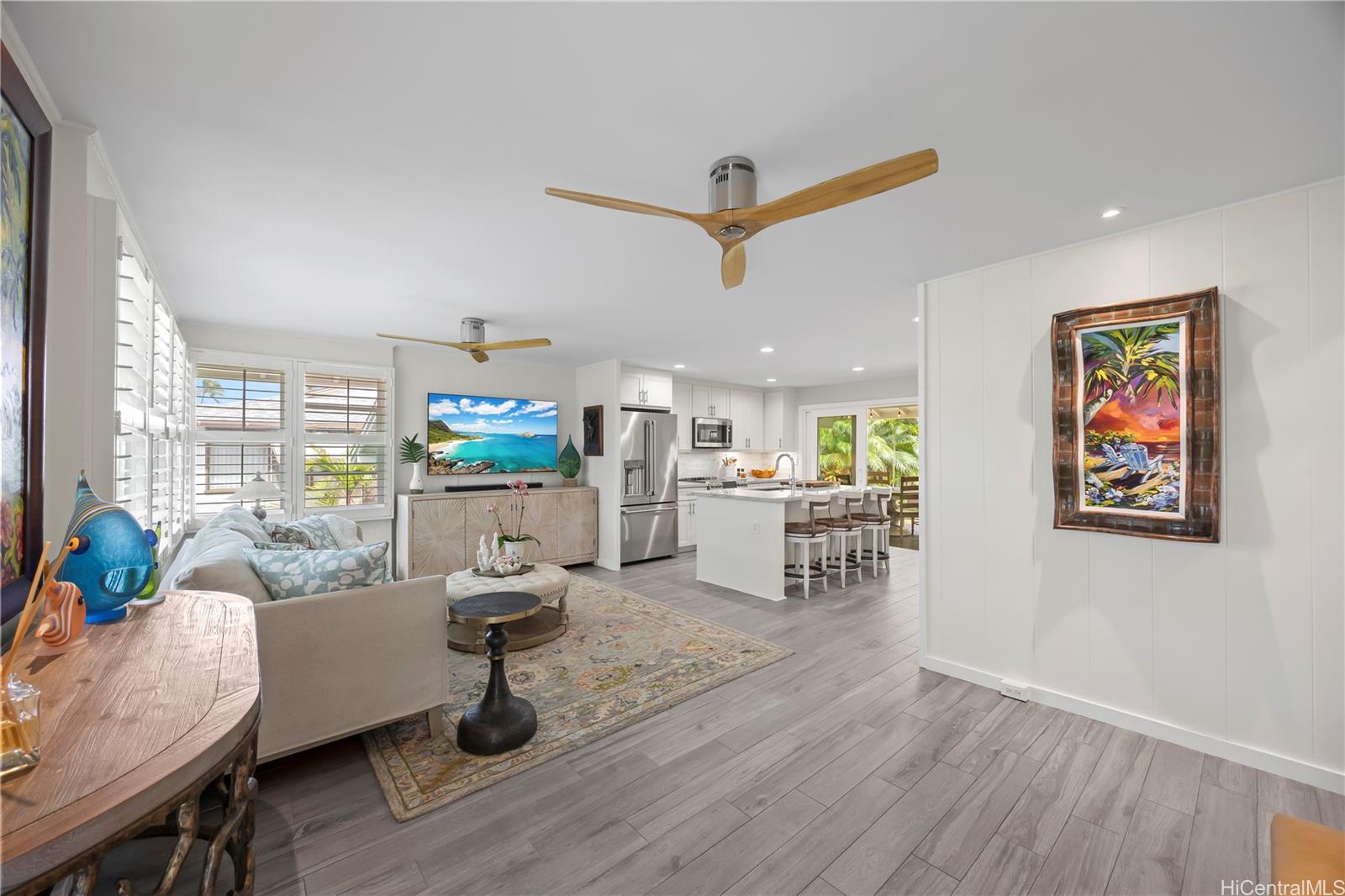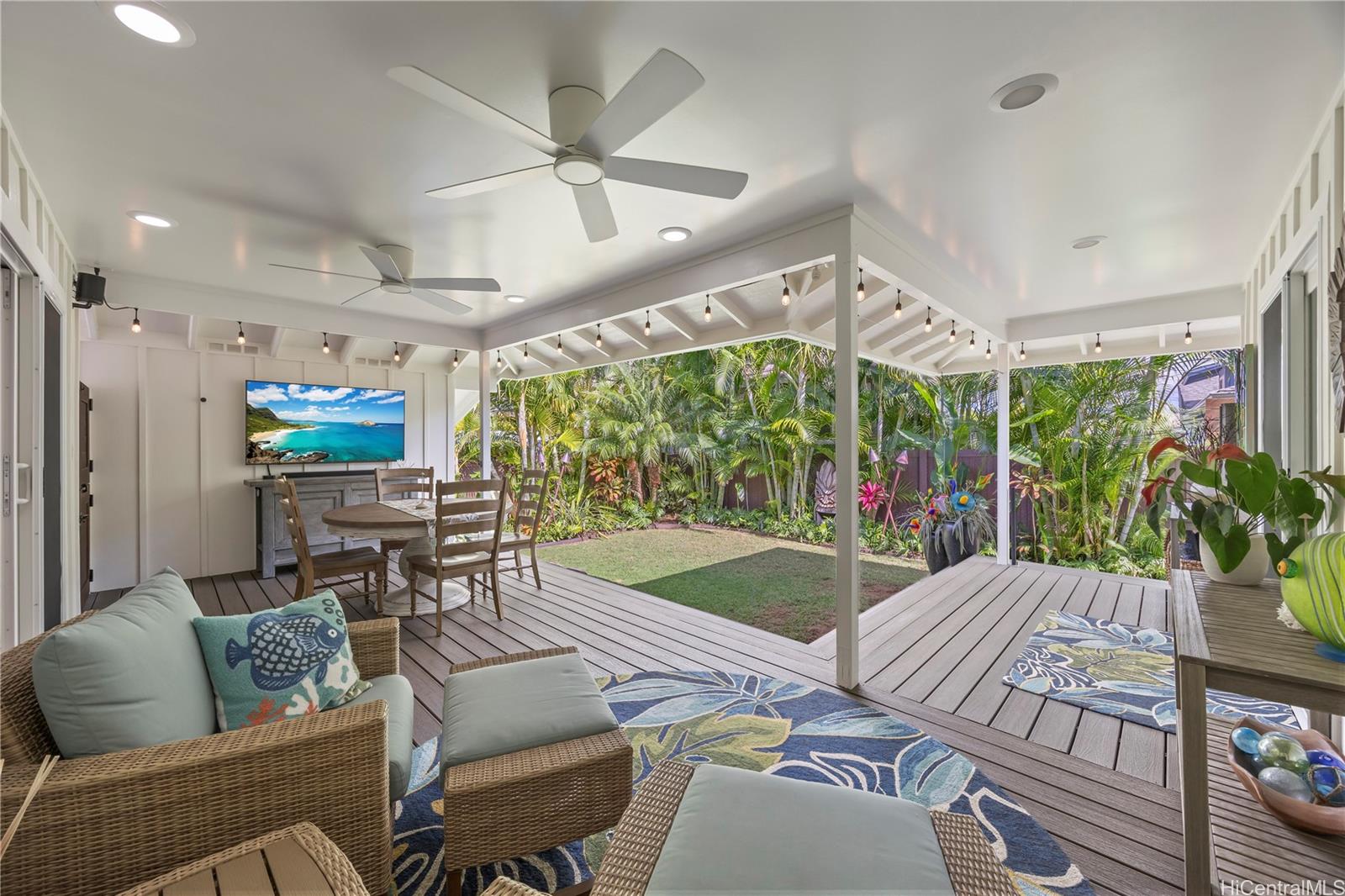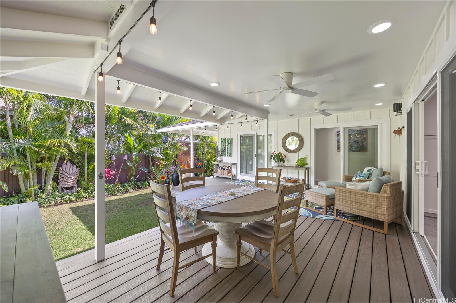 Exceptional Kalama/Coconut Grove turnkey home privately set back from the road in a peaceful cul-de-sac setting just steps from Kailua Town and less than a mile from world-famous Kailua Beach. This beautifully upgraded 3br/2ba residence offers seamless indoor-outdoor living with a dramatic 12-foot double sliding glass door opening to a spacious covered lanai with low-maintenance Trex decking. Features include tile flooring throughout, custom LED lighting, multi-zone split-system AC, custom double-hung windows with lifetime warranty, and plantation shutters throughout, providing excellent airflow, privacy, and natural light. The kitchen offers granite countertops with center island and high-end stainless steel appliances. The primary suite features walk-in closet and large sliding glass door opening directly to the lanai. Enjoy resort-style outdoor living with professional landscaping, brass lighting, copper tiki torches, outdoor shower, and a top-quality hot tub. Additional highlights include 3-car parking, lockable storage shed for surfboards and beach gear, fully gated front and back yards, and a complete sprinkler system. *No showings till Broker’s Open on 4/23, 9.30am-12.30pm*