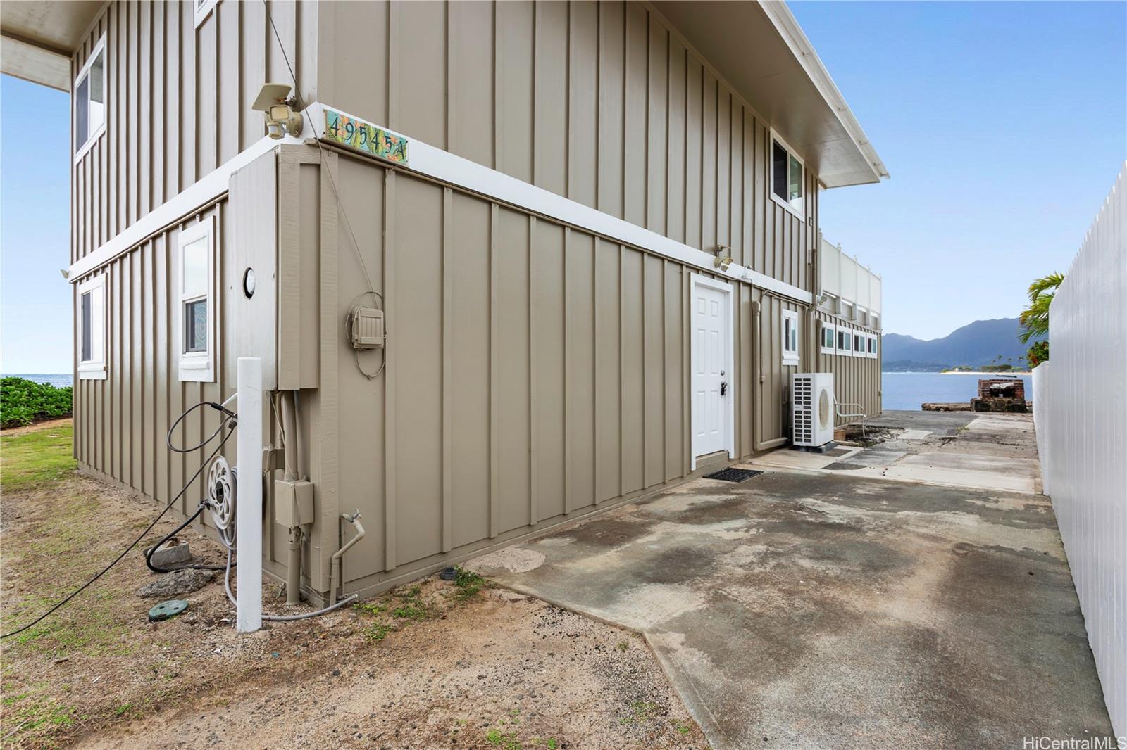 AMAZING, UNIQUE, AND RARE OCEANFRONT PROPERTY WITH GORGEOUS PANORAMIC VIEWS!! Positioned on an oceanfront point with water frontage on two sides, this very special lot boasts expansive unobstructed views of legendary Chinaman’s Hat island, Kaneohe Bay, the majestic Koolau Mountain Range, beautiful sandy Kualoa Regional (Beach) Park, and more! Enjoy exceptional natural privacy, direct ocean access, and a private boat ramp. On a private lane off Kamehameha Hwy. across from wonderful Kualoa Ranch. Move right in – freshly painted with a kitchen renovation in 2018. Enclosed downstairs lanai, upstairs beautiful deck, both perfect for entertaining. 1 bed/1 bath downstairs, 2 bed/1 bath upstairs. SPLIT A/C UNITS IN EACH ROOM! Within about half an hour drive to Kaneohe Marine Base, less to Kaneohe Town. Interior size and number of bedrooms differ from tax record. MUST SEE TODAY!