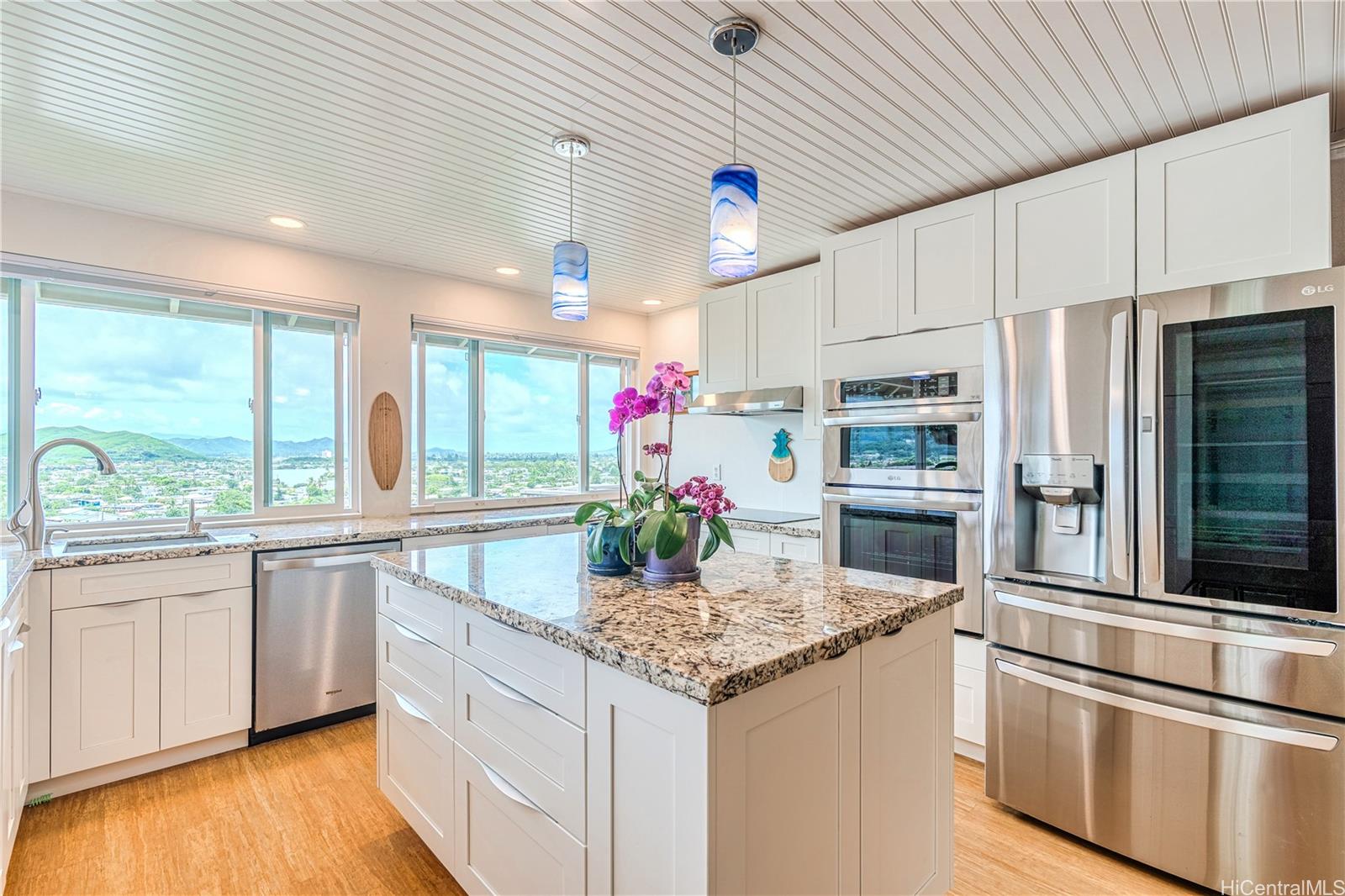 Perched in the highly sought-after Hillcrest enclave of Kailua, this fully reimagined 3-bedroom, 2.5-bath residence delivers the lifestyle buyers compete for, with sweeping 180° views from Kailua Beach across Enchanted Lake to the majestic Ko?olau Mountains; inside, a showpiece gourmet kitchen anchored by an oversized 3×5 island, granite countertops, and custom cabinetry creates an immediate sense of status and connection, while expansive living and dining areas flow seamlessly to dual lanais for effortless indoor-outdoor living; the upstairs primary suite offers a private retreat, while downstairs reveals a fully separate 1-bedroom ‘ohana unit with its own entrance, lanai, and garden—positioning this property as both a dream home and a strategic income-producing asset; outside, a lush, sensory-rich landscape with mature fruit trees and fragrant jasmine and puakenikeni enhances emotional appeal, while the new 8×16 lanai captures unforgettable sunset views and the bamboo-enclosed front yard delivers rare privacy in one of Kailua’s most competitive and tightly held neighborhoods—homes like this don’t wait, they get claimed. VA ASSUMPTION FOR VETERANS OR NONVETERANS. 2.75% APR