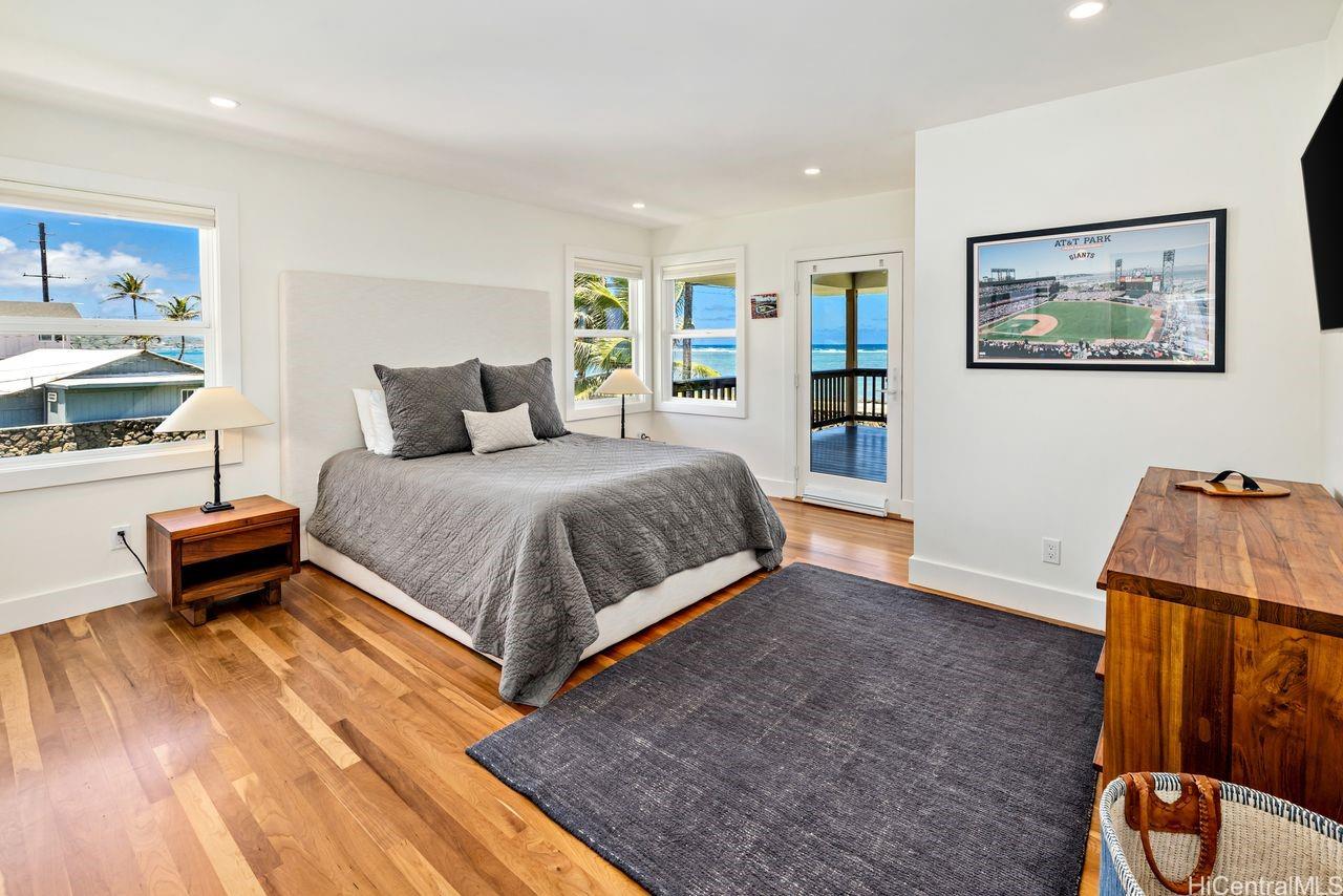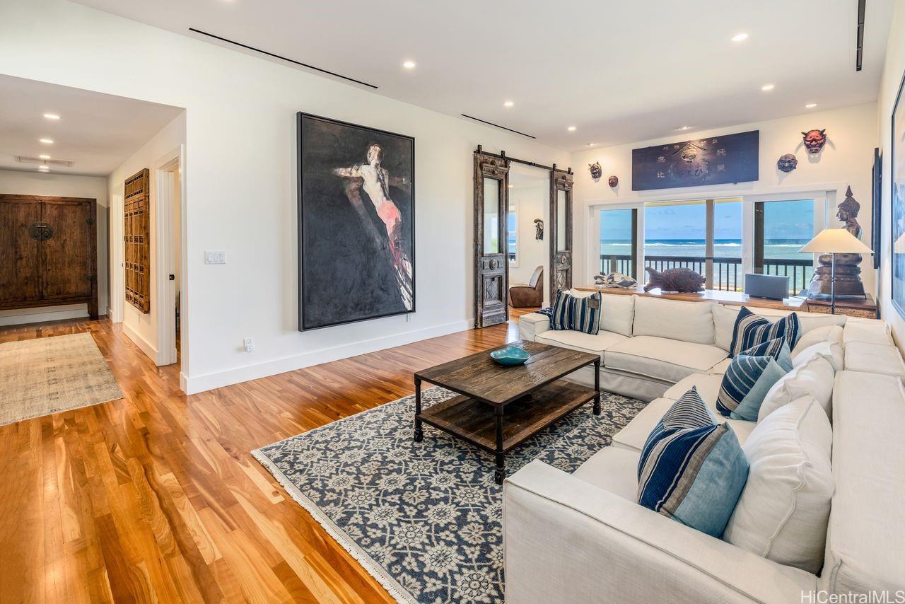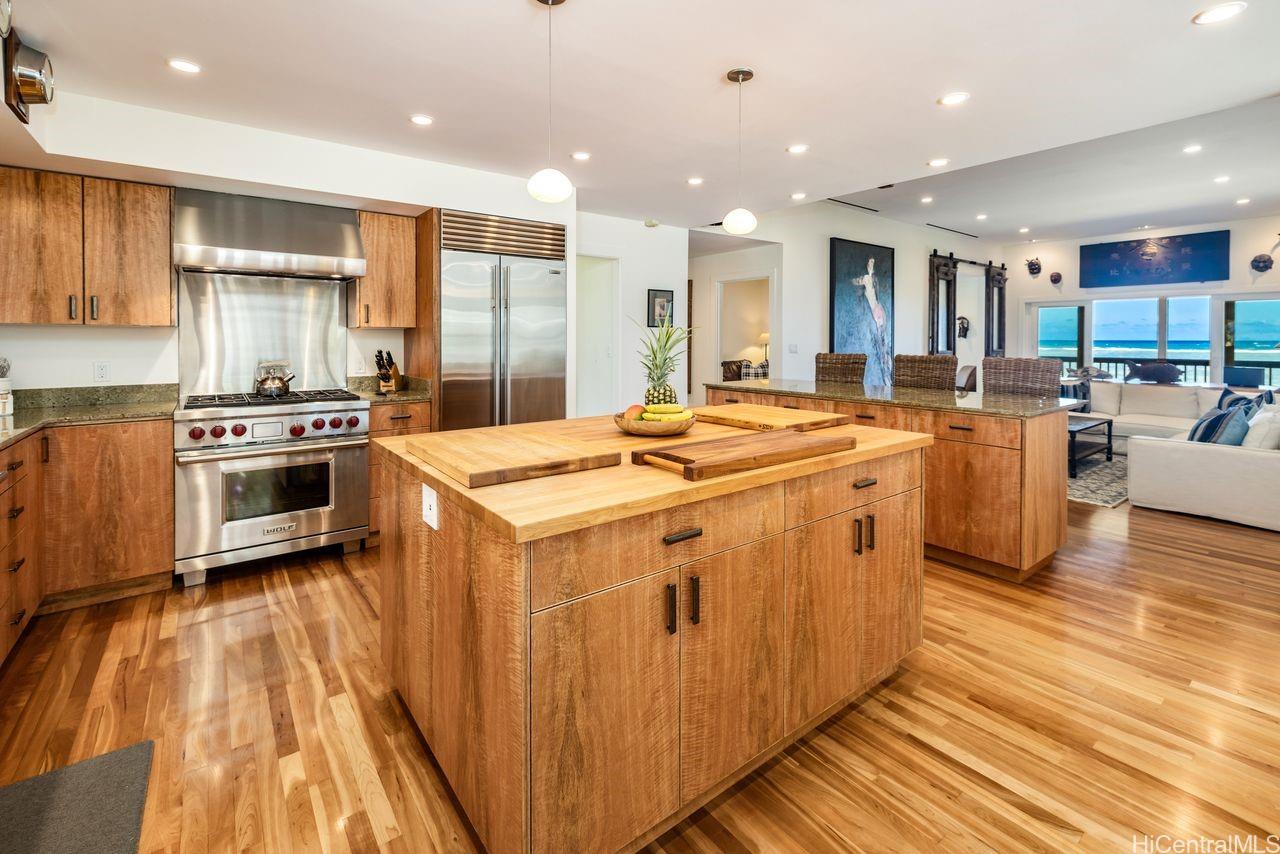 Soak in unobstructed ocean views and cool sea breezes from this exceptional home in a prime Hauula location- just steps from the beach! Completely remodeled in 2014 and meticulously maintained, this 3 bedroom, 4 bath home blends comfort, luxury and island charm. The chef-inspired kitchen is built to impress featuring custom mango wood cabinetry, dual islands, granite countertops, a butcher block prep space, Sub Zero fridge, Wolf gas range and a huge walk-in pantry. Entertaining is effortless! Inside, rich cherry wood flooring add warmth throughout while outside Ipe decks and gates offer durability, style & timeless appeal. Stay cool and connected w/ 2 split AC systems, Nest thermostat, integrated sound system,security cameras and a newer roof (2016). The lower level offers generous storage for all your gear and an outdoor shower to rinse off after a day in the waves. It’s everything an active lifestyle demands. And the yard? Massive, lush, tropically landscaped. Perfect for hosting, lounging or just soaking in paradise! This home checks every box- location, elevated finishes and a lifestyle that embraces everything Hawaii has to offer! To be sold simultaneously with MLS 202510245.