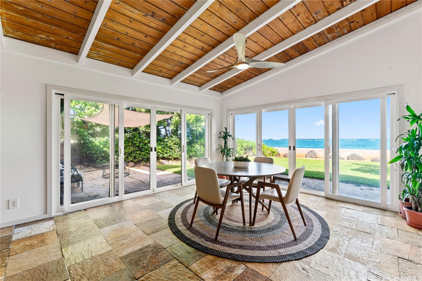Gorgeous ocean front single family home with AC, large grassy yard, garage, permitted sea wall, bonus room, and firepit. If you dream of ocean front living in the country this is your chance! One of the lowest priced ocean front properties on Oahu’s North Shore with three bedrooms, two bathrooms and large bonus room/enclosed porch. This open concept home is single level and could be your forever home in paradise! Bonus room is large enough for a pool table, hot tub, home gym, home office, entertaining or relaxing with the sounds of the ocean. Sandy beach is present in the summer time with gorgeous surf in the winter. Solar hot water heater and upgraded kitchen with newer appliances also save electricity. Enjoy the backyard fire pit and grassy yard to view both sunrises and sunsets depending on the time of year. Furniture negotiable. Fresh exterior and interior paint October 2024. Solid wood cabinets refinished and composite stone countertops added in 2023. Cool tile floors throughout as well as light colored roof coating keep this home cool. *See our virtual tour, 360 walk through and drone videos.*Seawall permit numbers 755584 & 684164. Buyer and agent to do due diligence.