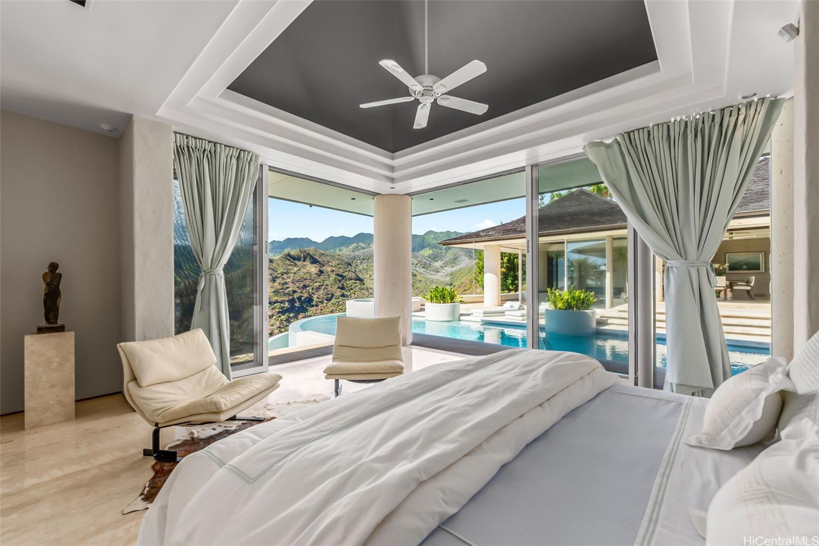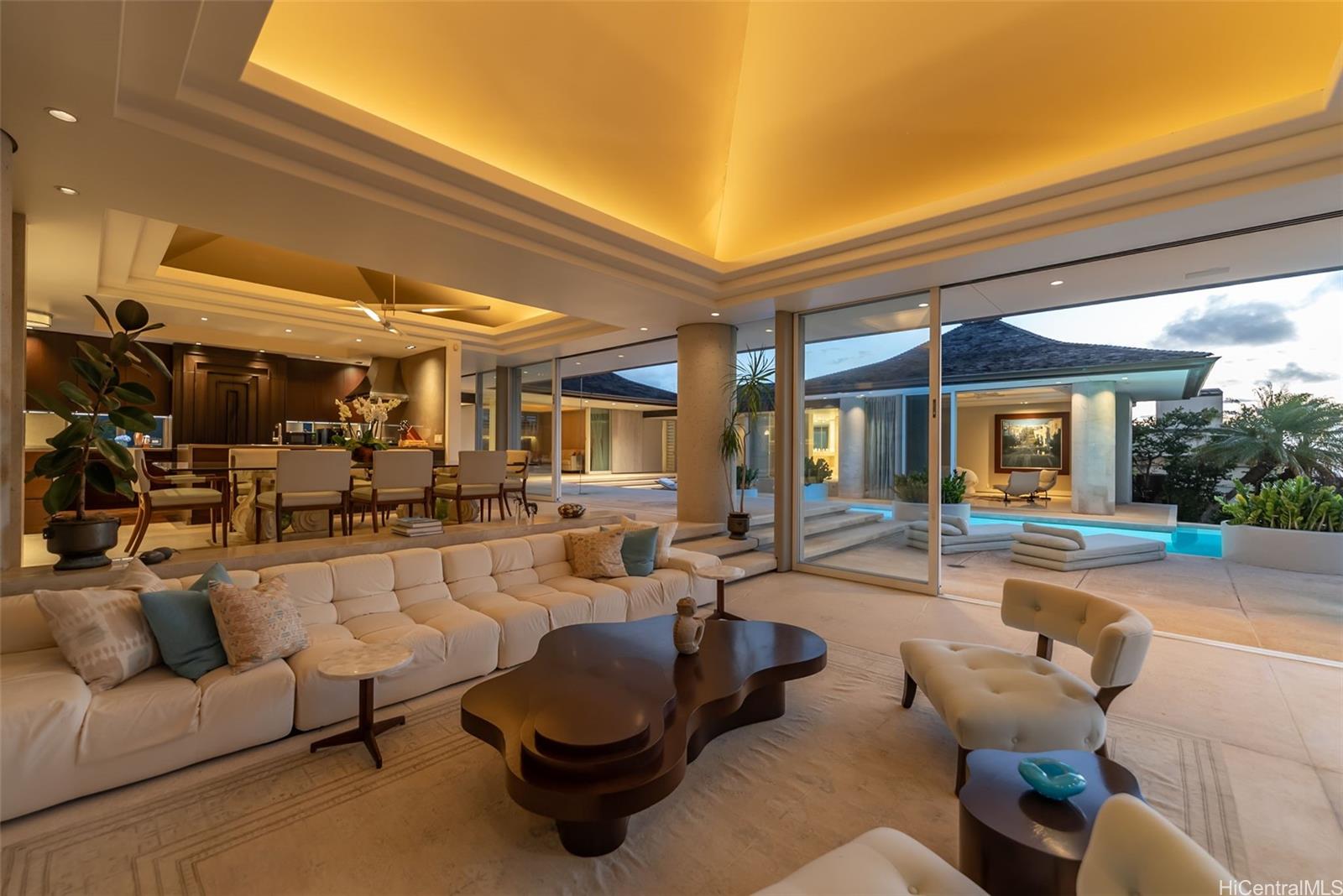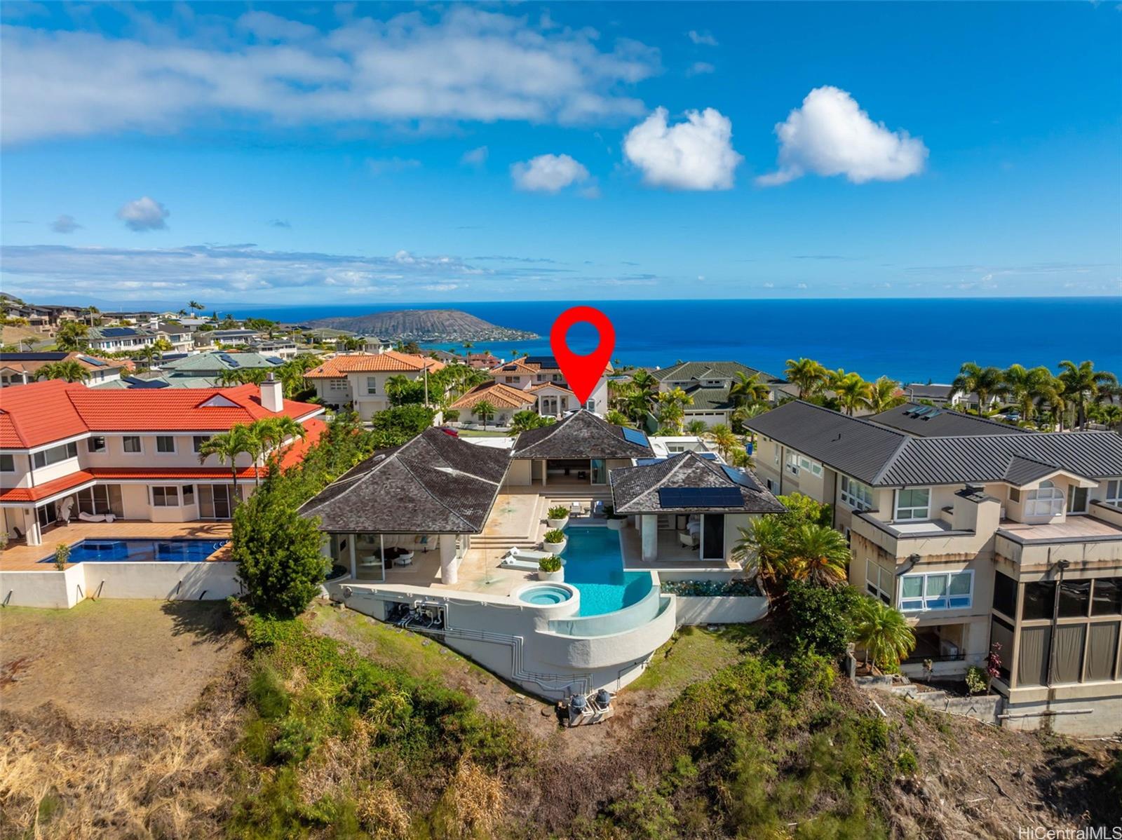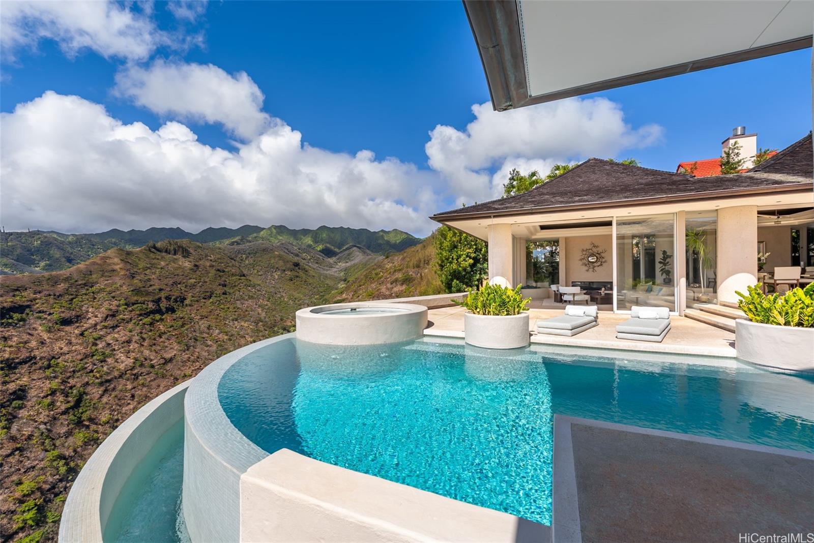 Perched atop the prestigious gated community of Hawaii Loa Ridge, The Summit Retreat House is a rare architectural gem designed by renowned architect Norman Lacayo. Blending timeless design with tropical elegance, this 3-bedroom, 3-bath home features an open floor plan with rich mahogany details, natural stone finishes, and an interior garden that brings the outdoors in. Expansive floor-to-ceiling windows frame panoramic views of both the Pacific Ocean and the majestic Ko’olau Mountains, filling the home with natural light and a sense of serenity. Positioned on a rim lot, the property captures some of the most breathtaking sunsets on Oahu. Enjoy an infinity-edge pool and spa overlooking the ocean, and a chef’s kitchen equipped with high-end appliances designed for both everyday living and entertaining. Located within the secure gates of Hawaii Loa Ridge, this residence offers privacy, serenity, and easy access to Honolulu’s best shopping, dining, and beaches. The Summit Retreat House is more than a home—it’s a refined retreat above it all, where modern design meets Hawaii’s natural beauty.