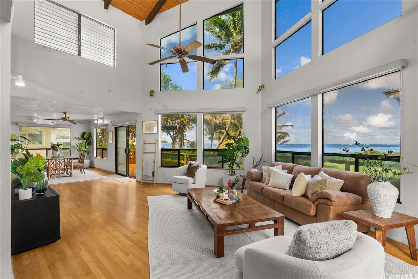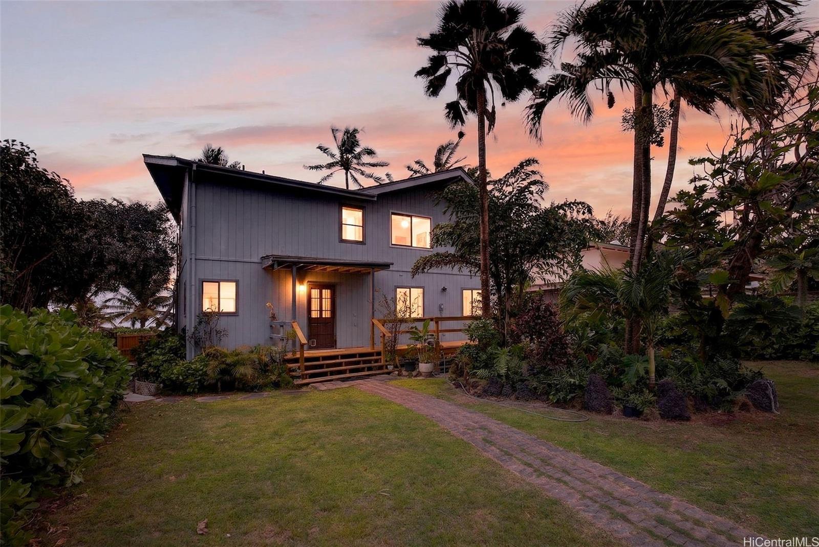 A truly rare opportunity to own an oceanfront parcel in the highly sought-after Waimanalo Beach Lots, offering approximately 70 linear feet of pristine sandy beachfront. With no adjacent public right-of-ways, this property provides privacy and exclusivity. Lush, mature beachfront vegetation creates a natural buffer along the Waimanalo Beach shoreline, enhancing seclusion while still capturing stunning ocean views.The main residence offers nearly 2,000 sq. ft. of interior living space, featuring 3 bedrooms and 2 bathrooms. Expansive windows invite in abundant natural light and showcase views of Waimanalo Beach, Rabbit Island, and Mokulua Islands. The primary suite is privately situated on its own level overlooking the main living area, complete with a spacious walk-in closet and ensuite bath.A separate secondary dwelling includes a generous loft, full kitchen, and bathroom, with beautiful views of the Koolau Mountain – ideal for extended family, guests, or rental potential.Whether you choose to enjoy the property as-is or reimagined into a custom oceanfront estate, this is your chance to secure a prime beachfront lot in the world renowned Waimanalo Beach community.
