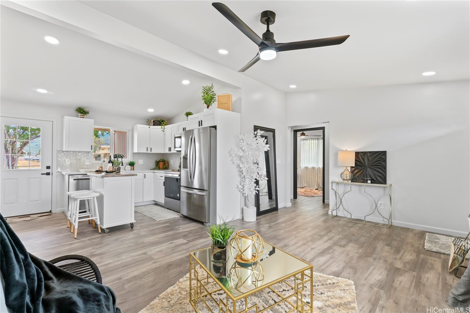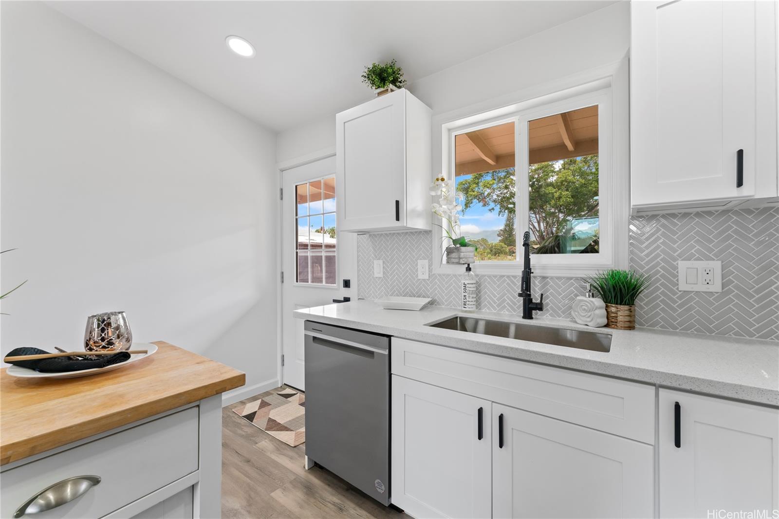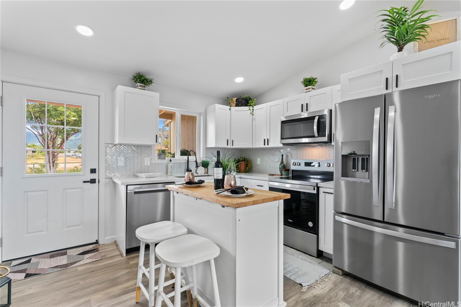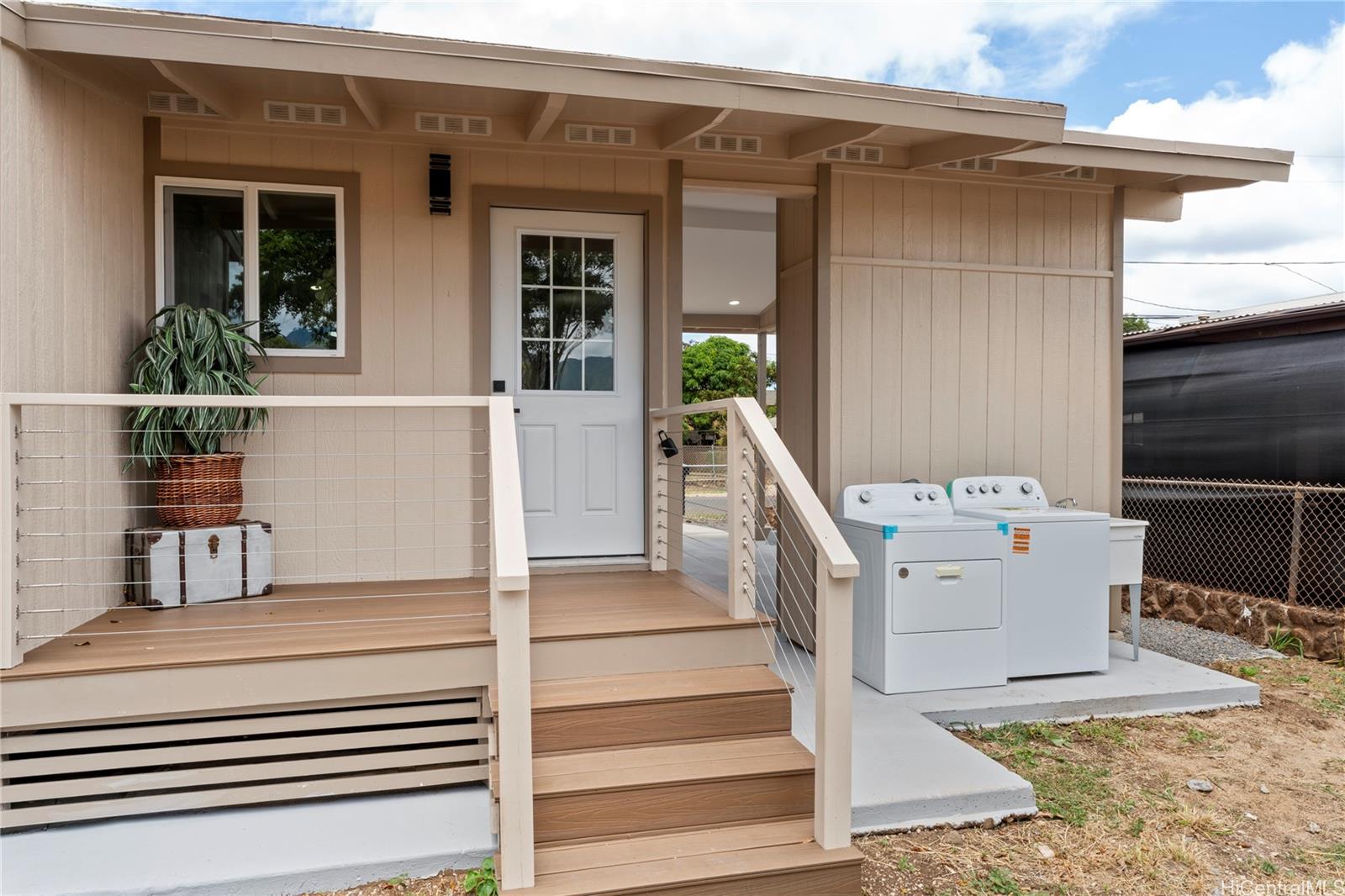 Tastefully renovated three-bedroom, two full bath, single-family home steps from beautiful white sandy beaches. The modern finishes you experience upon entering are a perfect start for a new homeowner to add their personal touches. White shaker cabinets, corian counter tops, laminate flooring throughout, ample storage in the high carport, recess lighting, split AC, and spacious walk-in showers are the highlights of this beautiful home. The decks, which are coming off the master and kitchen, allow you to enjoy the spacious backyard while having your morning coffee. The large yard creates many options for future extension, family gatherings, and many more. The property backs up to a park, so no back neighbors, and also allows a generous stream of breeze to pass through coming from the beautiful Waianae mountain range. Must see to appreciate