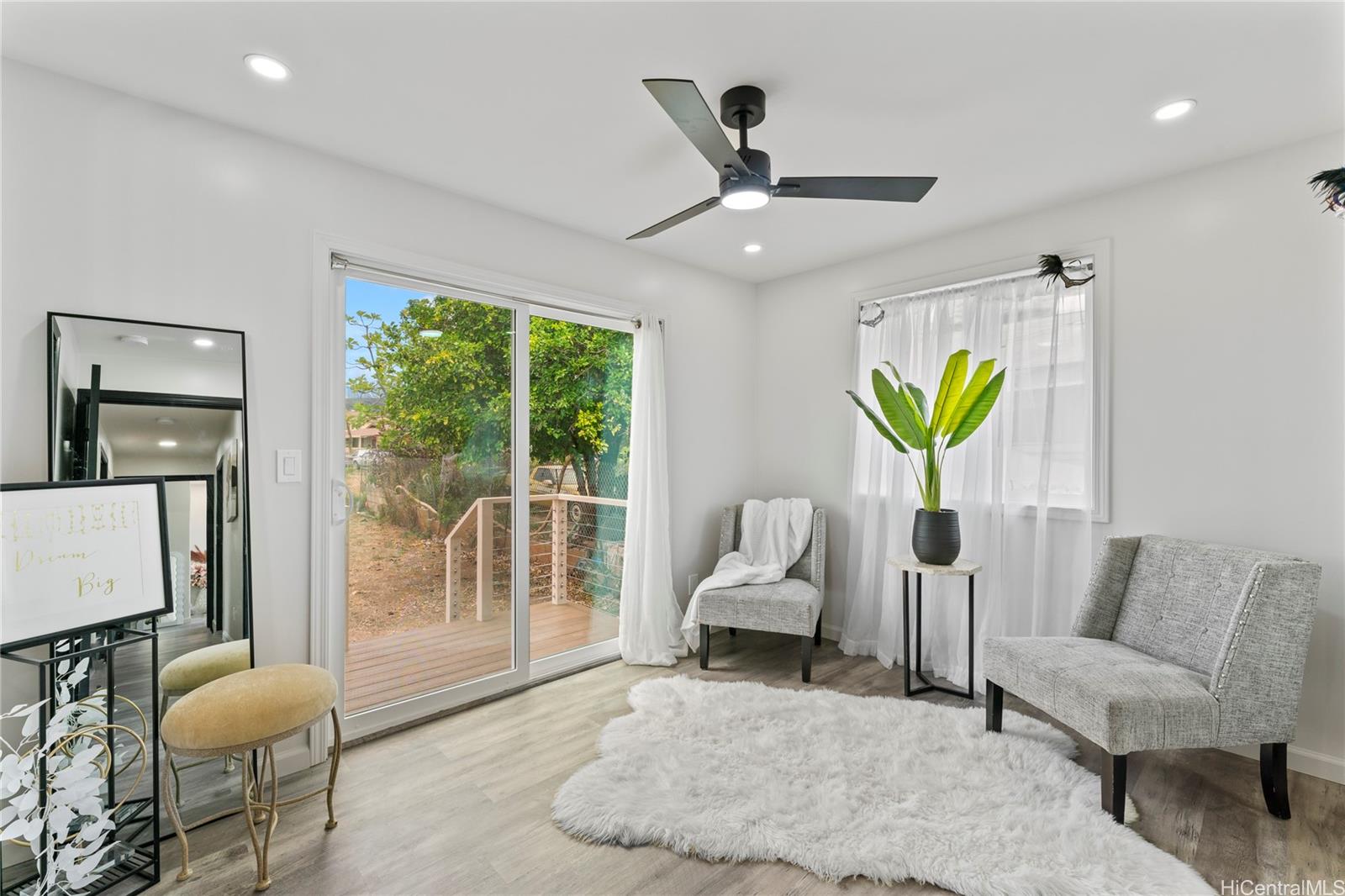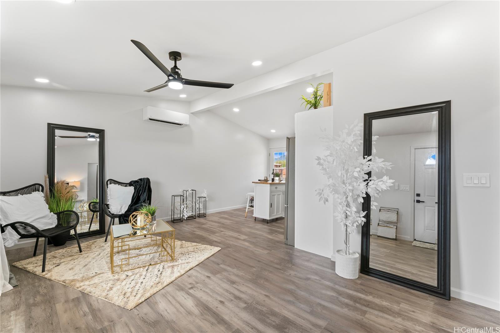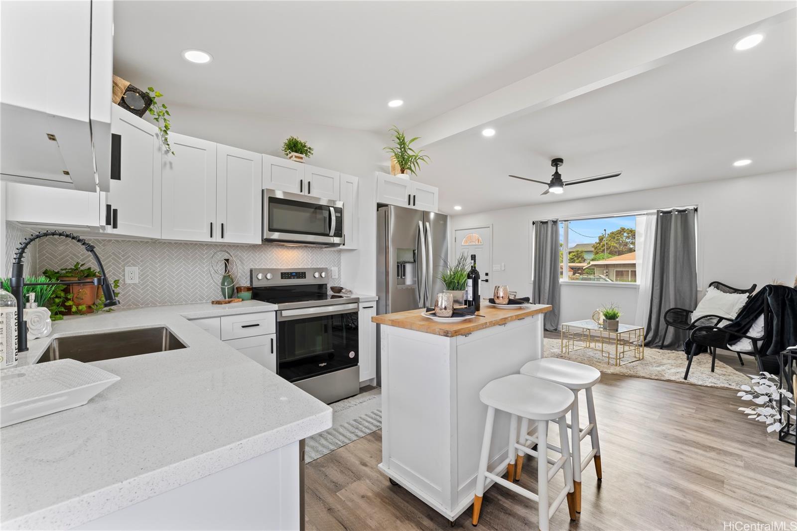 Tastefully renovated three-bedroom, two full bath, single-family home steps from beautiful white sandy beaches. The modern finishes you experience upon entering are a perfect start for a new homeowner to add their personal touches. White shaker cabinets, corian counter tops, laminate flooring throughout, ample storage in the high carport, recess lighting, split AC, and spacious walk-in showers are the highlights of this beautiful home. The decks, which are coming off the master and kitchen, allow you to enjoy the spacious backyard while having your morning coffee. The large yard creates many options for future extension, family gatherings, and many more. The property backs up to a park, so no back neighbors, and also allows a generous stream of breeze to pass through coming from the beautiful Waianae mountain range. Must see to appreciate