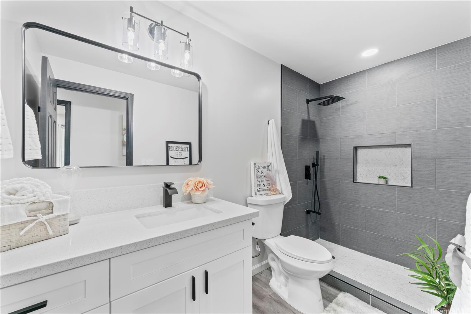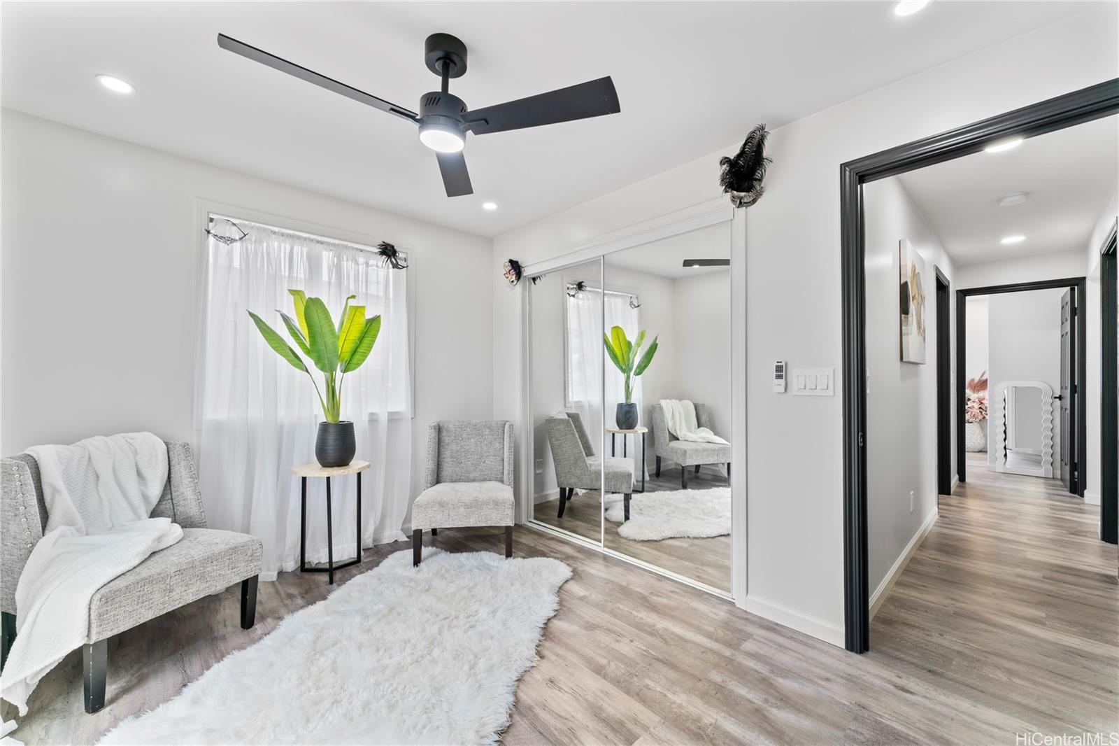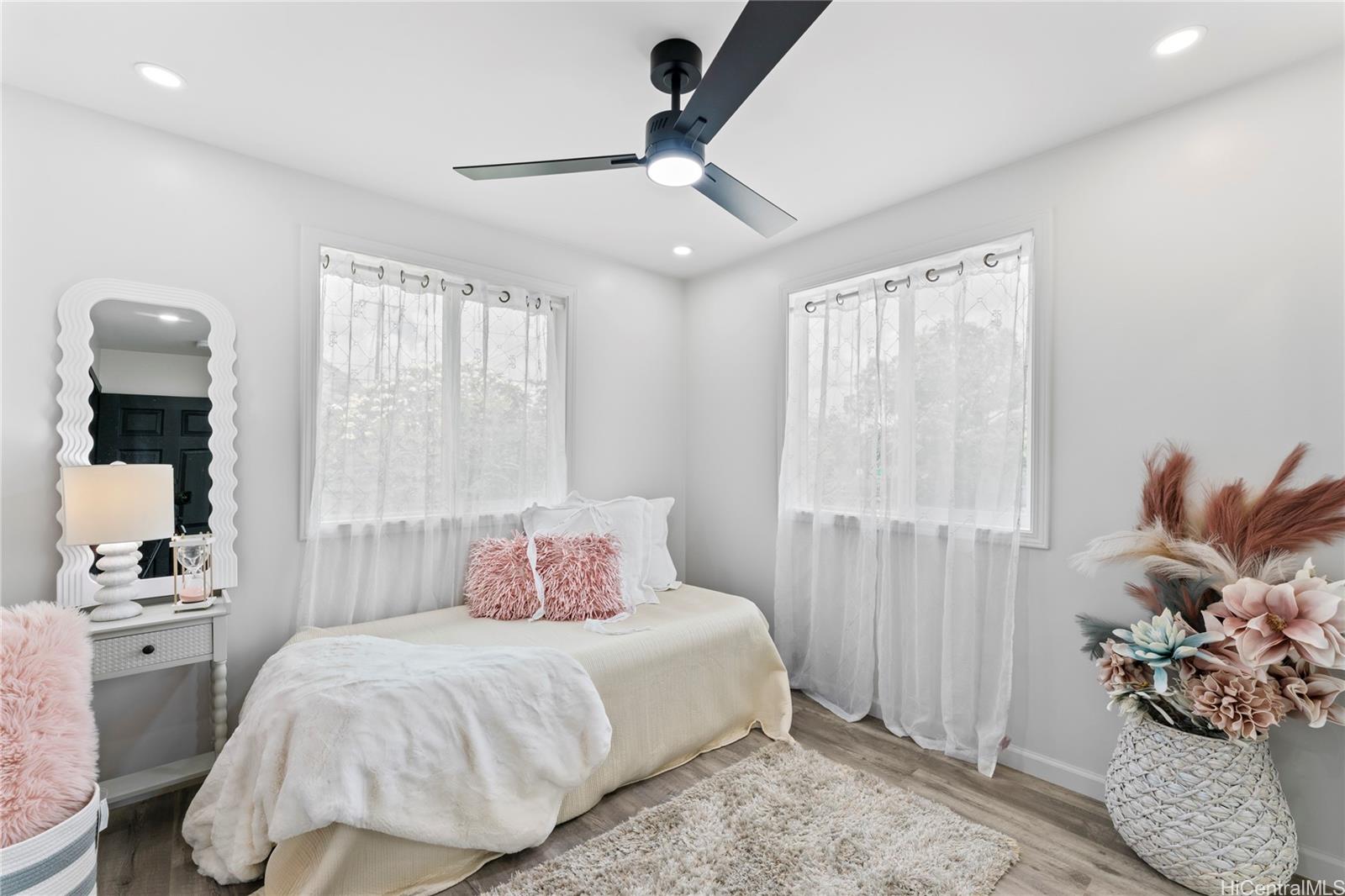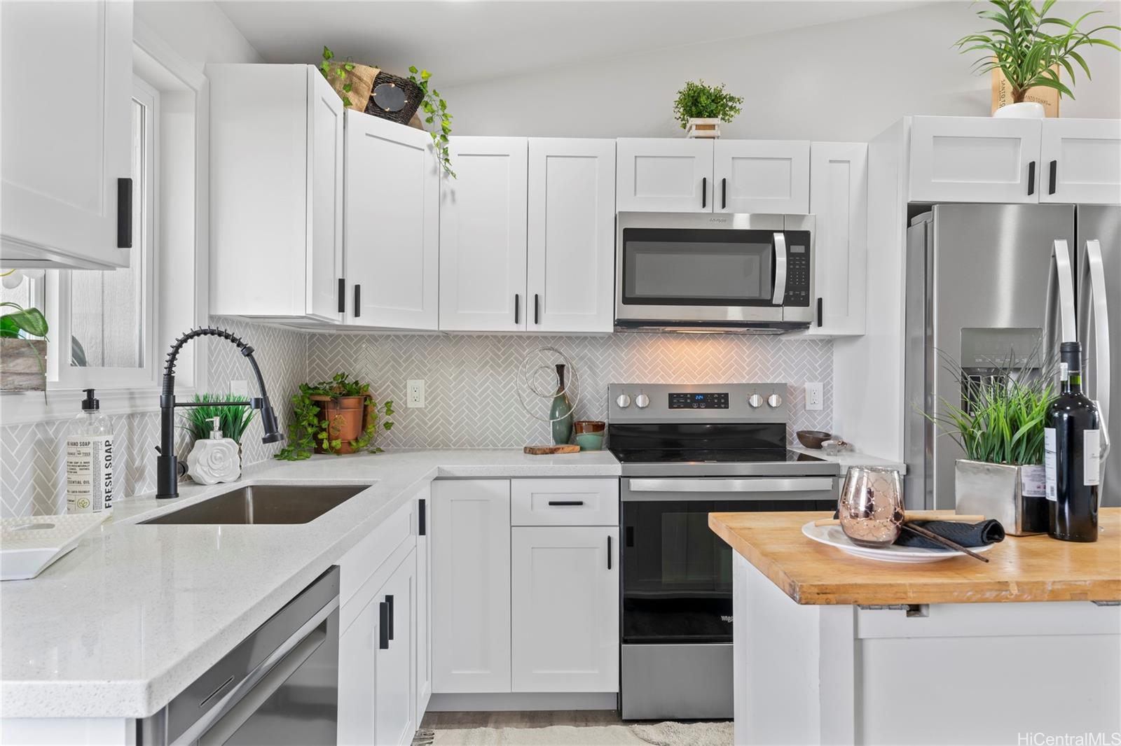 Tastefully renovated three-bedroom, two full bath, single-family home steps from beautiful white sandy beaches. The modern finishes you experience upon entering are a perfect start for a new homeowner to add their personal touches. White shaker cabinets, corian counter tops, laminate flooring throughout, ample storage in the high carport, recess lighting, split AC, and spacious walk-in showers are the highlights of this beautiful home. The decks, which are coming off the master and kitchen, allow you to enjoy the spacious backyard while having your morning coffee. The large yard creates many options for future extension, family gatherings, and many more. The property backs up to a park, so no back neighbors, and also allows a generous stream of breeze to pass through coming from the beautiful Waianae mountain range. Must see to appreciate