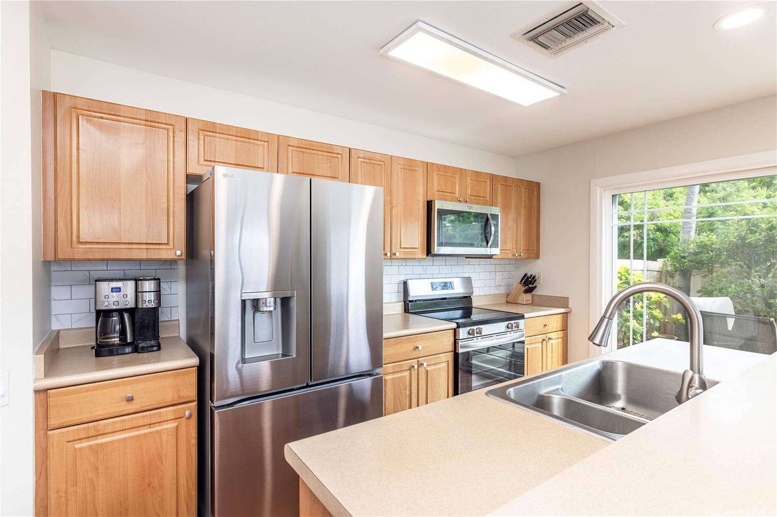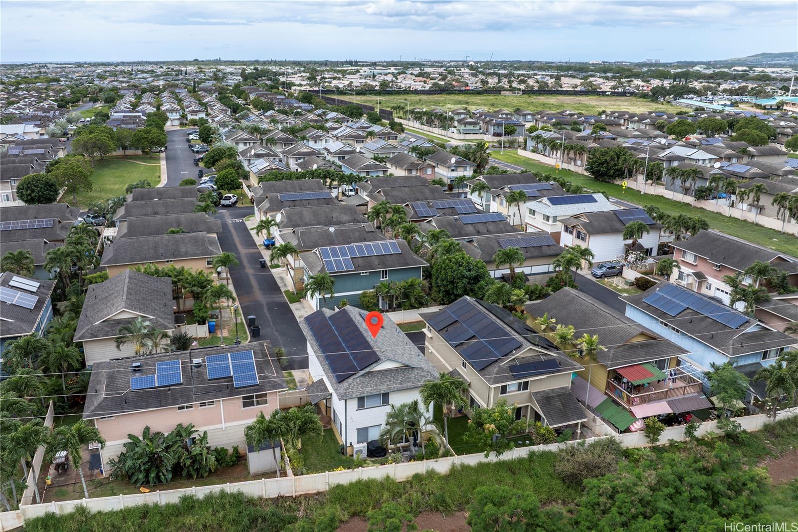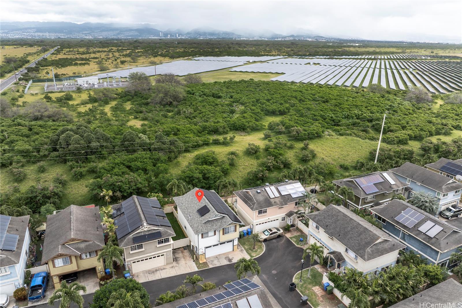 Tucked away on a rarely available perimeter lot in Ewa Gentry, this beautiful home offers the kind of privacy and serenity that is hard to come by. With mature tropical landscaping and a breezy lanai, you’ll love spending time outdoors in your own peaceful oasis. Inside, the open floorplan feels bright and airy, featuring luxury vinyl flooring, fresh paint and new appliances. The large primary suite is a true retreat, complete with peek-a-boo mountain views and a huge walk-in closet. Energy efficiency? Covered. This home comes with a brand new roof, 22 OWNED PV panels, and a Tesla Powerwall—so you can enjoy lower energy bills and peace of mind for years to come. The oversized garage offers tons of space for your cars, toys, or storage, and the location just can’t be beat. You’ll be part of a great neighborhood with a community pool, cabanas, and playground—perfect for relaxing or entertaining. The HOA adds even more value, covering sewer, water, and partial insurance—helping to simplify your monthly expenses. Plus there’s an assumable VA mortgage at just 2.375%! Don’t wait—come see what makes this home so special.