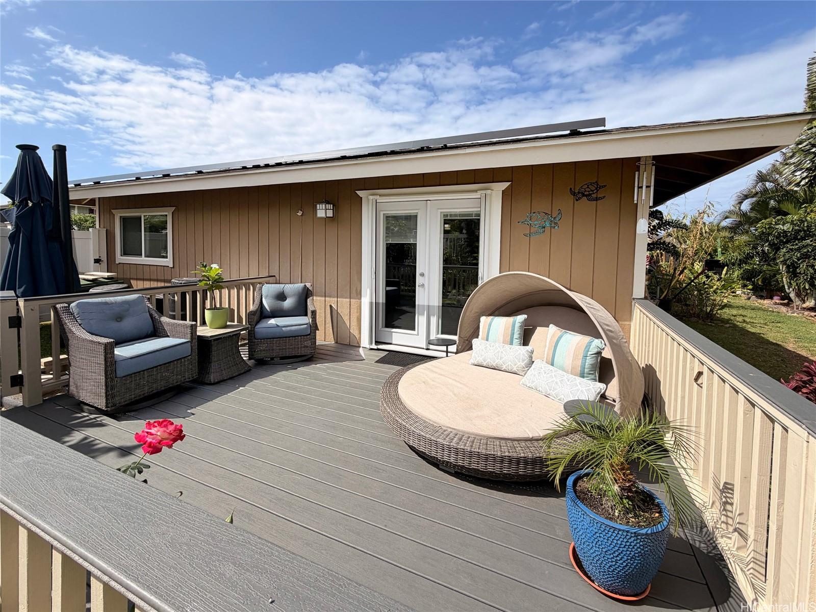 Discover the beauty of island living in this beautifully maintained single-level home located in the exclusive gated community of Makaha Oceanview Estates. Featuring central air conditioning, owned photovoltaic panels, and a fully fenced yard, this property offers comfort, efficiency, and privacy in one of West O’ahu’s most peaceful settings. Step outside to your spacious deck and take in stunning mountain views – perfect for relaxing mornings, evening sunsets, or entertaining friends and family. Inside, the open-concept floor plan seamlessly connects the kitchen, living, and dining areas, creating a bight and welcoming living space. The backyard is a true tropical retreat, featuring an impressive variety of mature fruit trees including bananas, mamey apple, sugar apple, four varieties of mango, longan, starfruit, guava, citrus, jackfruit, papaya, dwarf avocado, lilikoi (passion fruit), and dragon fruit. Located just minutes from world-famous Makaha Beach, enjoy legendary surfing, snorkeling, seasonal whale watching, and unforgettable Hawaiian sunsets. Nearby amenities include Makaha Valley Country Club’s championship golf course and scenic hiking trails.