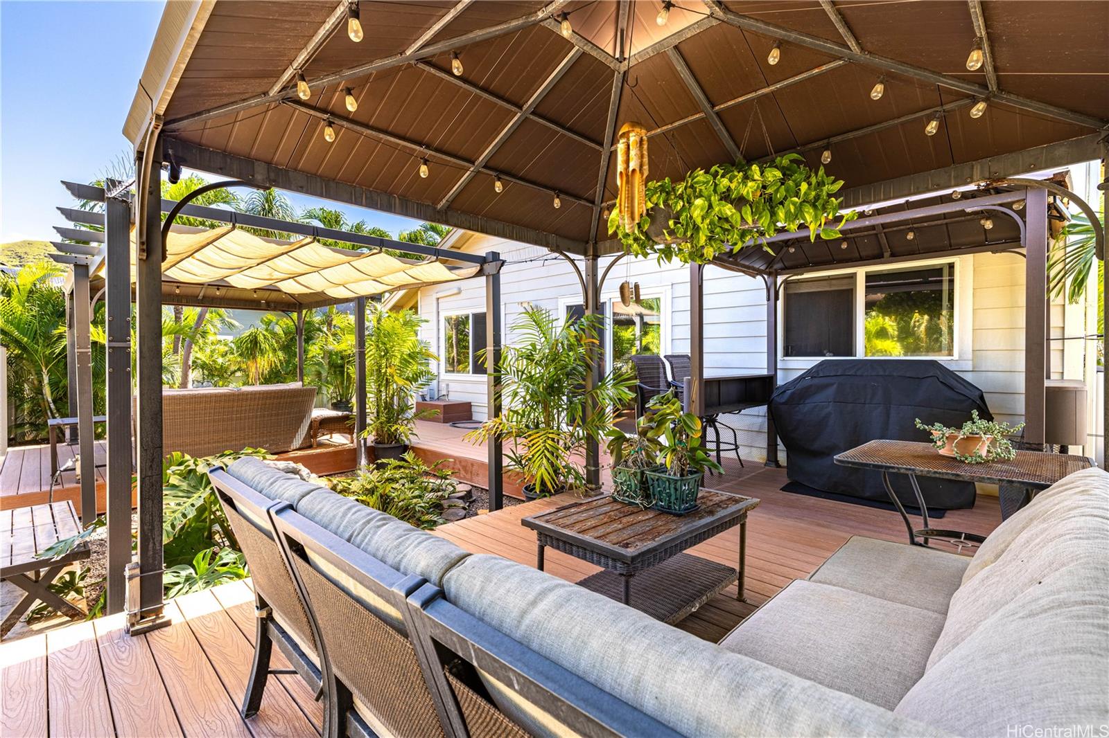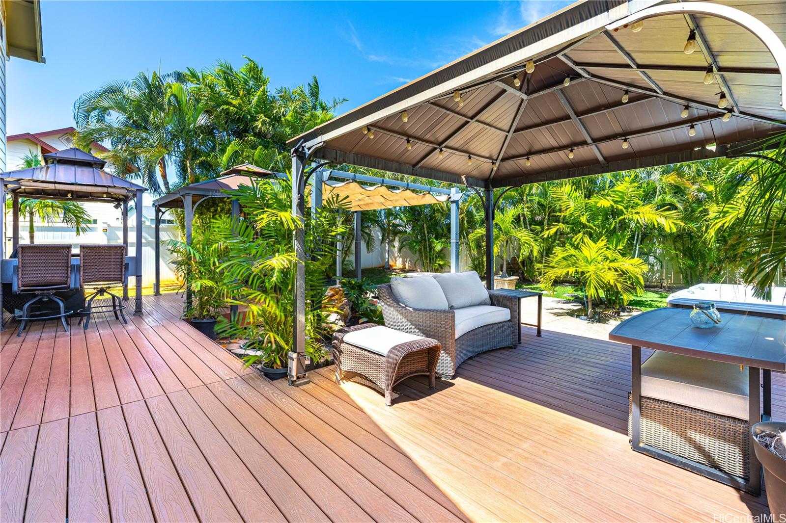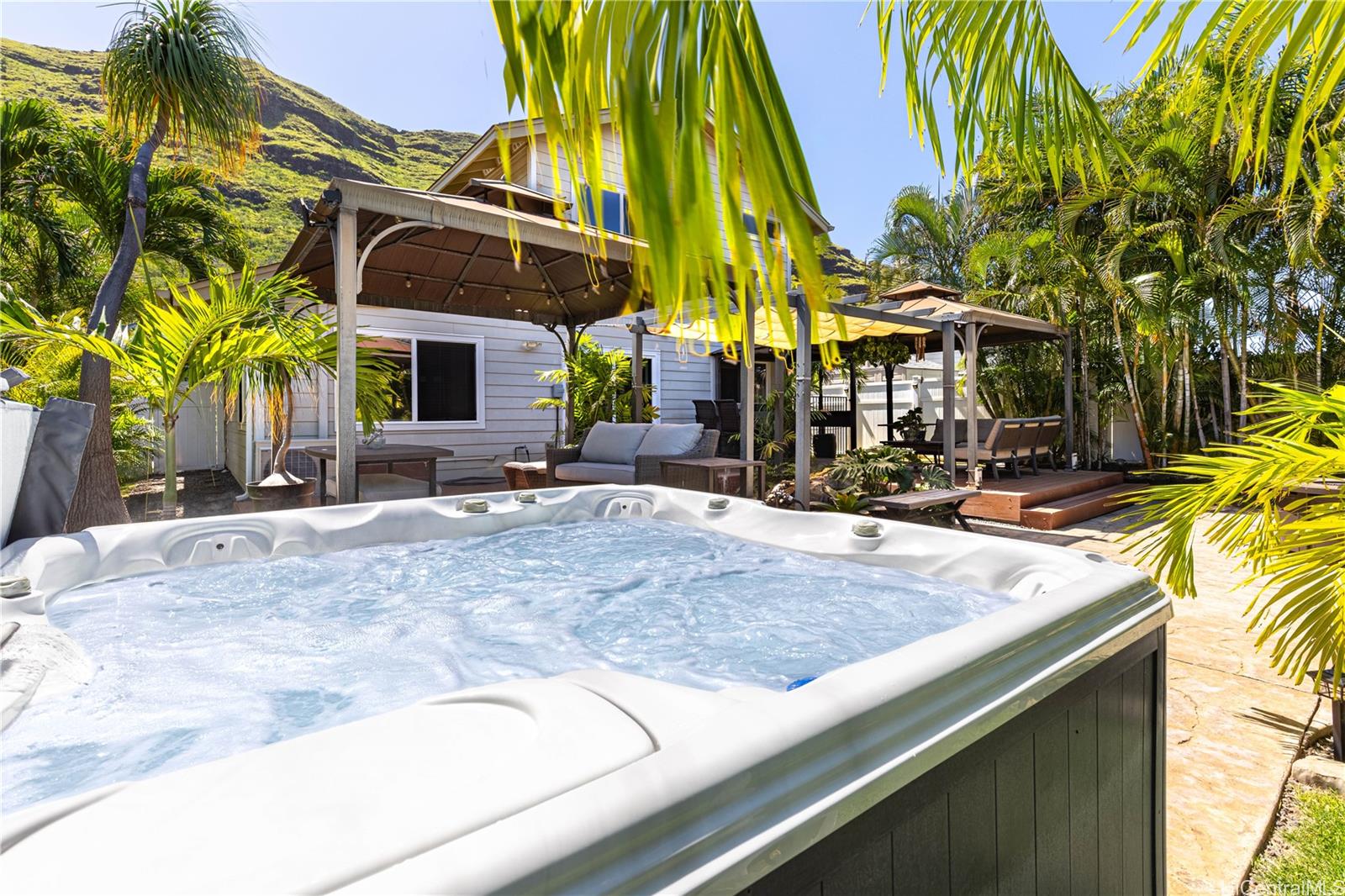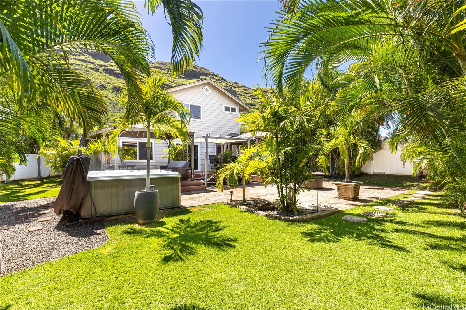 Welcome to your private island retreat! This beautifully maintained 3-bedroom, 2½-bath single-family home sits on a fully fenced 5,850 sq. ft. elevated lot, capturing breathtaking views of the majestic Waianae Mountain Range.Designed with comfort and efficiency in mind, the home features split A/C units throughout and an owned photovoltaic solar system paired with a Tesla battery for significantly reduced electricity costs and added energy security. A gasoline generator is also included for extra peace of mind.Step outside and experience a true resort-style oasis. The expansive outdoor space is thoughtfully designed for relaxation and entertaining, complete with a hot tub, fire pit, mature privacy palms, and all outdoor furnishings included—making this home truly move-in ready. Additional storage sheds provide ample space for tools, equipment, and recreational gear.Whether you’re hosting unforgettable gatherings or enjoying a quiet evening under the stars, this home offers the perfect blend of privacy, comfort, efficiency, and stunning mountain views.