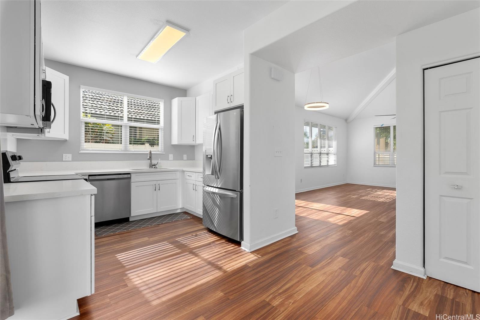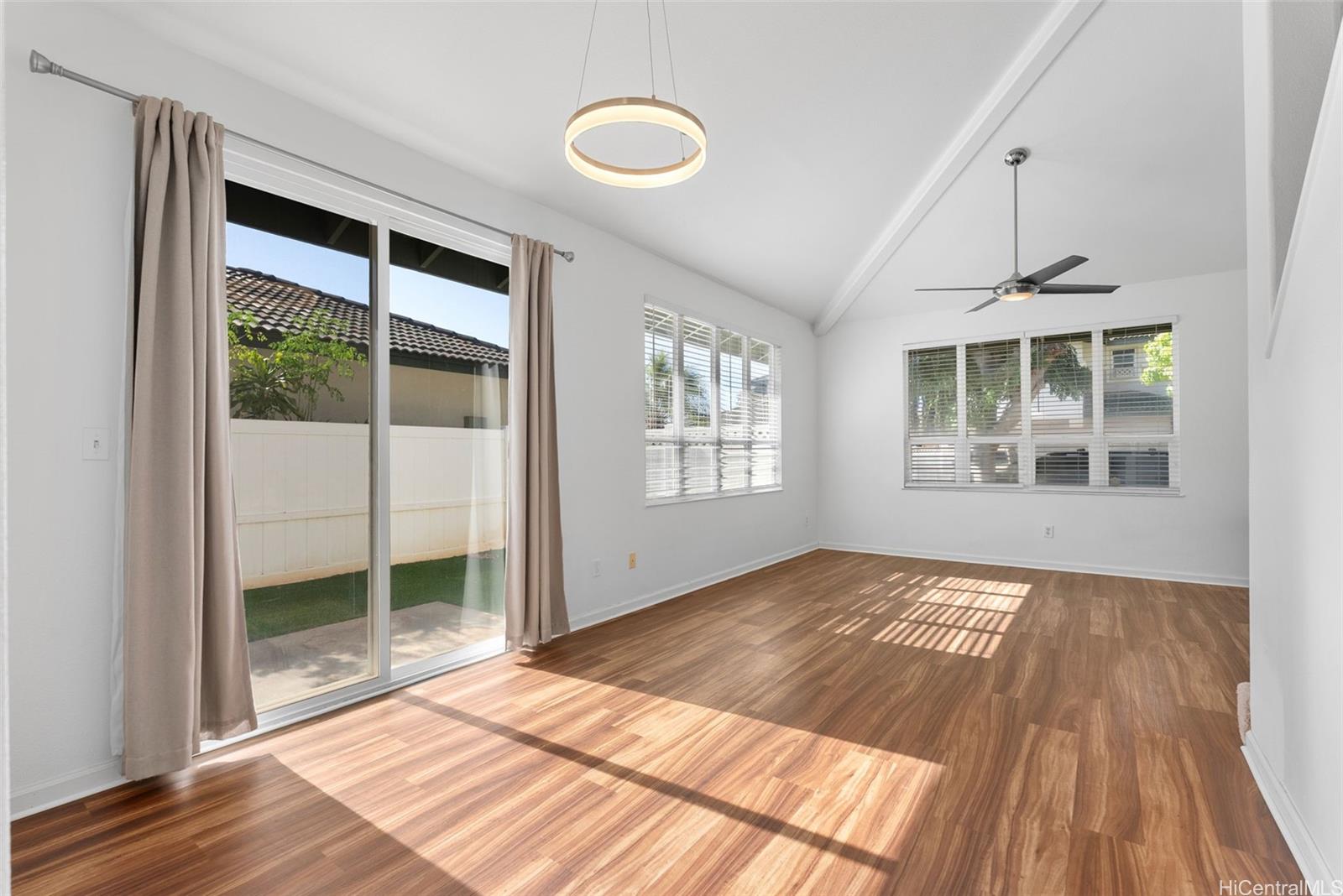 Welcome to this move-in-ready 3-bedroom, 2.5-bath home in Iwalani! Tall ceilings and abundant natural light create a warm, inviting atmosphere. Enjoy the fully upgraded kitchen with cabinetry, quartz countertops, and modern appliances. Relax on either of two lanais, or retreat upstairs to three comfortably sized bedrooms, including a primary suite with a beautifully remodeled ensuite featuring dual vanity and a walk-in shower. Additional perks include a solar water heater and 2-car garage. Across the street is a playground, with Kapolei Community Park and the Villages of Kapolei Recreation Center nearby, offering pools, courts, ball fields, fitness areas, and party halls. Within 3.5 miles are Costco, Kapolei Commons, and Ka Makana Ali‘i for shopping and dining. For a minimal fee, you can join the recreation center. Villages of Kapolei also offers private parks, walking and bike paths, and open green spaces. Easy highway access takes you to the rest of Oahu. No maintenance fees, only $53/month HOA. A few photos have been virtually staged(enhanced).