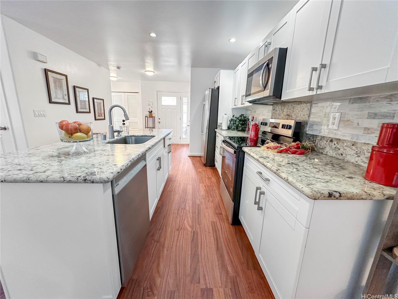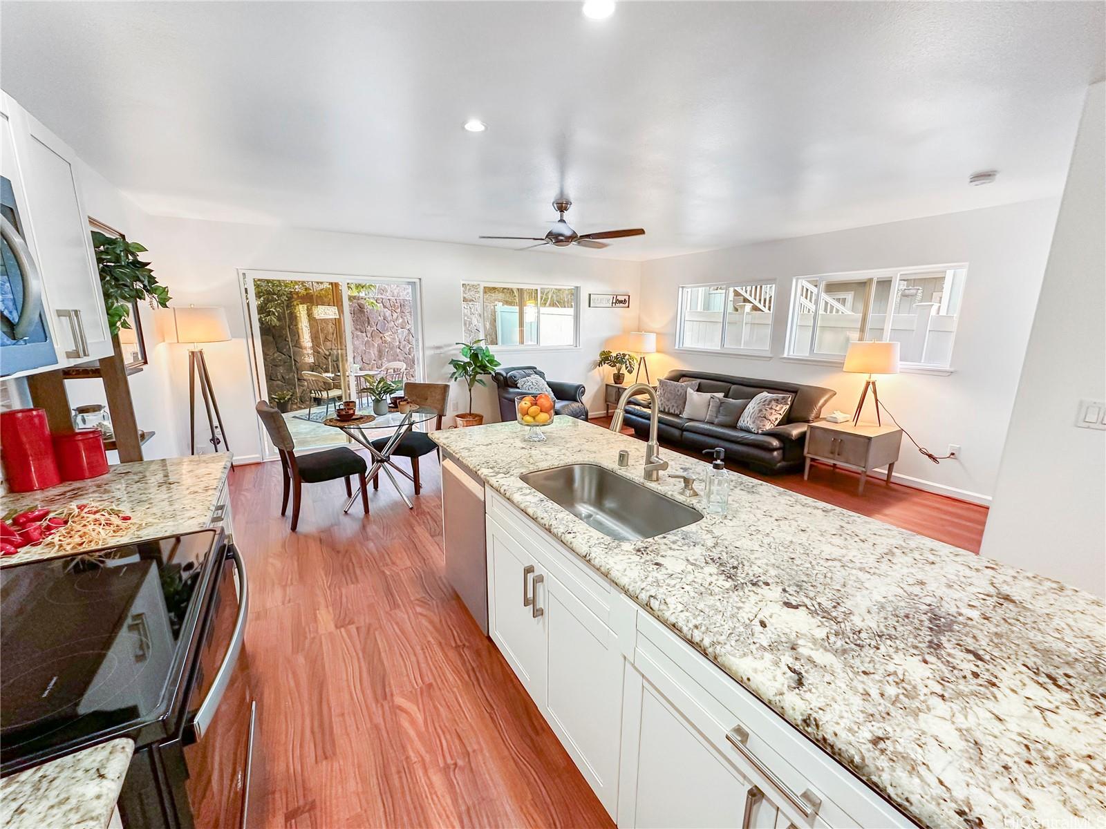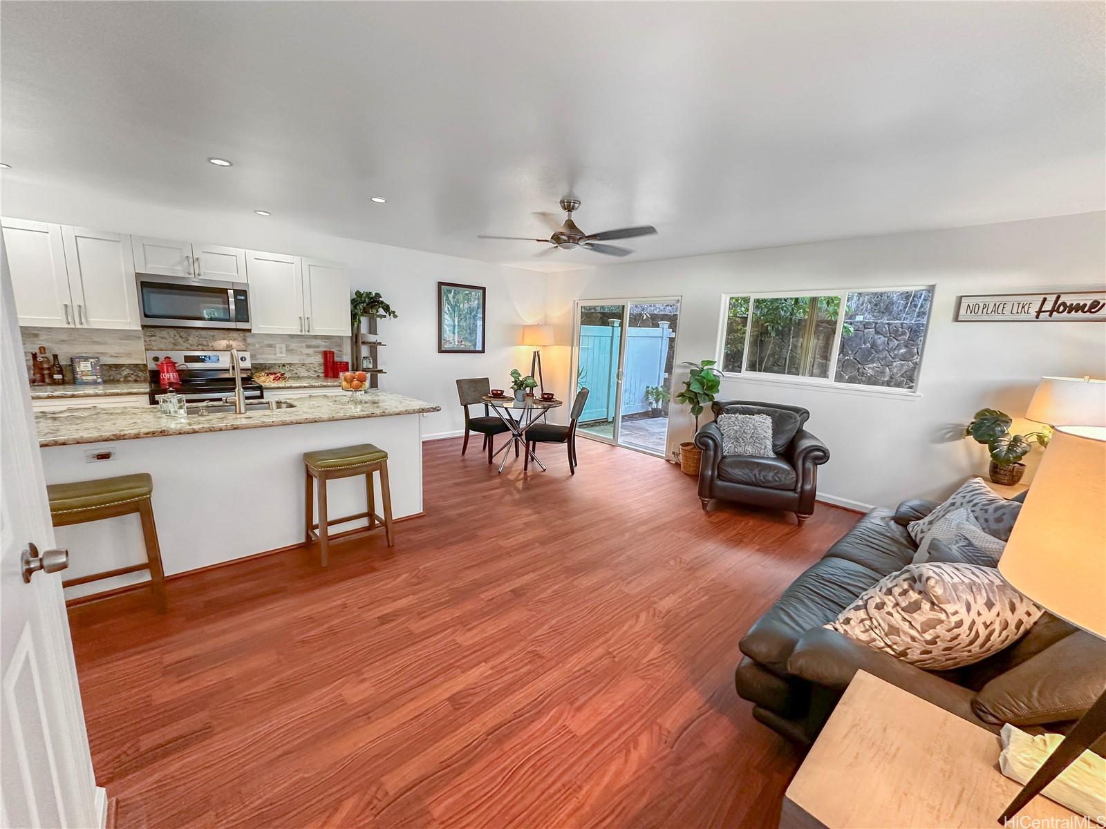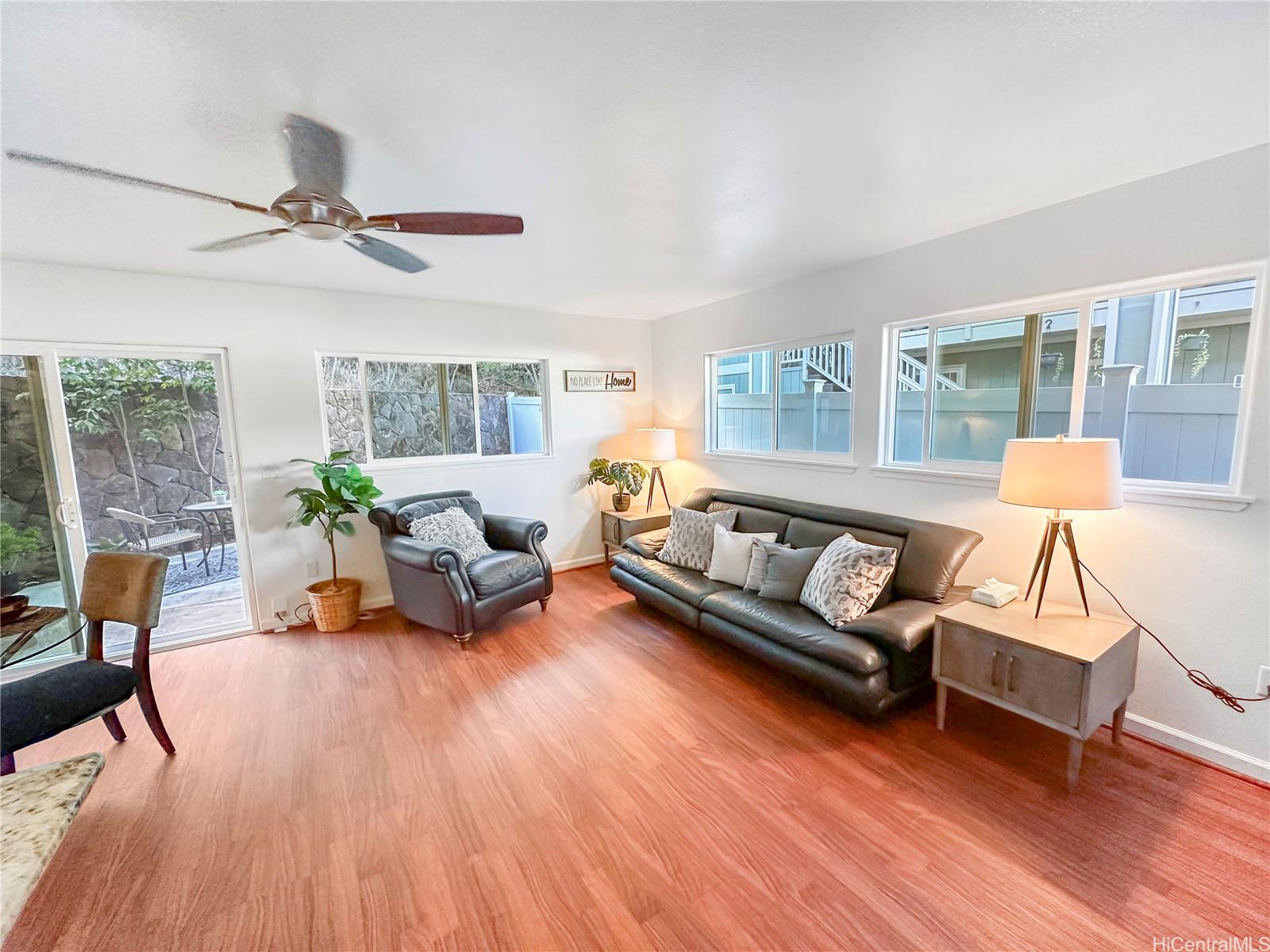 Price Drop $27K See is you qualify for this low HOA fee home. In almost new condition- recent updates. This stunning, like-new 3-bedroom, 2.5-bath duplex in the desirable Robinson Heights of Waipahu. Built in 2016, this two-story home features an open floor plan with an abundance of windows to bring in natural light. Enjoy modern living with ceramic tile, new luxury vinyl planks on the entire lower level, upper hall, and primary bedroom, as well as Koa laminate flooring on the stairs and in two of the bedrooms. Each room also has a ceiling fan. The kitchen boasts a new stainless steel appliance package and stone counters. The kitchen breakfast bar is a nice addition to the dining options. Tucked away on a quiet cul-de-sac, this home offers mountain views, a one-car garage, and NO maintenance fees, only a single low association fee. Ideal for 1st time buyers or those seeking a move-in property with investment potential. Conveniently located near schools, parks, and shopping. A private fenced backyard, with just enough room to start a garden. Seller is participating in a 1031 exchange at no cost to the buyer. Easy to show on short notice, most days. Open House Nov 30 2-4pm