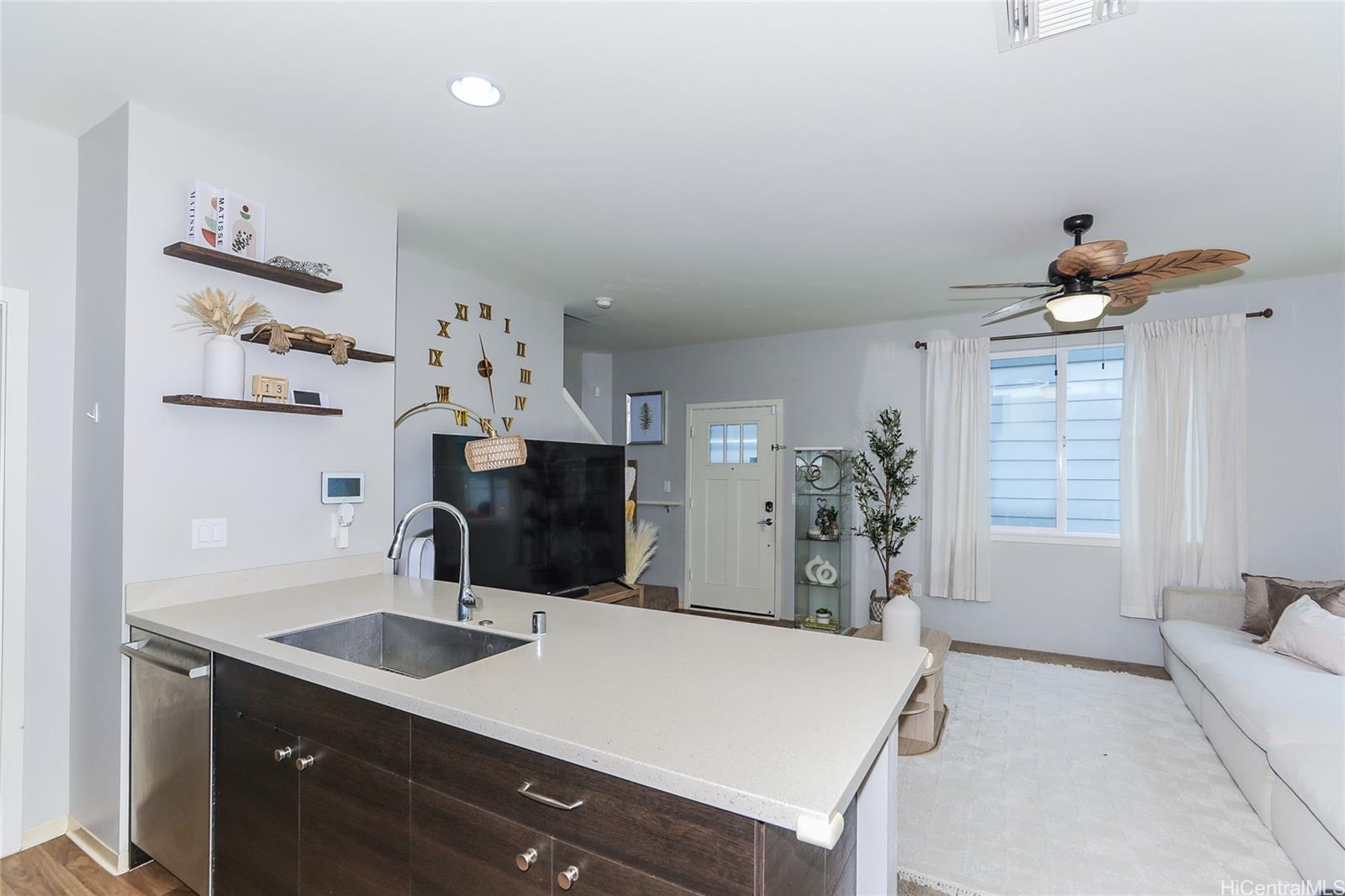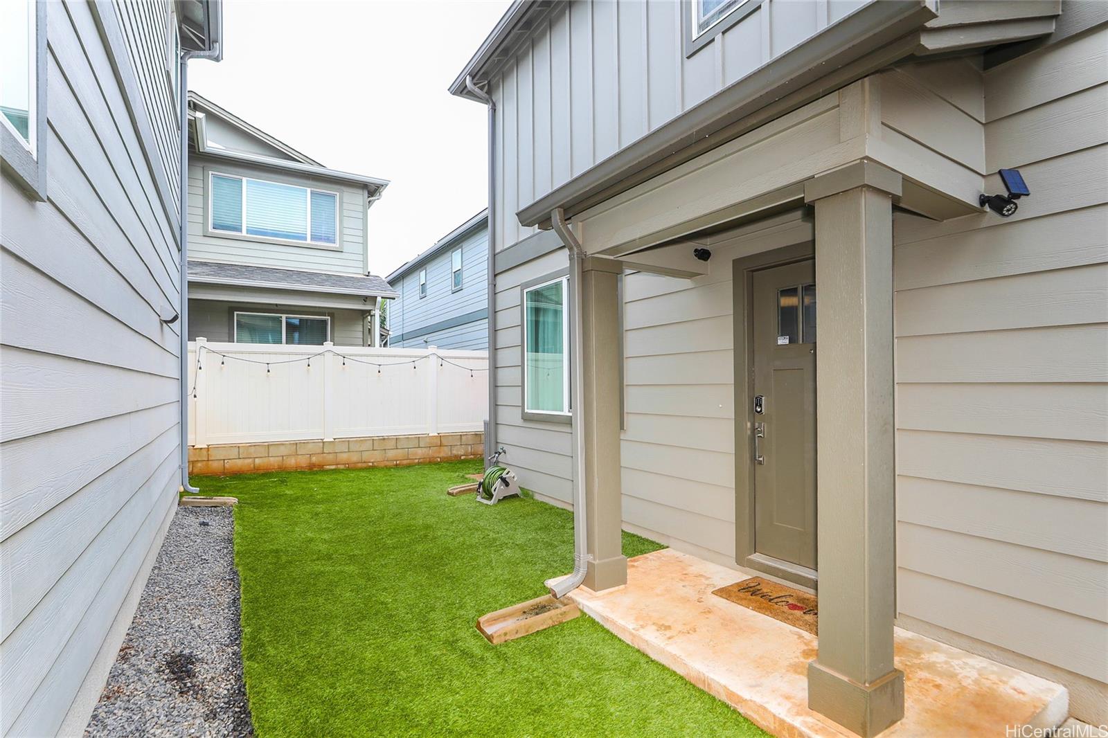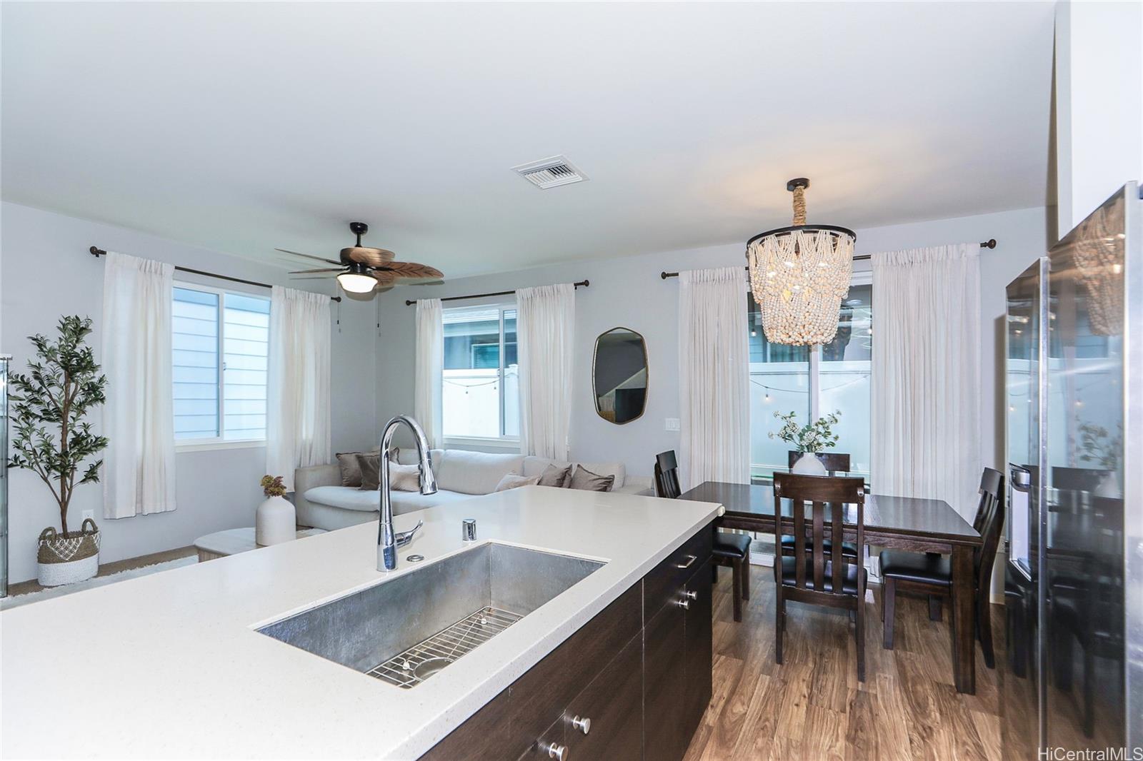 VA ASSUMABLE at 3.1% RATE! This stylish contemporary home showcases an innovative open-concept layout, complemented by a modern kitchen and updated bathrooms. The fully fenced yard with a lanai create the perfect setting for entertaining, relaxing, or accommodating pets. Additional highlights include central air conditioning, solar water heating, rain gutters, and more. The property offers a two-car garage plus a third parking space, along with ample guest parking. Conveniently located near schools, parks, and golf courses, this home is just minutes from shopping, dining, and entertainment. You’ll also appreciate its close proximity to the beautiful Ko Olina lagoons and the stunning beaches along Oahu’s leeward coast.