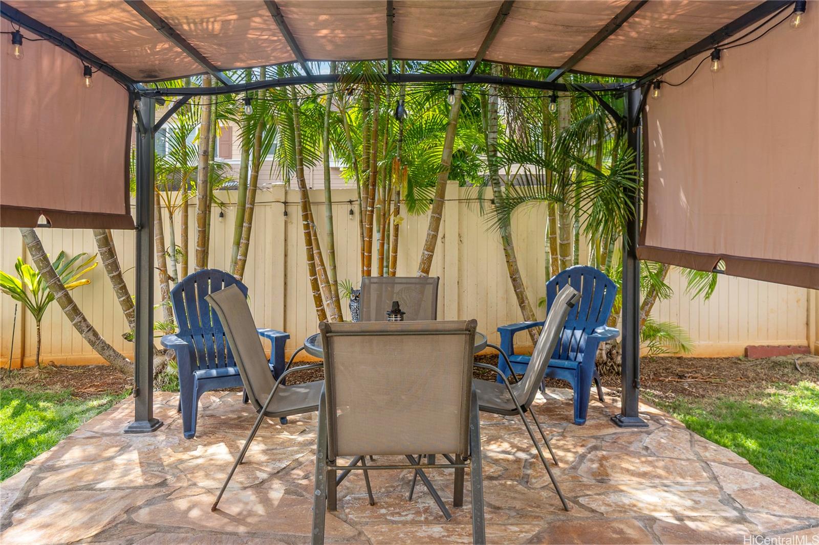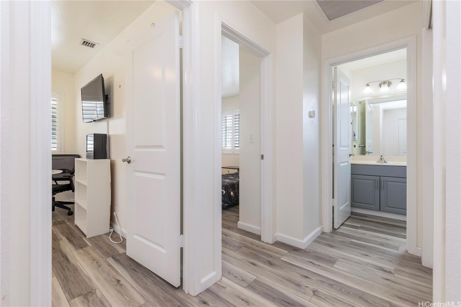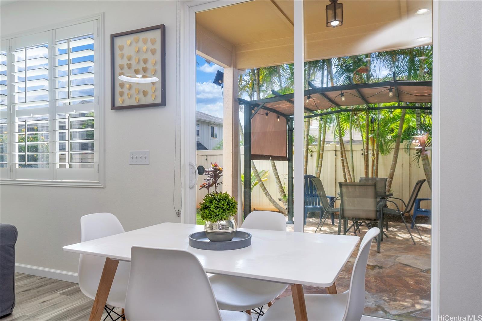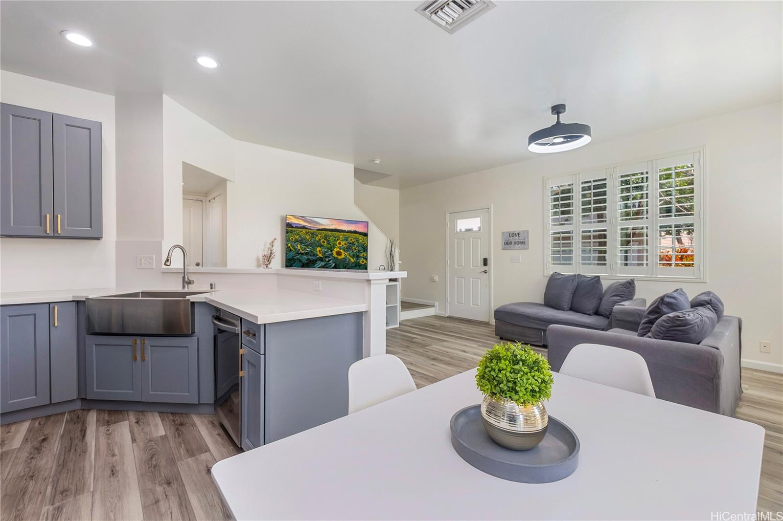 Move in ready home in one of the best locations within Laulani-Tides at Ewa Gentry. Enjoy open views with no home directly behind, offering added privacy. This beautifully remodeled 3 bedroom, 2.5 bath residence features an attached 2 car garage plus a large driveway accommodating two additional vehicles. Recent upgrades completed in 2023 to 2024 include all new kitchen cabinets, quartz countertops,and stainless steel appliances. Stylish plantation shutters and low maintenance luxury vinyl plank flooring run throughout the home. The spacious primary suite offers dual vanities and a large walk in closet with an upgraded closet system. Energy efficient features include a 16 panel leased photovoltaic system with backup battery, a central A/C system replaced in 2021, and a solar water heater installed in 2020. One of the larger fenced yards in the development provides excellent outdoor space for relaxing or entertaining. Conveniently located near parks, shopping, restaurants, beaches, and more. Community amenities include a pool and BBQ area. Truly move in condition and a must see opportunity. One or more photos have been virtually enhanced.