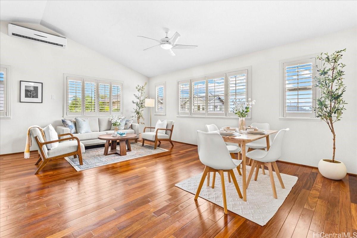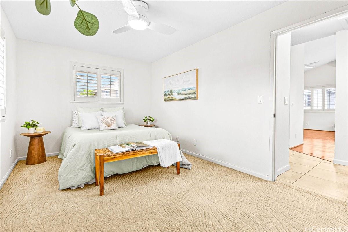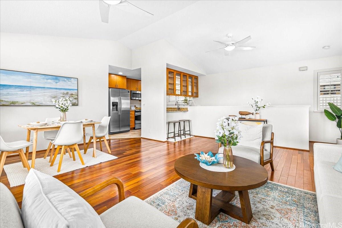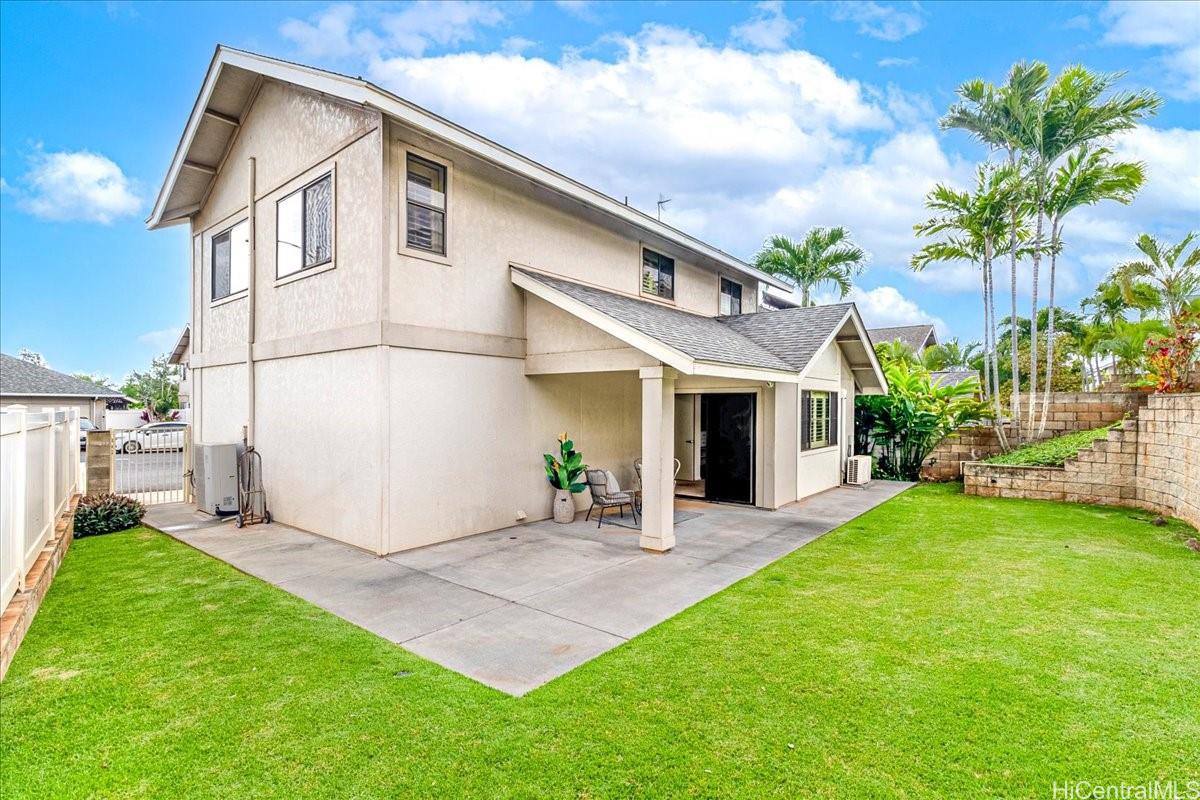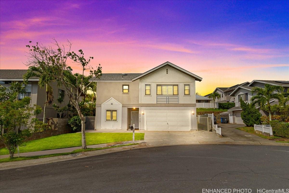 Experience elevated island living in this lovingly cared for 3-bedroom, 2-bath home tucked into a peaceful Royal Kunia cul-de-sac. This two-story retreat features a thoughtful layout with two bedrooms and a full bath on the main level for comfort and privacy. Upstairs, the primary bedroom opens to a bright kitchen with granite countertops, while the living room shines with beautiful hardwood floors and plantation shutters that bring in soft, airy light. Fresh, clean, and truly move-in ready, this home shows pride of ownership throughout. Outside, the beautifully landscaped and fully gated yard offers the perfect place to unwind after a long day- quiet, breezy, and made for easy island evenings. With Royal Kunia’s prime location near shopping, dining, parks, schools, and freeway access, you get convenience wrapped in community charm. Homes like this don’t linger – come see it, feel it, and imagine your next chapter here.