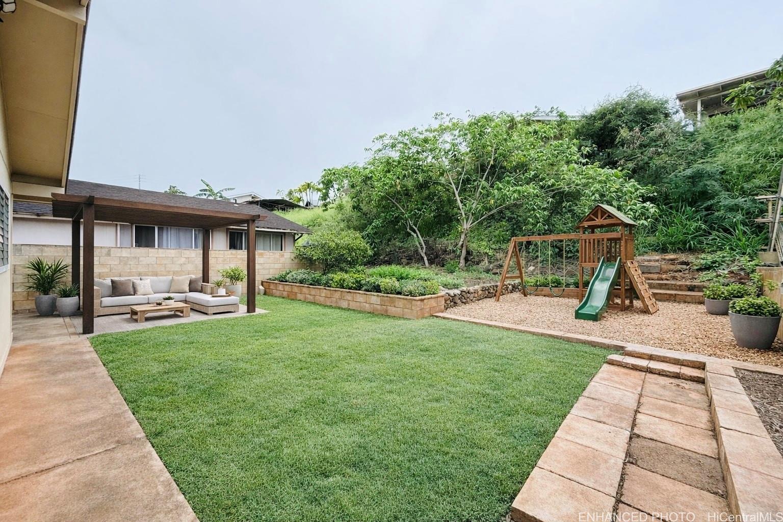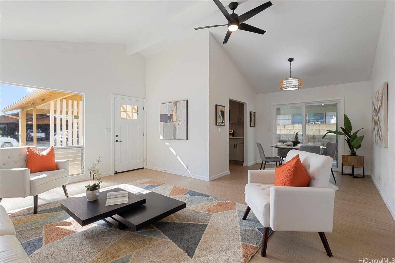 Step into this completely renovated Village Park home in Kunia, where modern comfort meets location convenience! Every detail has been updated – from the stylish kitchen and bathrooms to fresh flooring and paint – so all you need to do is move in! Relax on your private lanai off the dinning area, enjoy the quiet neighborhood, and take advantage of the central location close to shopping, dinning, and easy access to commuting routes H-1 freeway East & West. A great fit for first-time buyers, those ready to upgrade, or anyone looking for a move-in-ready home, this one truly checks all the boxes!The backyard offers a wonderful opportunity to create your own outdoor living space. While mature trees provide natural shade & privacy, the area has been thoughtfully left for buyers to design a personalized garden, entertainment area, or play space.Features: Fully renovated kitchen with new appliances, cabinetry, countertops, backsplash tile, and sink. Tastefully updated bathrooms with new vanities, toilets, and mirrors. New flooring & fixtures throughout. New split A/C in living room. New washer/dryer.Virtual tour available – click the Virtual Tour link for video walkthrough.