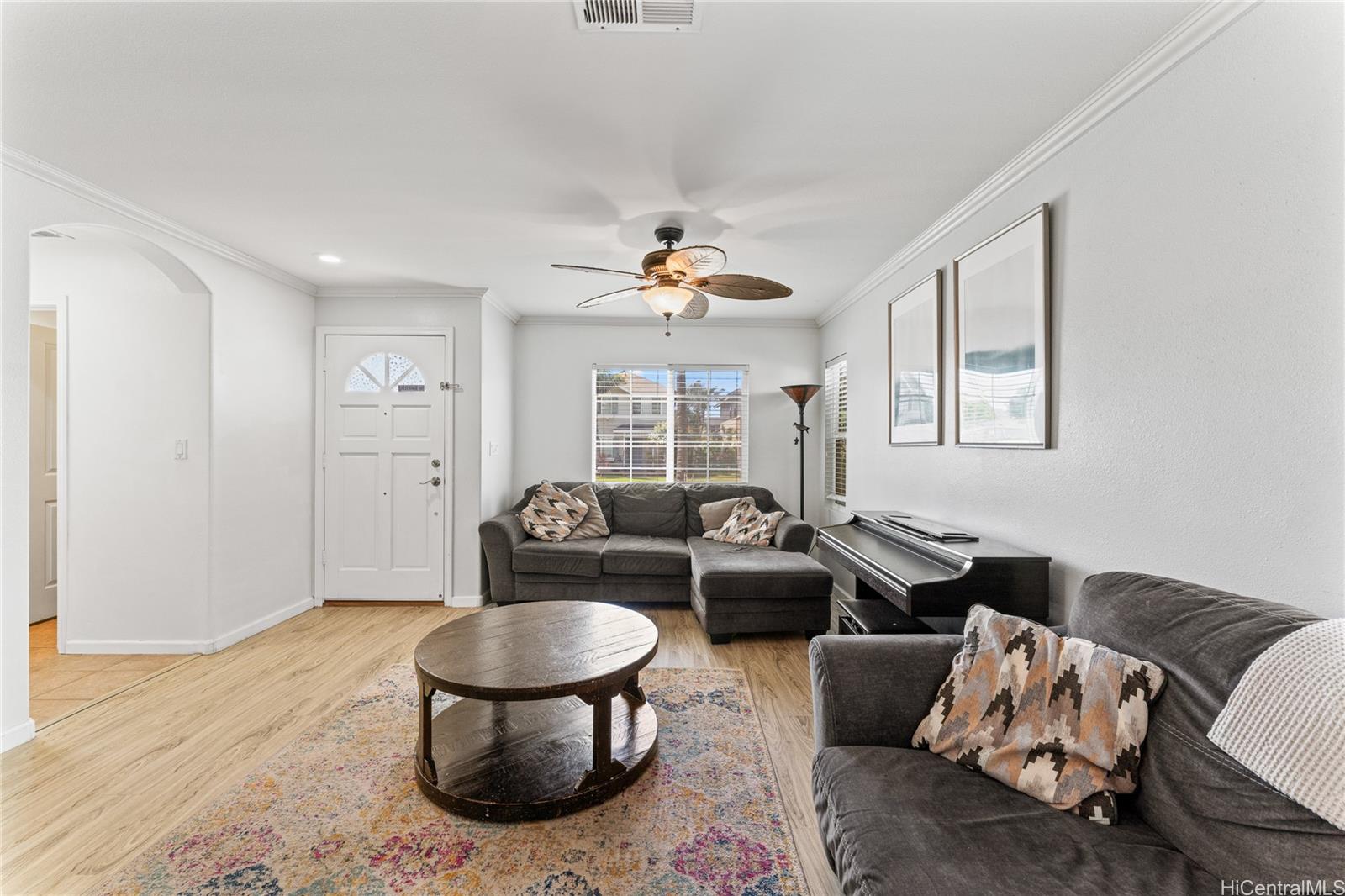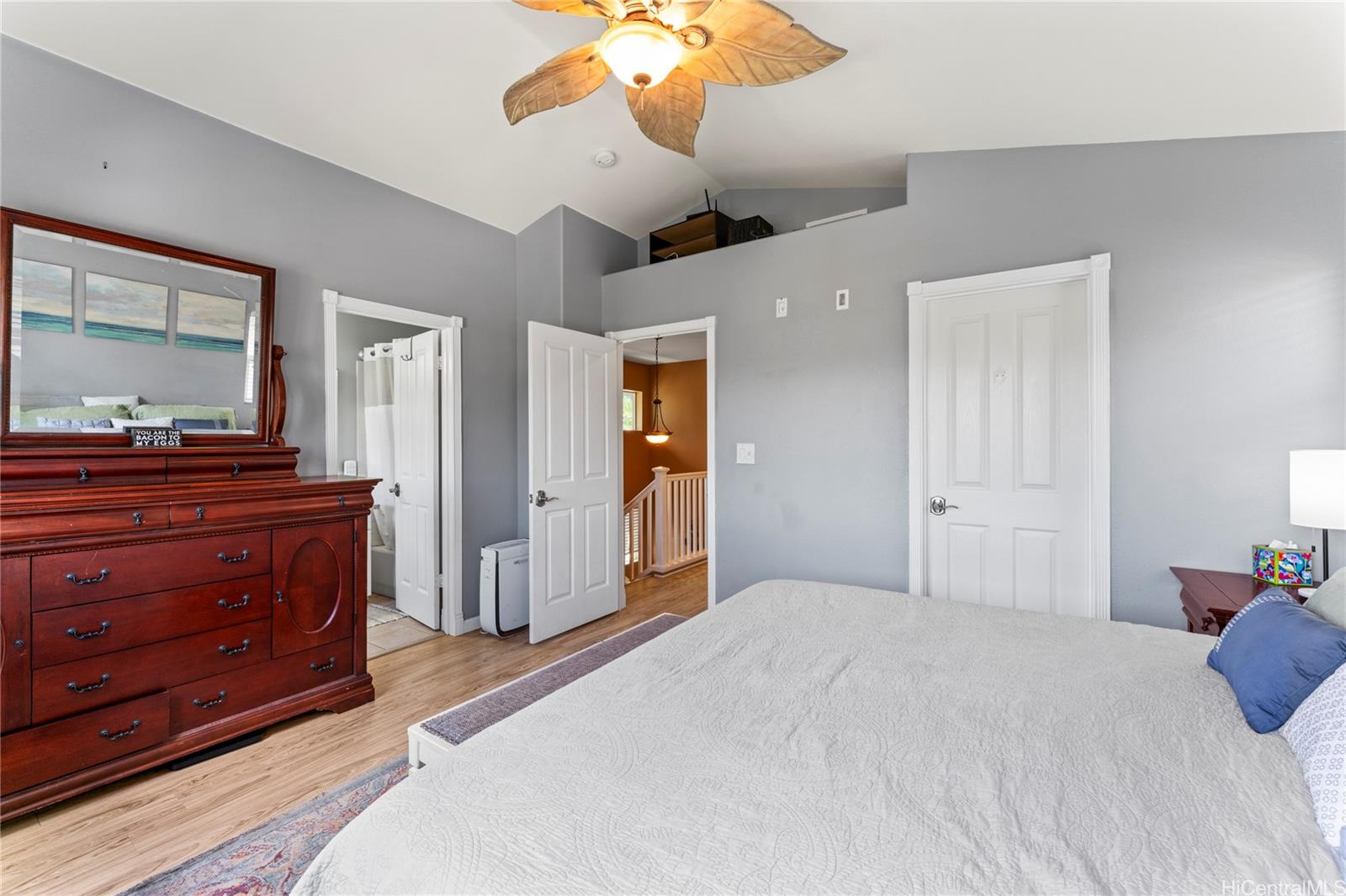 Enjoy the benefits of 16 owned solar panels and central air conditioning, helping to keep energy costs down while maintaining year-round comfort. The kitchen is designed for both function and style, featuring wood cabinets, stainless steel appliances, and huge pantry for your Costco haul. Dining area located just off the kitchen creates a flow for everyday living and gatherings. Home also features a water softener and filtration system.VA assumable loan with Freedom Mortgage, 2.25% interest rate, $2986 monthly payment, approximately $590,000 remaining balance. (Veteran with COE only)Step outside to a covered lanai, perfect for relaxing or hosting get-togethers while enjoying your landscaped backyard leading to your two car garage. Inside, vinyl plank flooring runs throughout the home. Spacious primary bedroom features a vaulted ceiling, large walk-in closet, and views of the landscaped yard, creating a peaceful retreat.Two additional bedrooms upstairs, one of which includes a full-size Murphy bed and closet organizer, offering flexible space for guests, or home office.*School zone obtained using Hawai’i DOE school finder website, Buyer to verify.