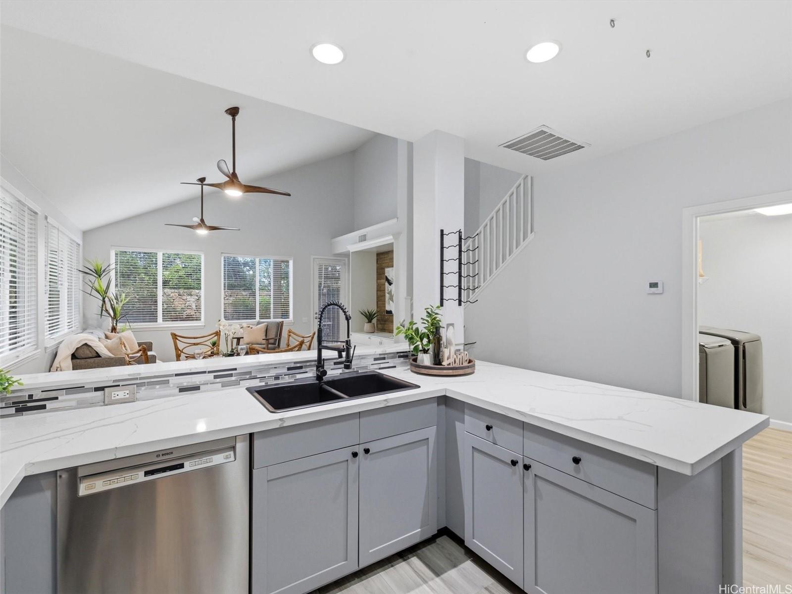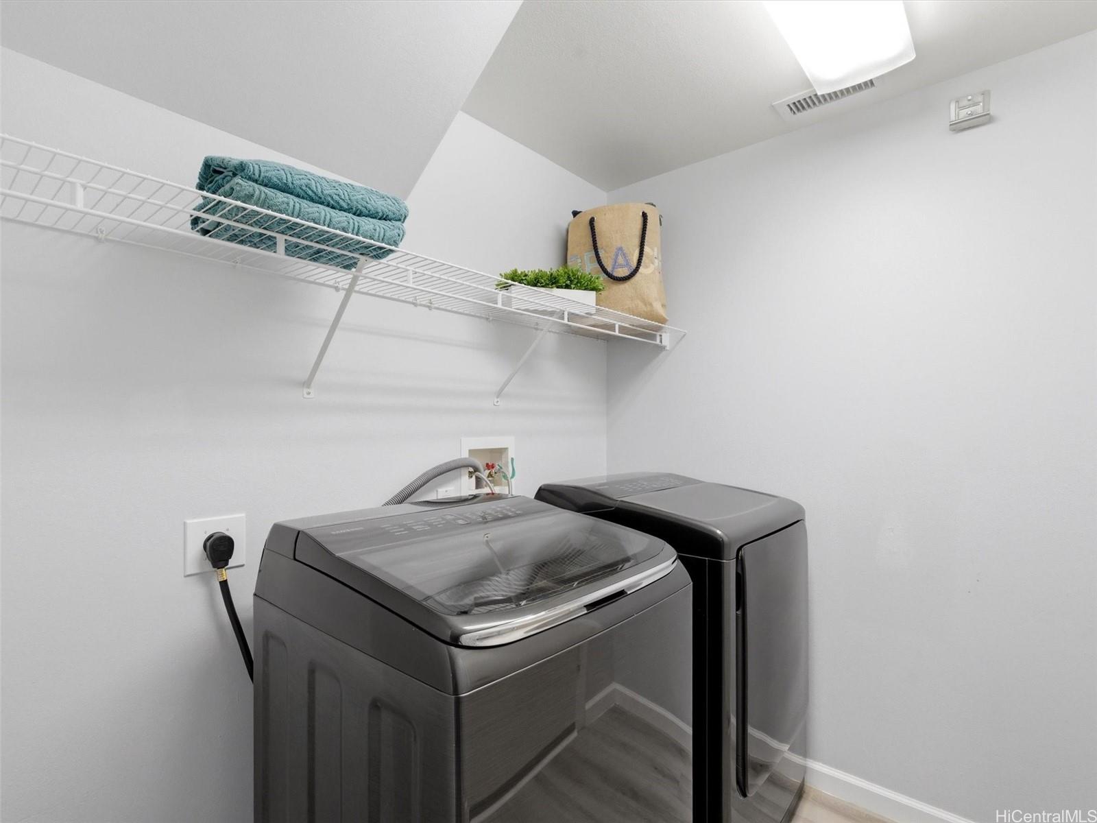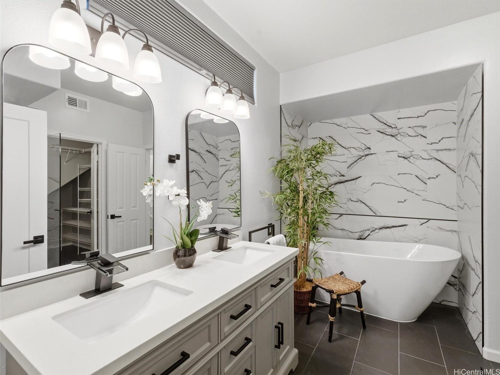 VA ASSUMABLE LOAN of 4.5% to qualified VA buyers.Welcome to elevated island living in the gated community of Hu’elani in Ewa Beach. Situated on a prime corner lot, this pristine, modernly renovated 3-bedroom, 3-bath home offers flexibility and style. Two bedrooms and two full baths are conveniently located on the ground floor, ideal for guests or multigenerational living. Upstairs, a spacious bonus area provides endless possibilities. The contemporary kitchen opens seamlessly to a spacious living area and flows out to a covered lanai and beautifully manicured garden, creating effortless indoor-outdoor living. A rare long driveway provides additional parking and enhanced privacy. Adding even more value are 10 owned solar panels and a solar water heater, helping to significantly reduce monthly electricity costs and improve energy efficiency. Residents enjoy resort-style amenities including a clubhouse, covered BBQ and dining areas, community pool, fitness center, and walkable sidewalks throughout. A safe, welcoming neighborhood where neighbors connect and children play freely.