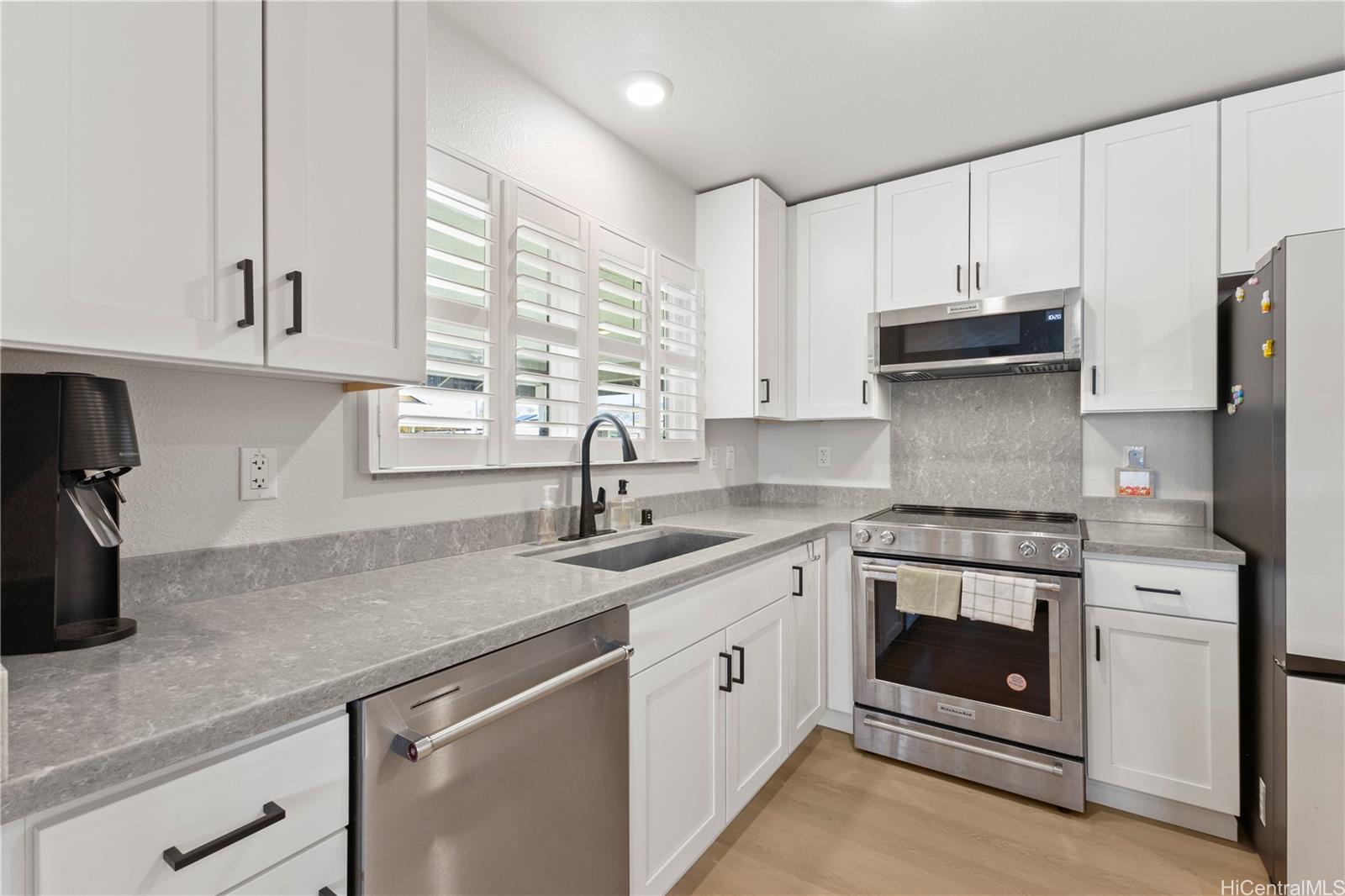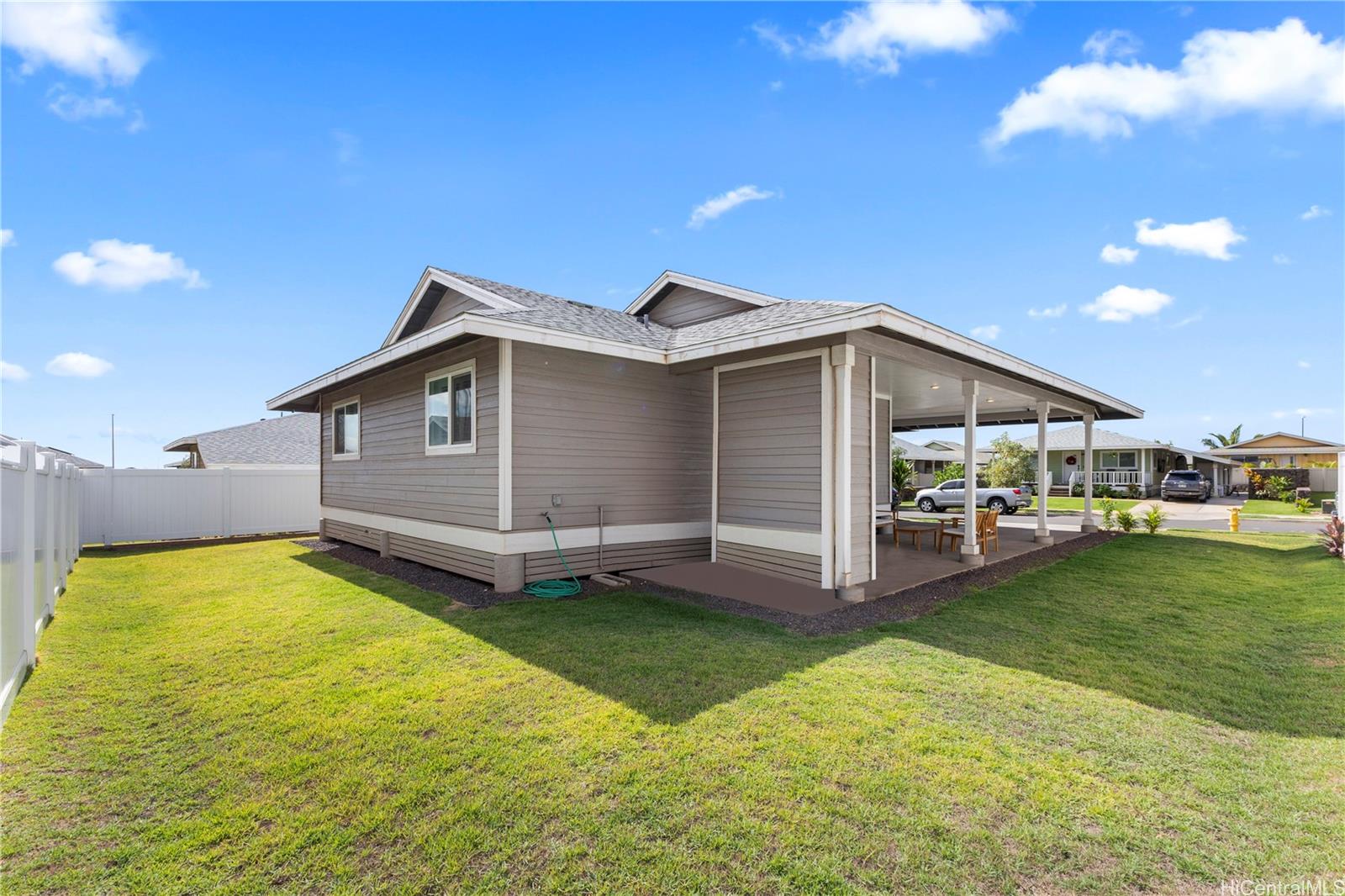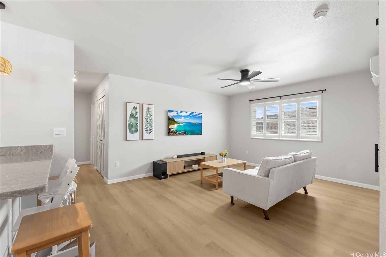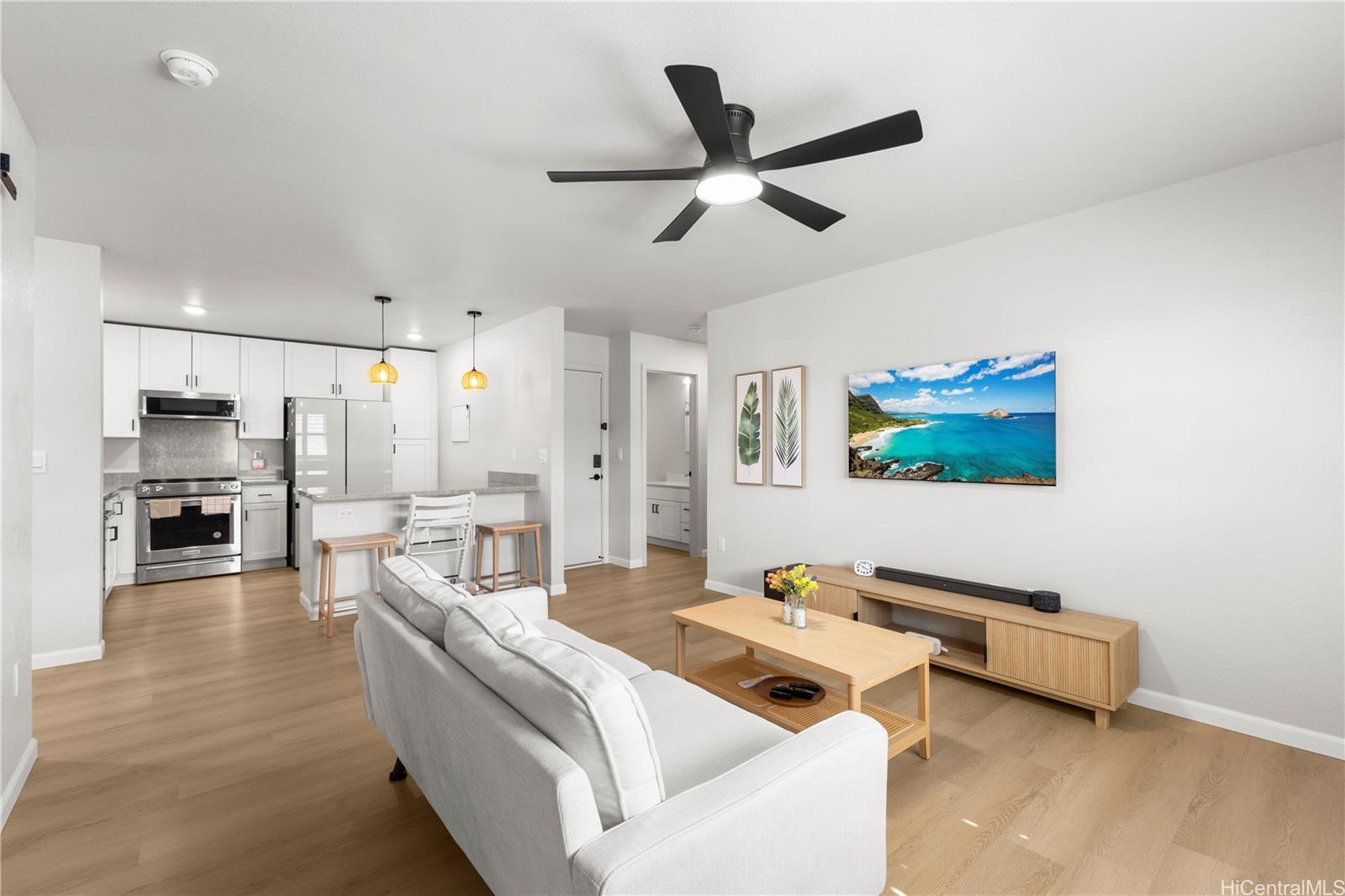 Experience the perfect blend of island charm and modern luxury. Located in one of Hawaii’s most desirable communities, this beautifully designed home pays tribute to Old Ewa Village’s plantation-style heritage while offering every modern convenience. Built just over two years ago, it welcomes you with an expansive carport, inviting lanai, and stunning curb appeal. Inside, enjoy fresh interior paint, new luxury vinyl plank flooring with modern baseboards, and custom plantation shutters on every window. Split A/C units in each room ensure year-round comfort, while the kitchen shines with pendant lighting above the island, an upgraded refrigerator, and designer finishes. Every detail has been elevated, from added overhead lighting and a ceiling fan in the living area to a hidden TV outlet for a clean, polished look. Smart-home features include a 360° security camera system and keyless entry. Fully paid solar panels and a Tesla battery provide energy efficiency and peace of mind. Perfectly located near parks, the community center and pool, and the new rail line—this move-in-ready home embodies modern Hawaiian living at its finest.