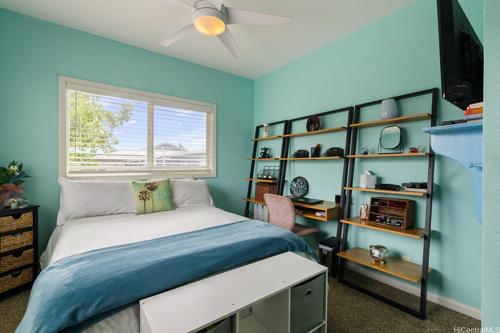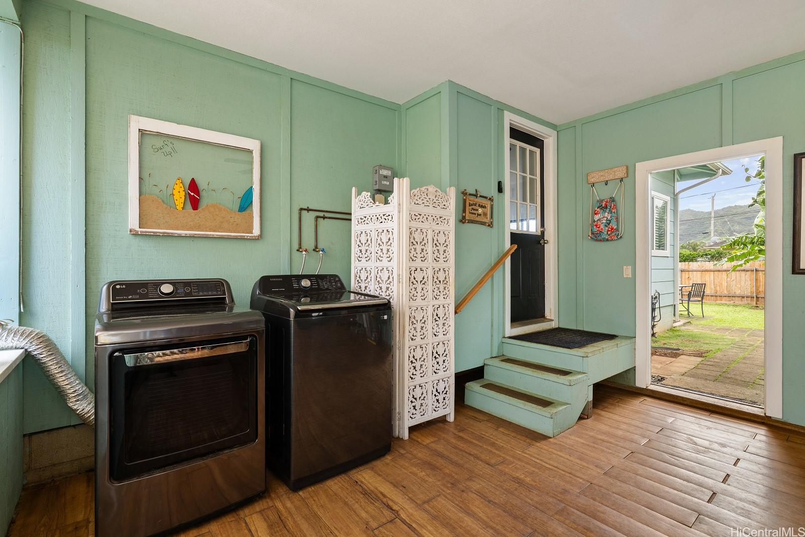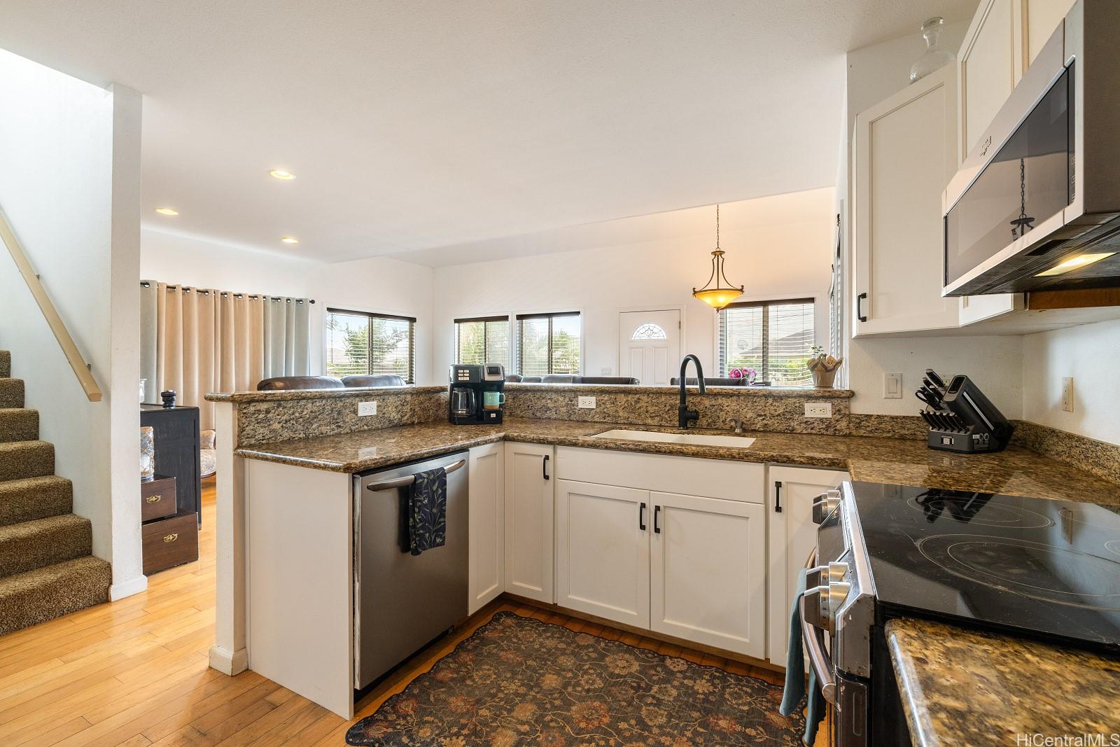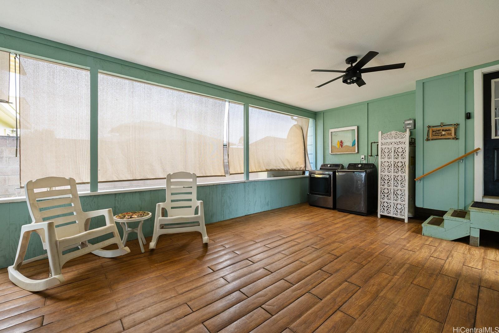 Welcome home to this bright and breezy 3-bedroom, 3-bath residence in the desirable Waiakalua neighborhood of Kaneohe with NO HOA. Abundant windows invite refreshing trade winds and natural light throughout the home, creating comfortable year round island-living.Enjoy a spacious, quiet, fully fenced yard with lush landscaping and a mature Apple Banana tree, perfect for relaxing or entertaining. The open-concept living, dining, and kitchen area features rich hardwood floors, while the kitchen offers granite countertops, ample cabinetry, and generous prep space.A bedroom and full bath on the main level provide ideal flexibility for guests, multi-generational living or home office. Upstairs, the primary suite and guest bedroom each feature private ensuite baths, offering comfort and privacy for all.Enjoy a large two-car garage with parking for 3 more vehicles in the driveway, and a bonus 350+ sq ft covered lanai connecting the garage to the home, perfect for entertaining, workouts, or relaxing outdoor living.Conveniently located near Kaneohe Marine Corps Base, beaches, schools, shopping, dining, and golf courses, this home blends comfort, convenience, and island charm.