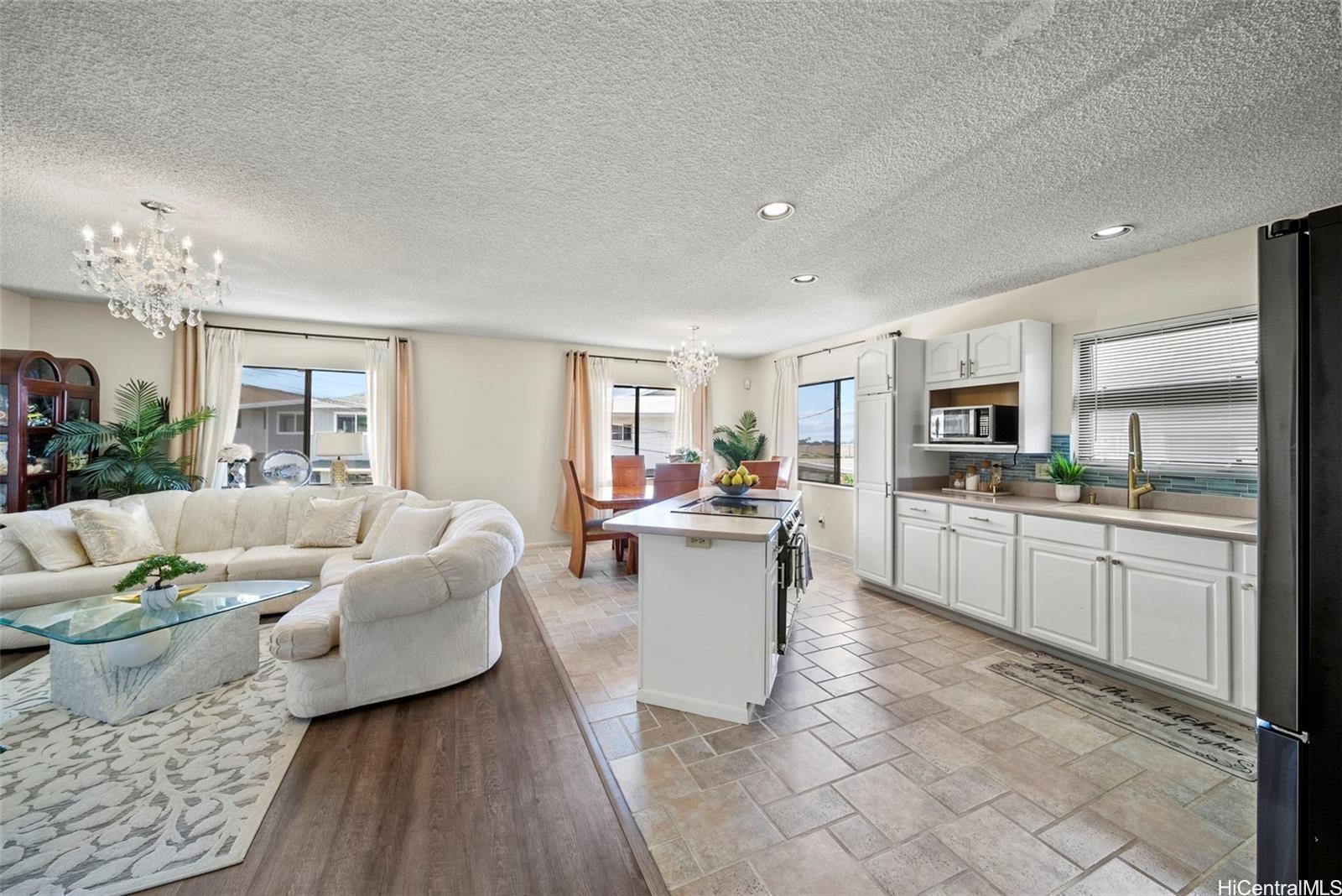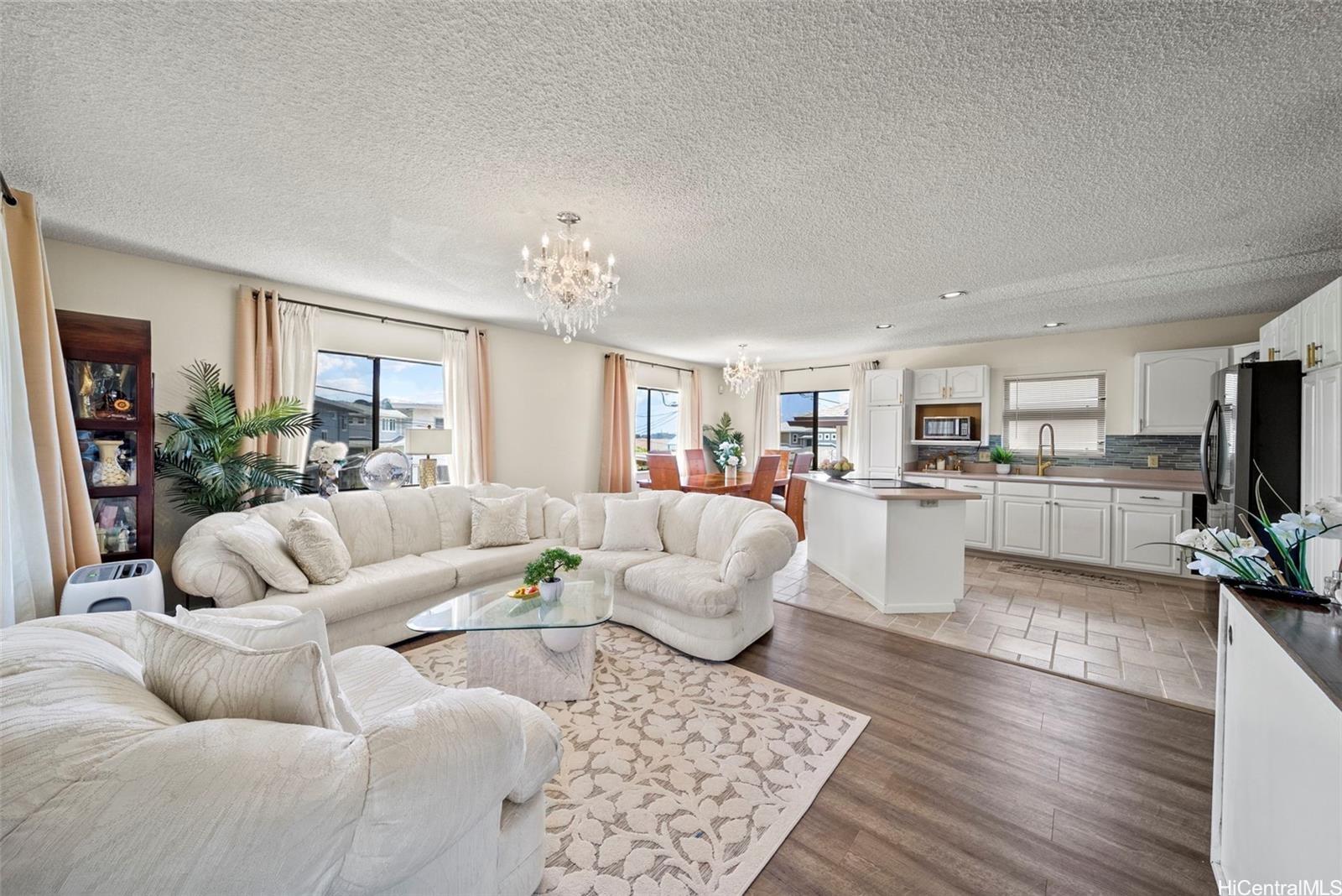 Versatile two-level residence located in the desirable Waikalua area of Kaneohe. The upper level features an open-concept kitchen, dining, and living area filled with natural light, offering a functional layout for everyday living. The lower level includes additional bedrooms, a full bath, a living area, and a kitchenette, providing flexible space for extended living or guests. Bedrooms and full bathrooms on both levels support practical living options. Conveniently located near Kaneohe Bay, Windward Mall, shopping, dining, and major commuter routes.