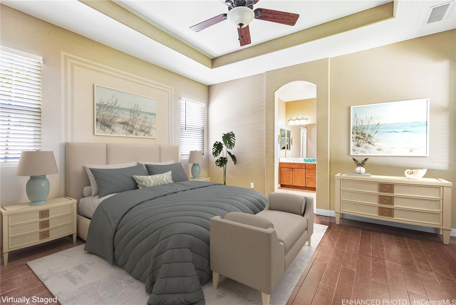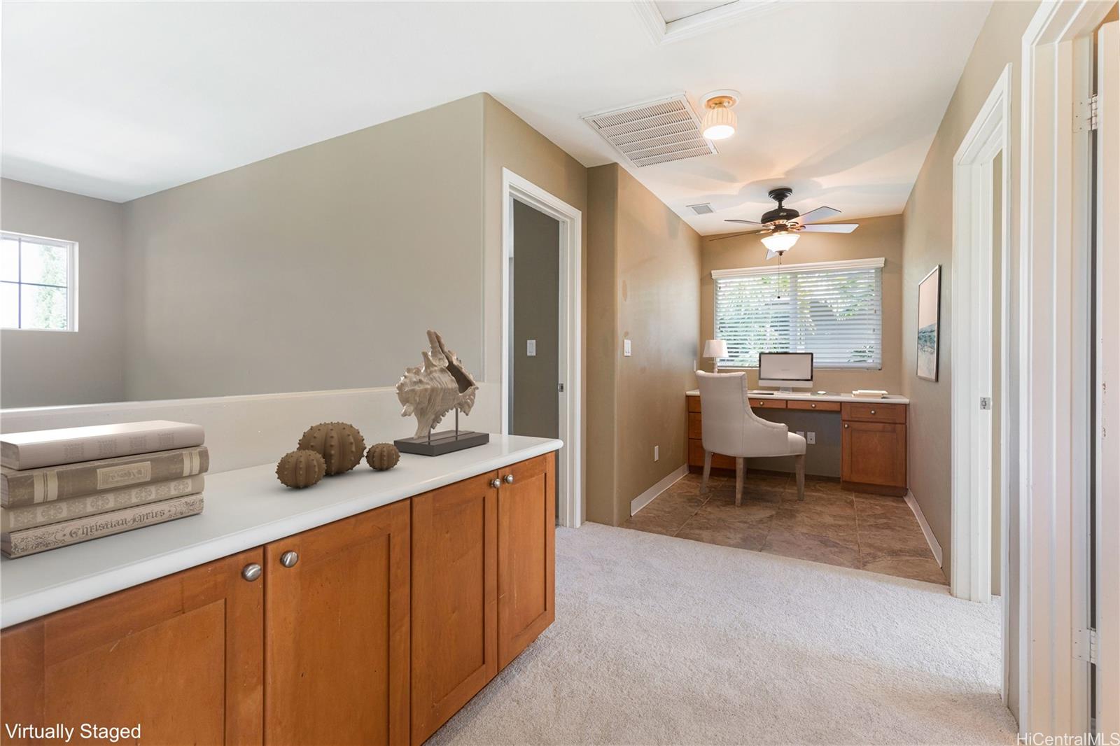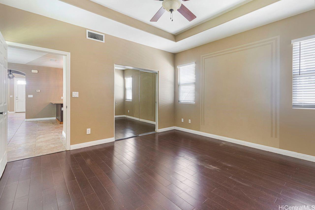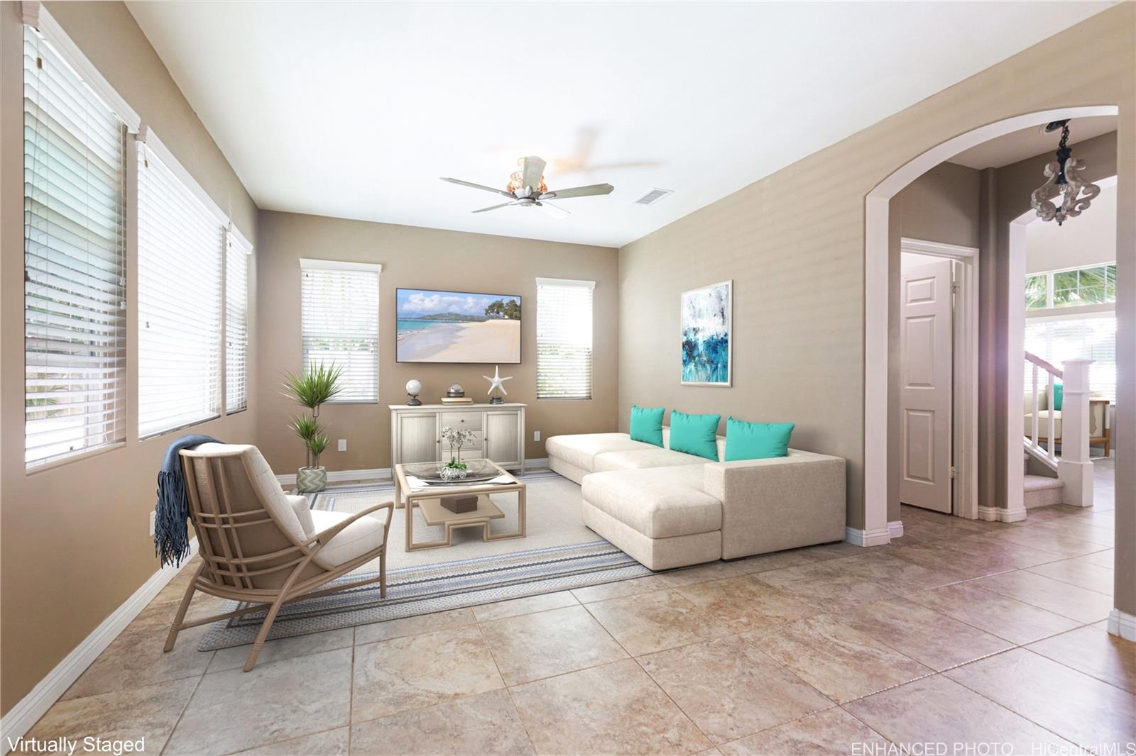 A rare first-floor primary bedroom with full ensuite bath provides convenience & flexibility in this spacious 4-bedroom, 2.5-bath home in the desirable Ocean Pointe neighborhood. Dramatic two-story ceilings and lots of windows welcome you into the light-filled living room and separate dining room–which could double as an office, if preferred. A 2nd living area provides generous space for relaxing or entertaining and opens into large, open, well-appointed kitchen with eat-in bar, tons of counter space & newer stainless-steel appliances. Primary bedroom includes walk-in closet, and bathroom w/ double sinks, a soaking tub & separate shower. A covered lanai adds outdoor living enjoyment next to large backyard. Upstairs are three additional bedrooms with shared full bath, plus dedicated office area providing a perfect setup for working from home or studying. Enjoy a larger yard than many homes in the area, plus a 2-car garage with ample overhead storage. Leased PV panels help keep electric costs down. Near parks, schools, shopping, and community amenities, this property offers space, versatility, & an excellent location in much-favored Ocean Pointe neighborhood. Click links for video.