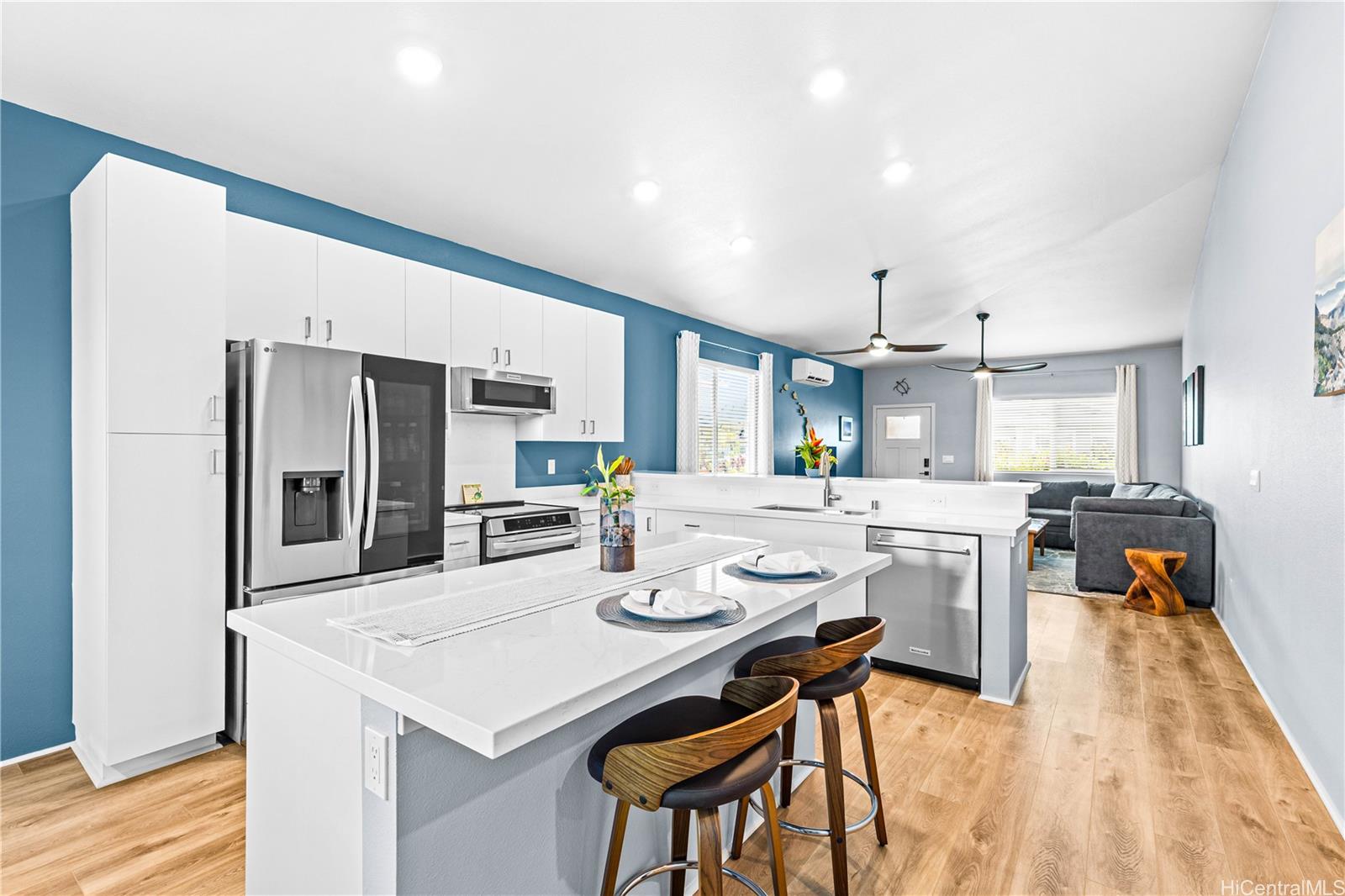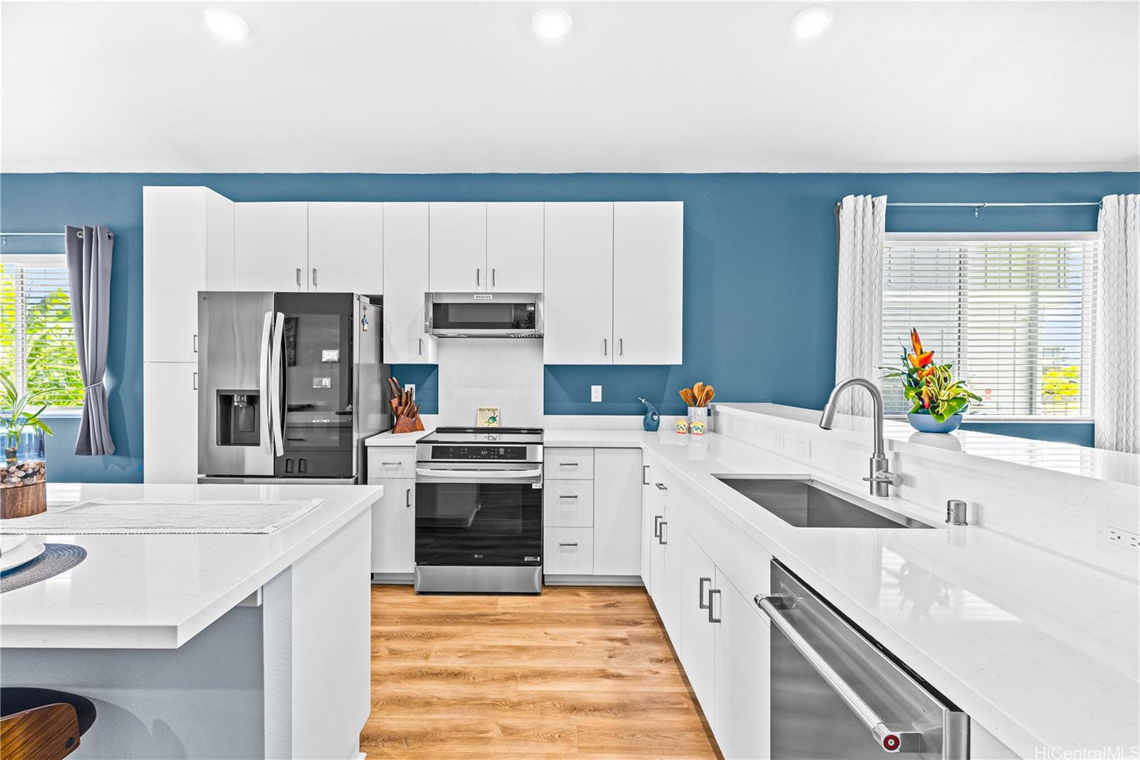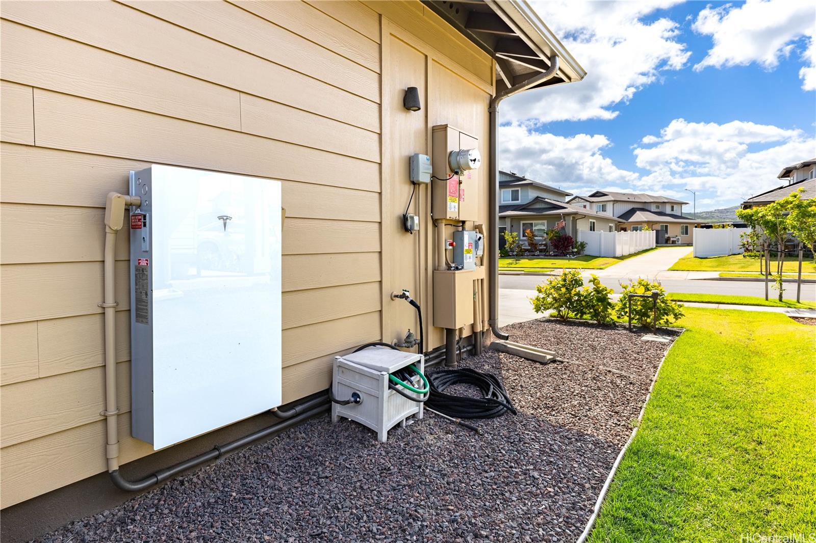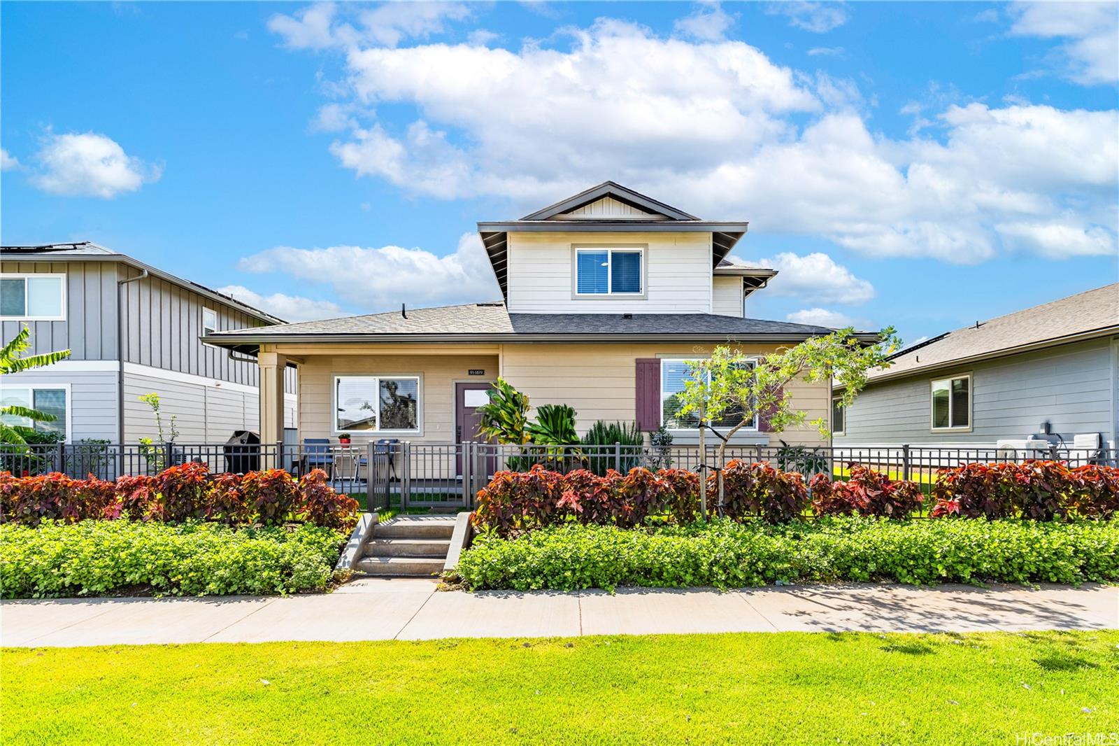 Rare ground-floor primary suite & owned solar system! The one you’ve been waiting for! Discover the pinnacle of modern island living in this pristine 4-bedroom, 2.5-bath single family home in the highly sought-after Kanalani at Hoopili community. Built in 2023, this newer residence offers a thoughtfully designed layout with spacious living areas, abundant natural light, and contemporary finishes throughout.The open-concept kitchen flows seamlessly into the living and dining areas as well as the family room, offering a versatile layout ideal for both everyday living and entertaining. The primary bedroom is conveniently located on the ground floor and features a private en-suite bathroom.Enjoy energy efficiency and long-term savings with 21 owned PV panels paired with a Tesla Powerwall battery, providing sustainable power and added peace of mind.This home has been meticulously cared for and offers the perfect blend of comfort, style, and convenience in one of Ewa Beach’s most sought-after communities. Don’t miss this opportunity to own a stunning home in Hoopili!