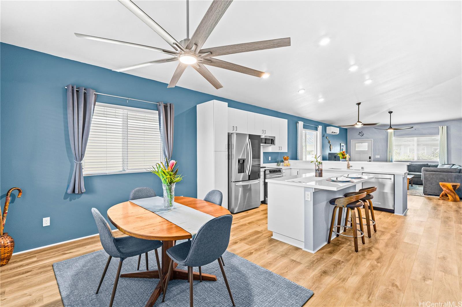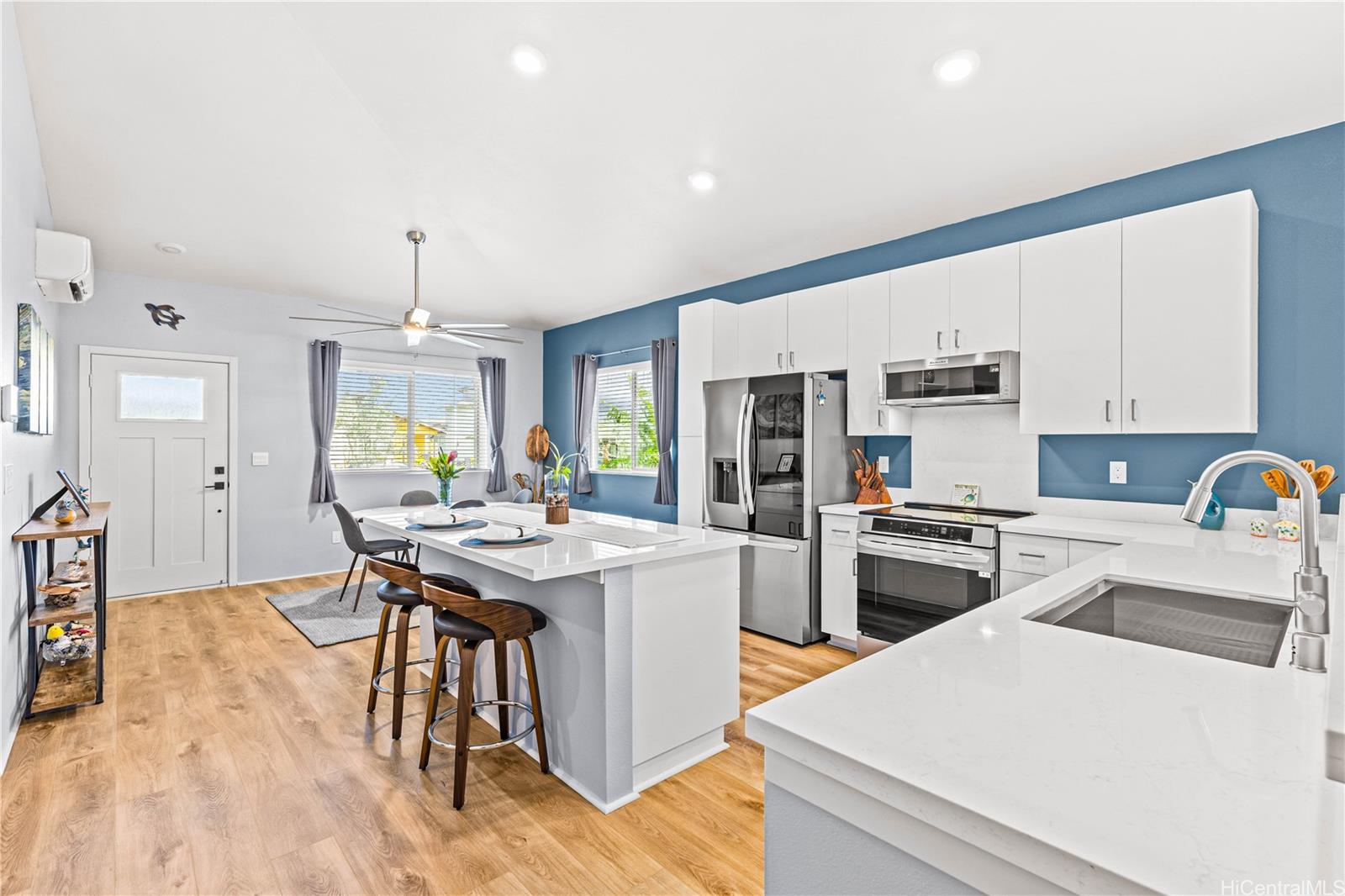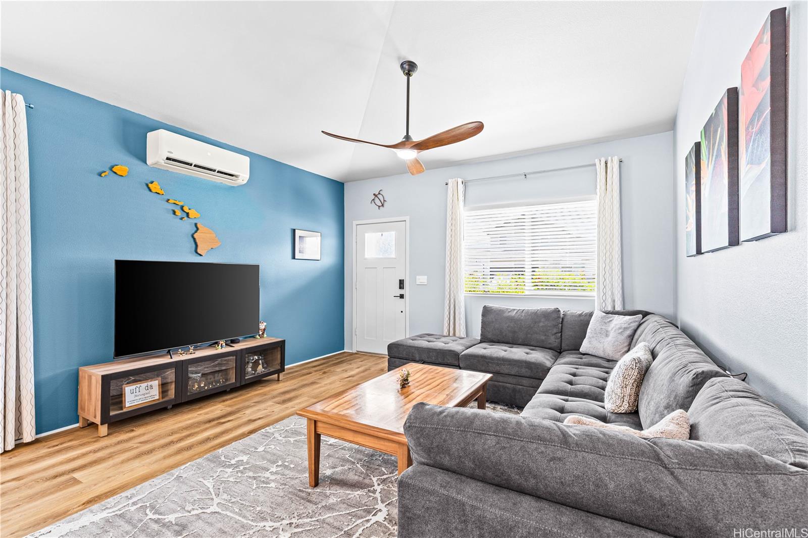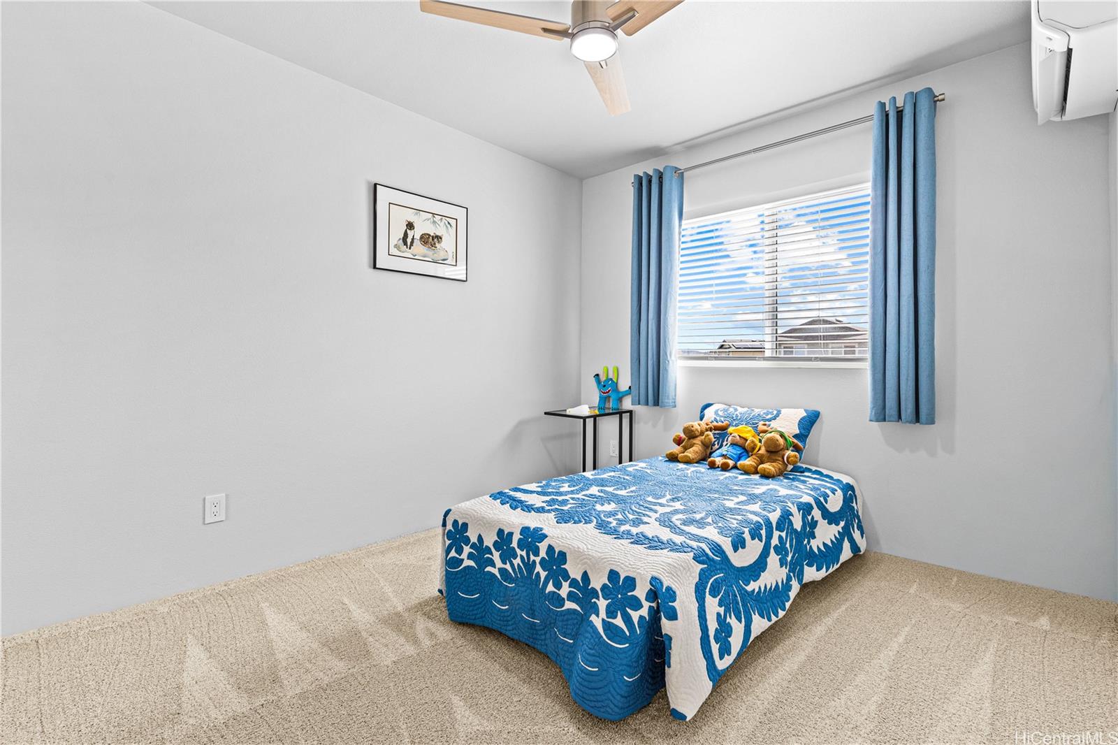 Rare ground-floor primary suite & owned solar system! The one you’ve been waiting for! Discover the pinnacle of modern island living in this pristine 4-bedroom, 2.5-bath single family home in the highly sought-after Kanalani at Hoopili community. Built in 2023, this newer residence offers a thoughtfully designed layout with spacious living areas, abundant natural light, and contemporary finishes throughout.The open-concept kitchen flows seamlessly into the living and dining areas as well as the family room, offering a versatile layout ideal for both everyday living and entertaining. The primary bedroom is conveniently located on the ground floor and features a private en-suite bathroom.Enjoy energy efficiency and long-term savings with 21 owned PV panels paired with a Tesla Powerwall battery, providing sustainable power and added peace of mind.This home has been meticulously cared for and offers the perfect blend of comfort, style, and convenience in one of Ewa Beach’s most sought-after communities. Don’t miss this opportunity to own a stunning home in Hoopili!