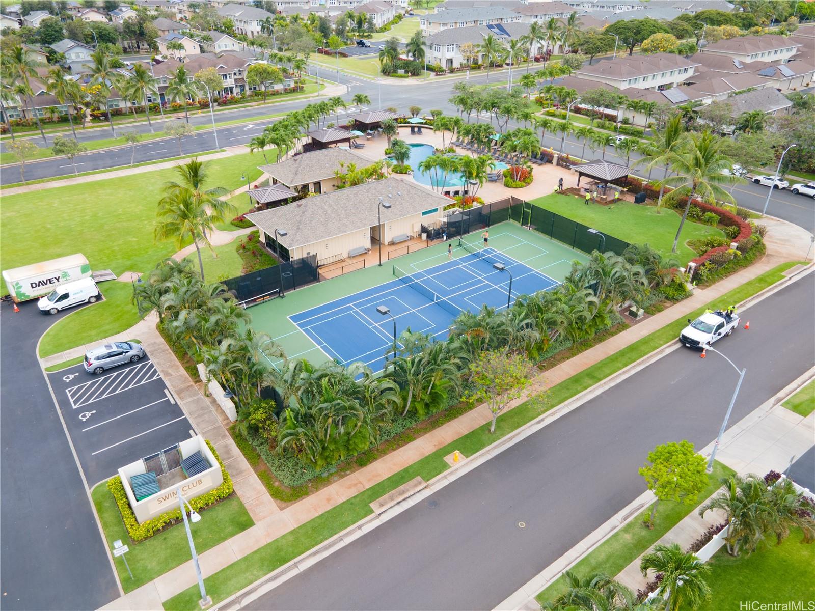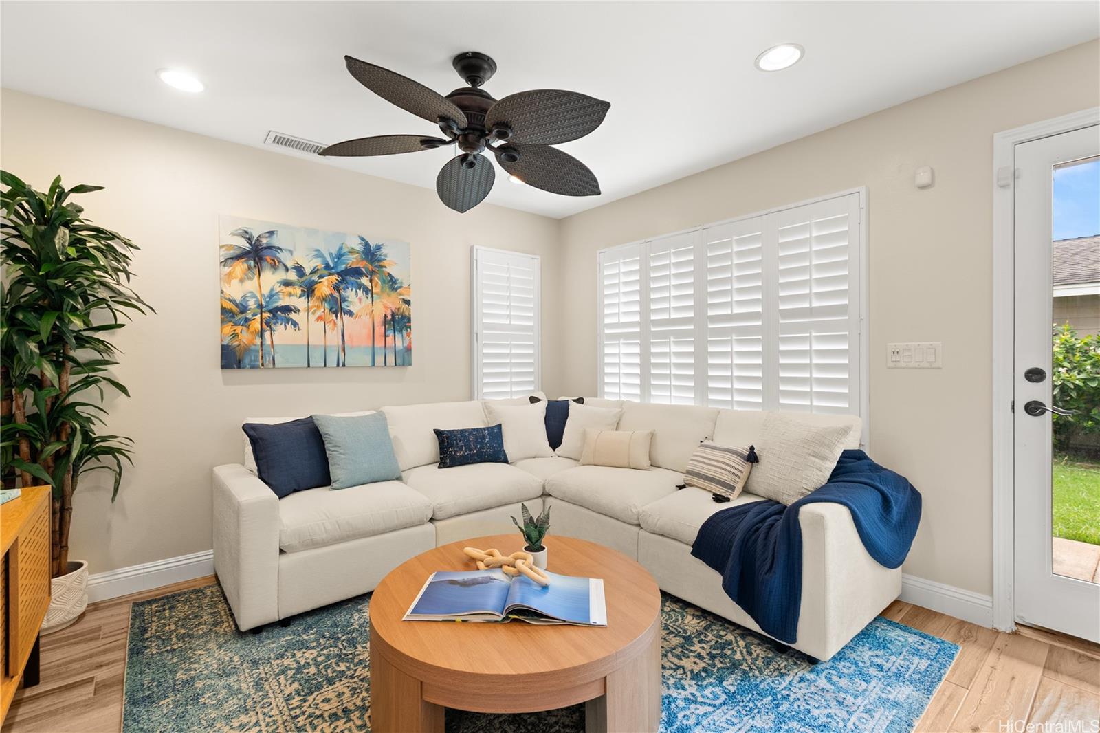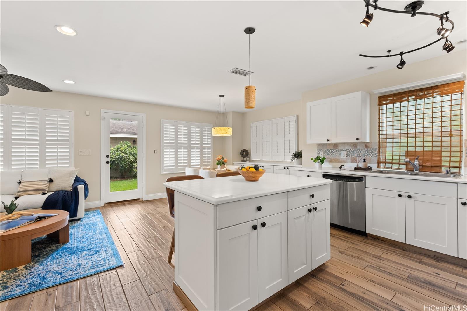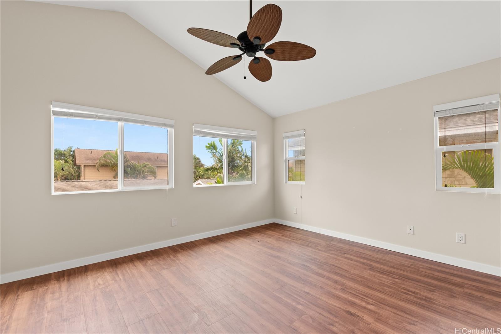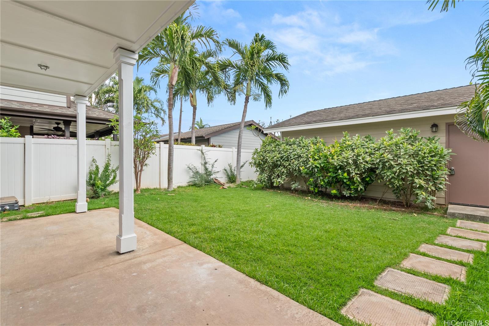 Welcome to this resort style neighborhood, minutes from the private Hoakalei County Club, an LPGA tournament destination golf course. Walkable to the community Swim Club, tennis courts and gym. Minutes from the brand-new Wai Kai Resort with a 52-acre lagoon and the world’s largest standing wave pool. This beautifully upgraded 4-bedroom, 3-bathroom home blends island elegance with energy efficiency. The floor plan includes a full bedroom and bath on the main level, wood-grain ceramic tile throughout downstairs, and a spacious kitchen with stainless steel appliances. Enjoy 23 owned solar panels with battery backup, solar water heater, and central A/C for year-round comfort. Plantation shutters add charm, while the ground-level laundry room and detached 2-car garage with extra storage. The landscaped, fully fenced yard offers privacy and space to relax or entertain. Freshly painted interior and exterior, new flooring upstairs, new stair treads, and base boards. HOA covers high-speed internet, cable and home phone through Spectrum. Assumable loan balance is $1,043,174.94 at 4.25% PITI is $6000.00.