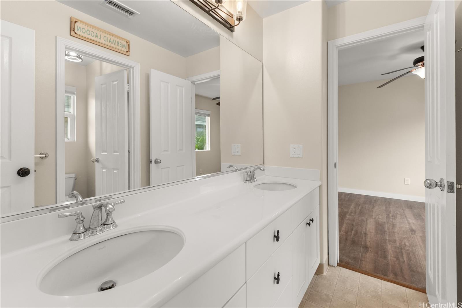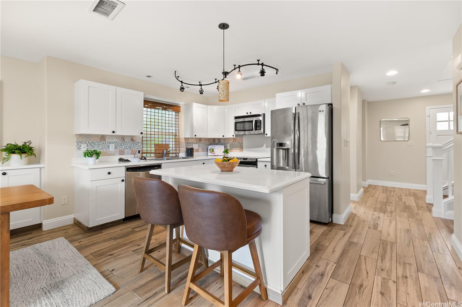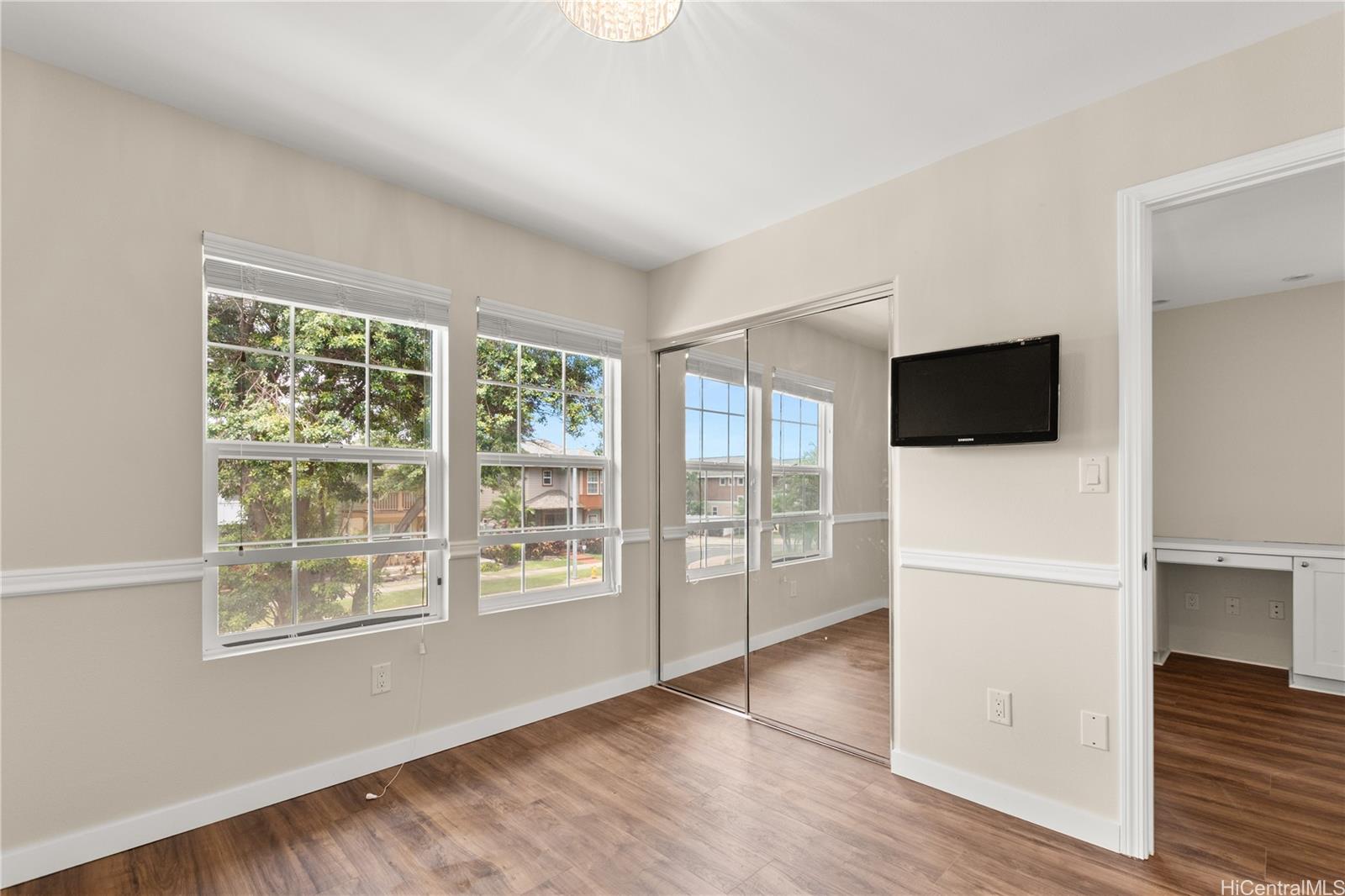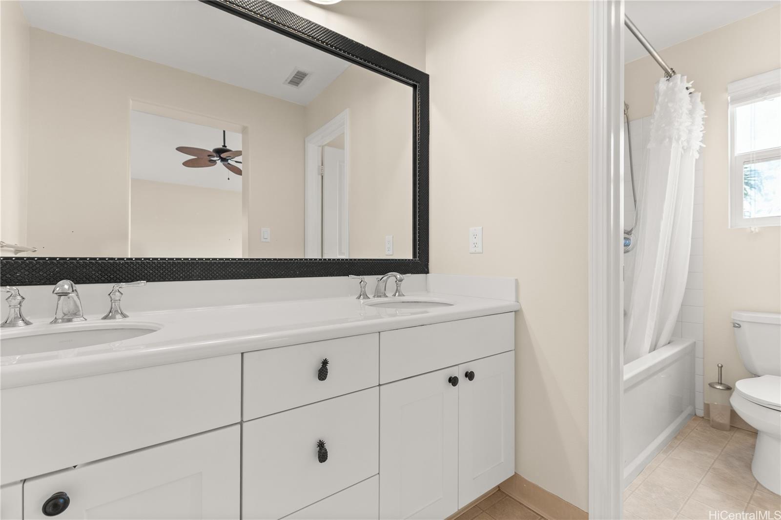 Welcome to this resort style neighborhood, minutes from the private Hoakalei County Club, an LPGA tournament destination golf course. Walkable to the community Swim Club, tennis courts and gym. Minutes from the brand-new Wai Kai Resort with a 52-acre lagoon and the world’s largest standing wave pool. This beautifully upgraded 4-bedroom, 3-bathroom home blends island elegance with energy efficiency. The floor plan includes a full bedroom and bath on the main level, wood-grain ceramic tile throughout downstairs, and a spacious kitchen with stainless steel appliances. Enjoy 23 owned solar panels with battery backup, solar water heater, and central A/C for year-round comfort. Plantation shutters add charm, while the ground-level laundry room and detached 2-car garage with extra storage. The landscaped, fully fenced yard offers privacy and space to relax or entertain. Freshly painted interior and exterior, new flooring upstairs, new stair treads, and base boards. HOA covers high-speed internet, cable and home phone through Spectrum. Assumable loan balance is $1,043,174.94 at 4.25% PITI is $6000.00.