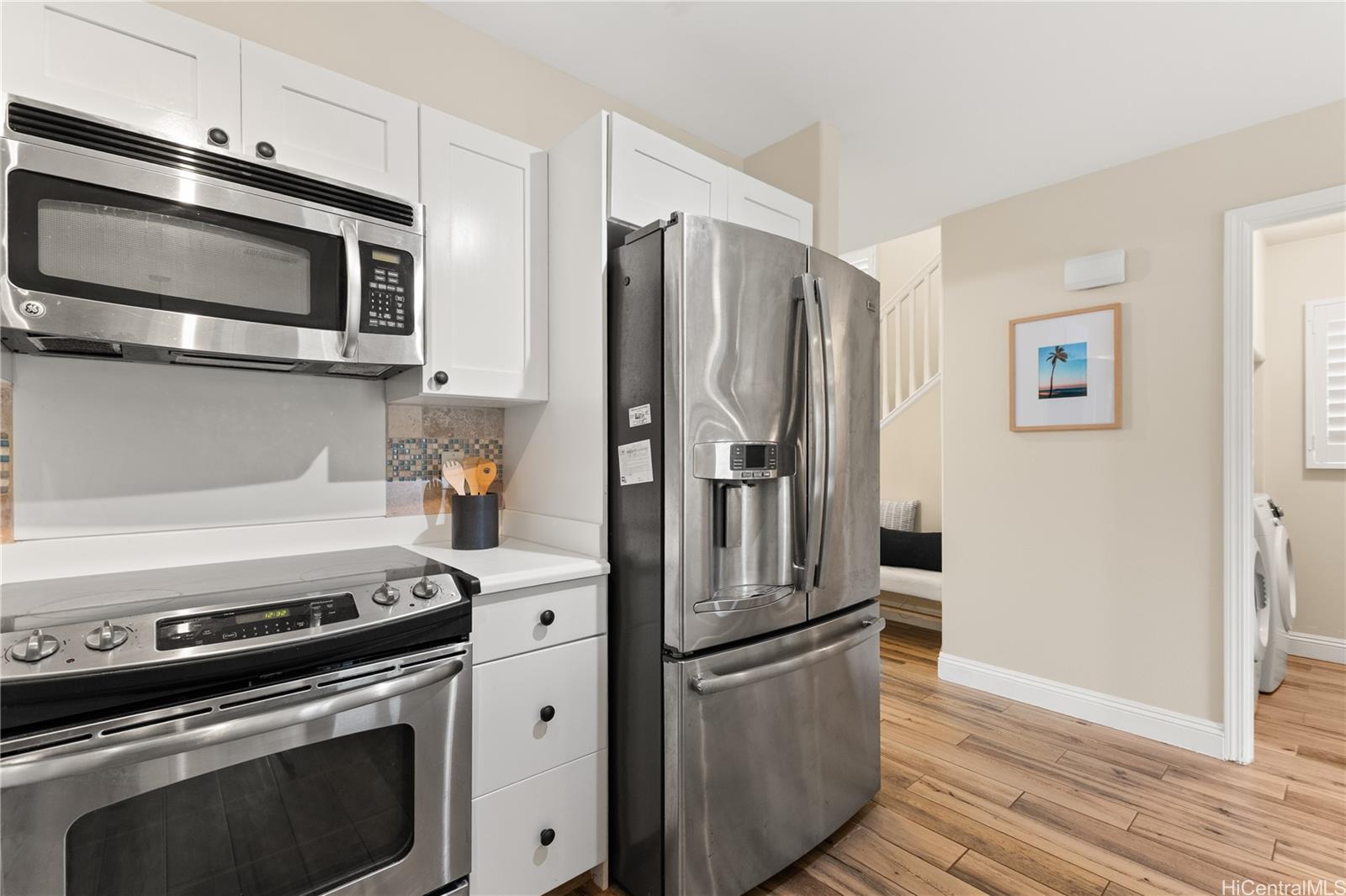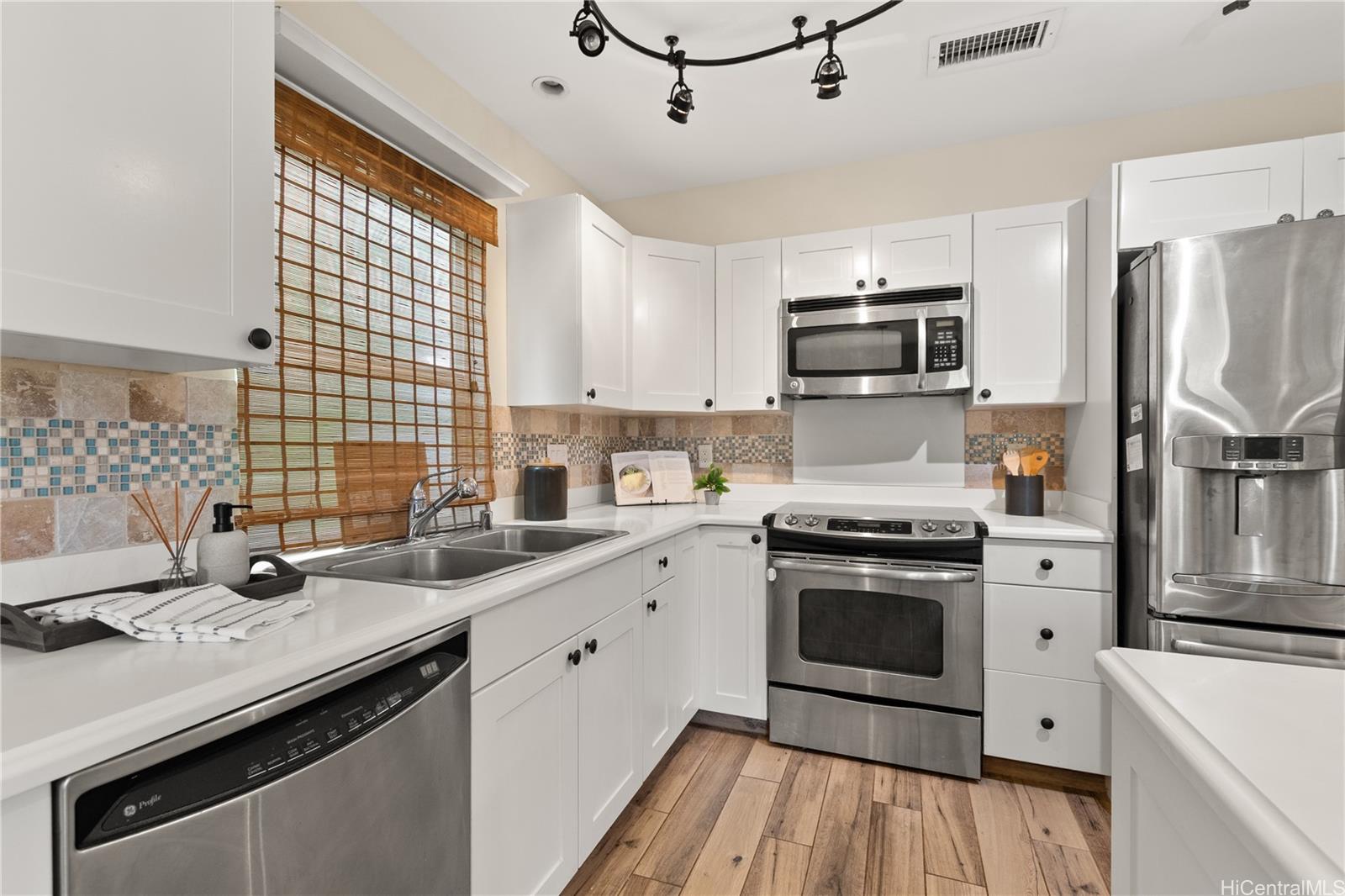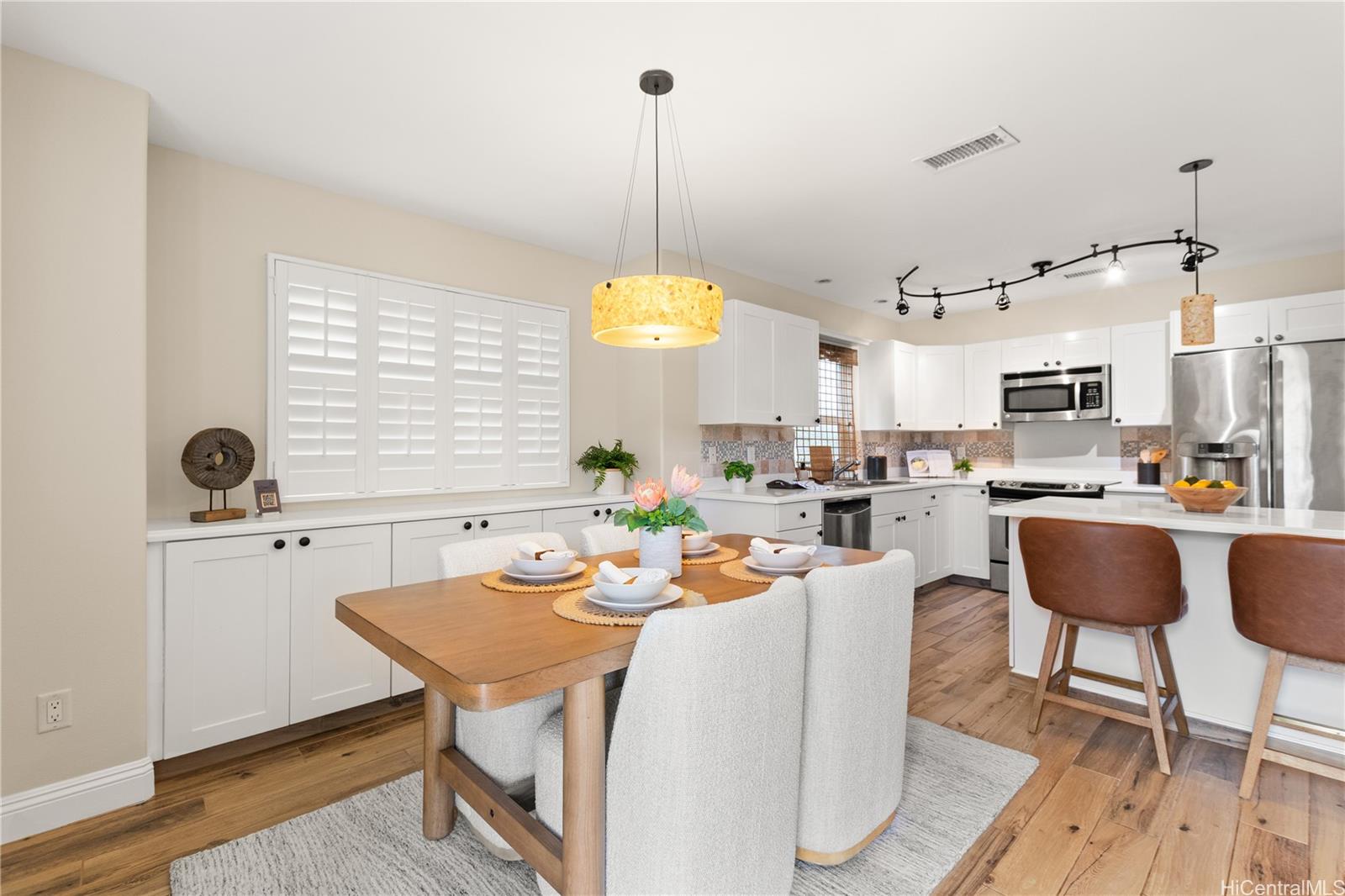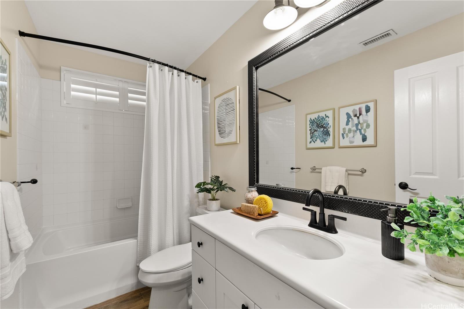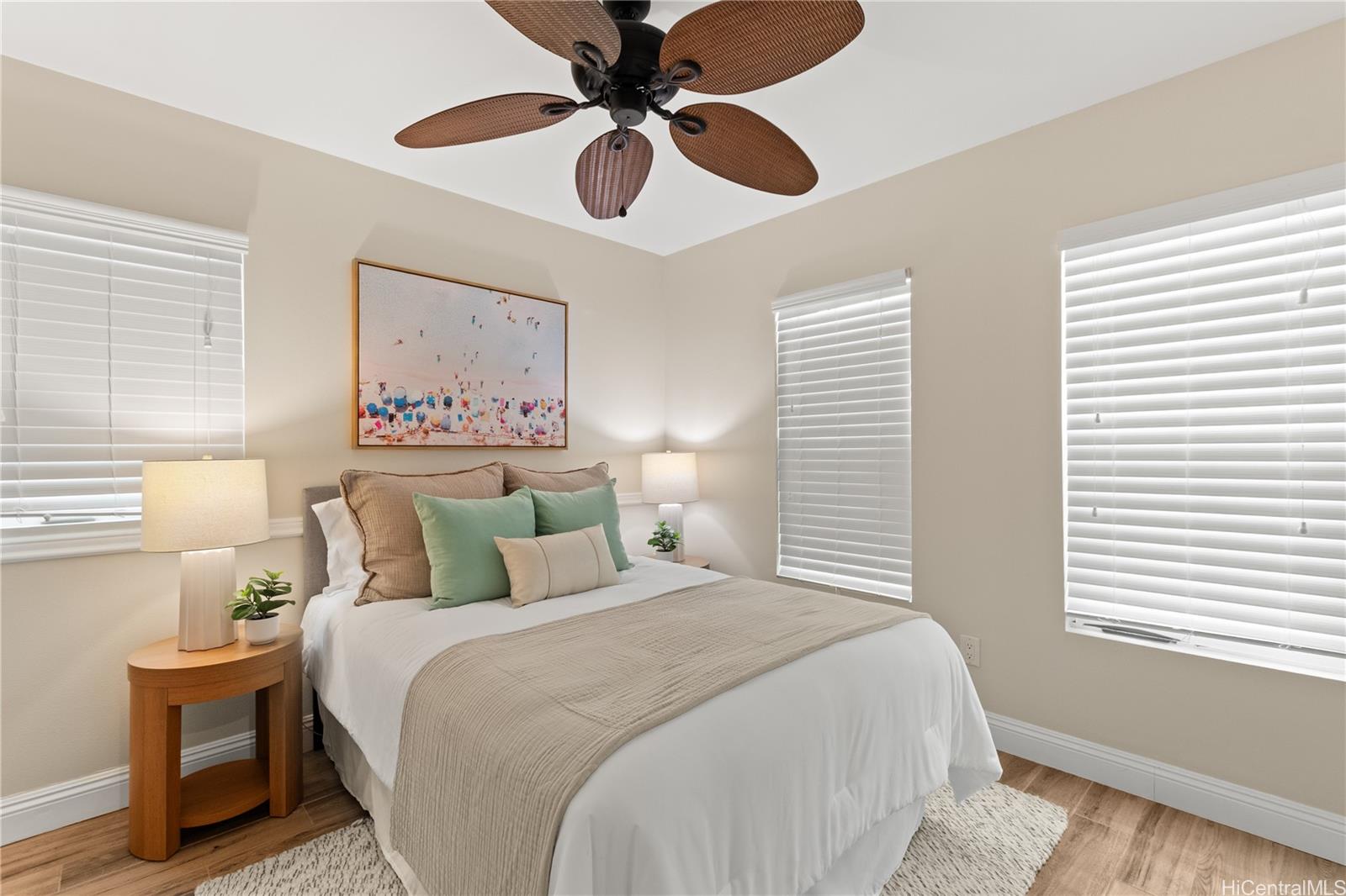 Welcome to this resort style neighborhood, minutes from the private Hoakalei County Club, an LPGA tournament destination golf course. Walkable to the community Swim Club, tennis courts and gym. Minutes from the brand-new Wai Kai Resort with a 52-acre lagoon and the world’s largest standing wave pool. This beautifully upgraded 4-bedroom, 3-bathroom home blends island elegance with energy efficiency. The floor plan includes a full bedroom and bath on the main level, wood-grain ceramic tile throughout downstairs, and a spacious kitchen with stainless steel appliances. Enjoy 23 owned solar panels with battery backup, solar water heater, and central A/C for year-round comfort. Plantation shutters add charm, while the ground-level laundry room and detached 2-car garage with extra storage. The landscaped, fully fenced yard offers privacy and space to relax or entertain. Freshly painted interior and exterior, new flooring upstairs, new stair treads, and base boards. HOA covers high-speed internet, cable and home phone through Spectrum. Assumable loan balance is $1,043,174.94 at 4.25% PITI is $6000.00.