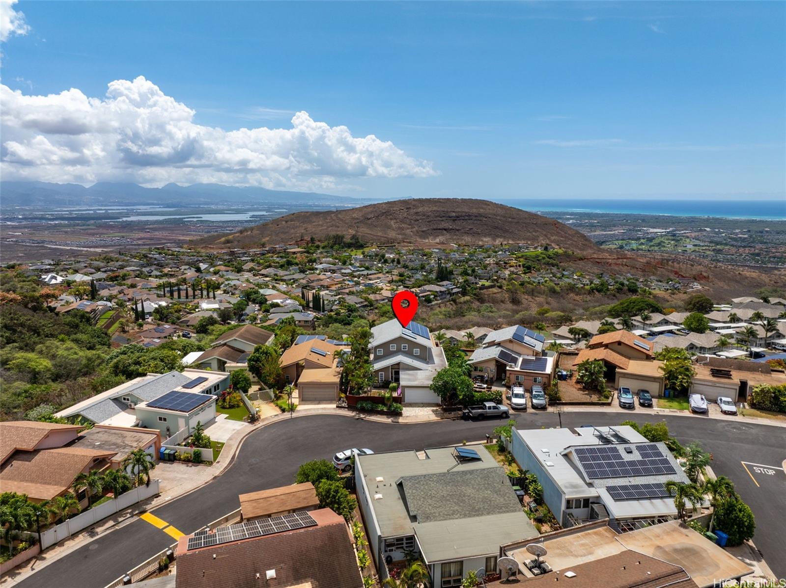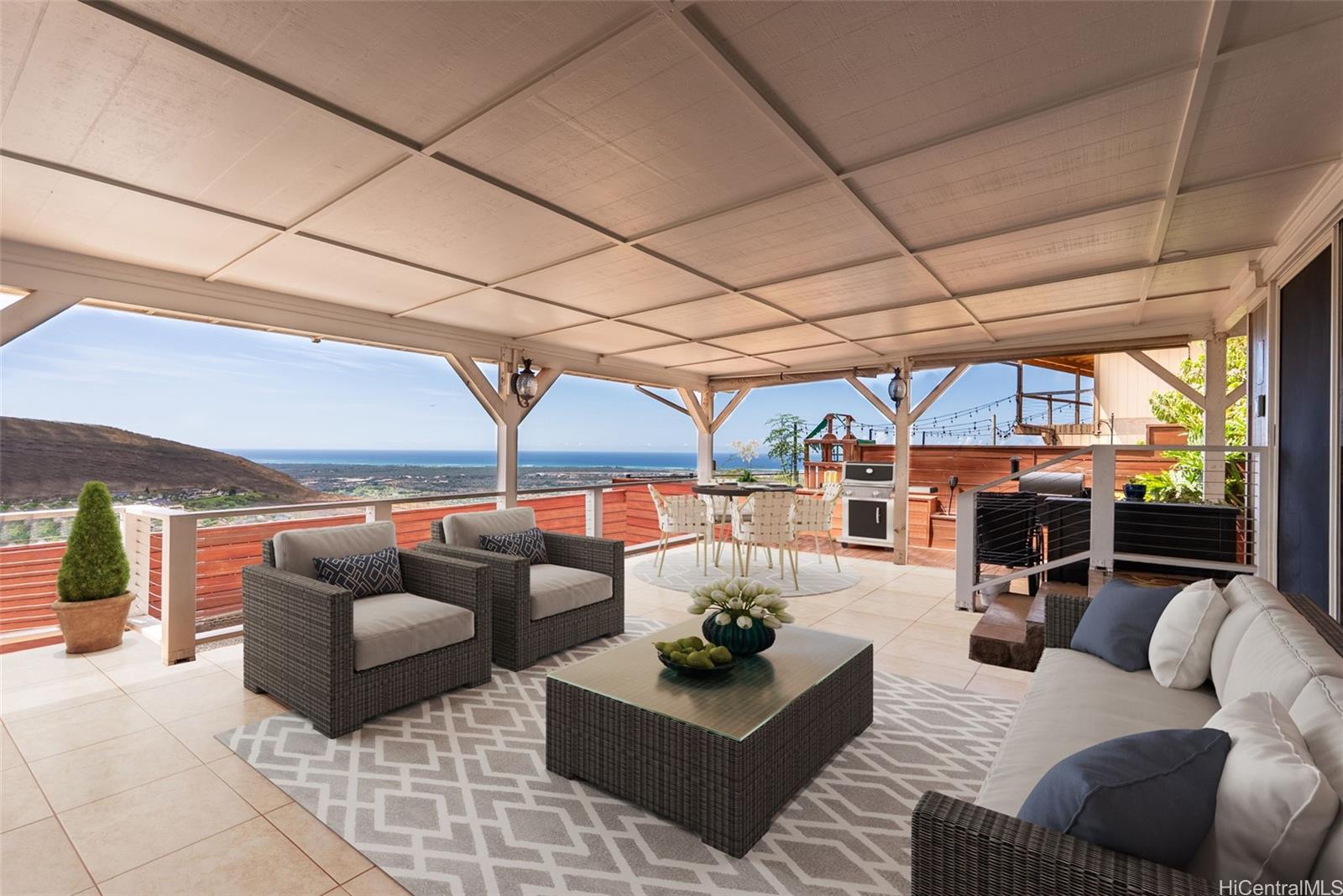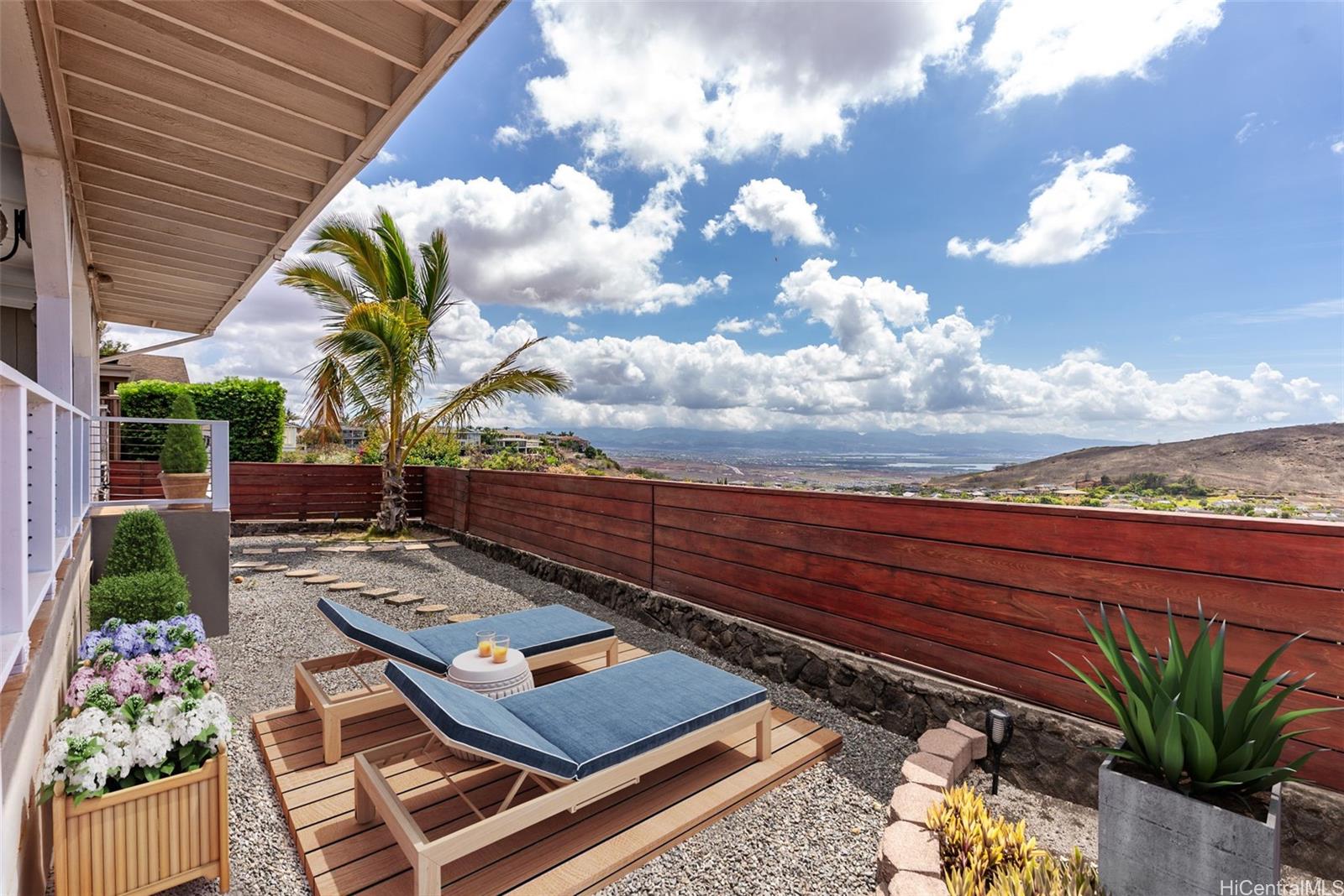 RARE PERIMETER LOT WITH PANORAMIC VIEWS! Perched on the breezy & cool Makakilo hillside, this beautifully renovated 4-bed, 3-bath gem is all about the VIEWS! Wake up to sweeping vistas of the city skyline, mountain ranges, Pearl Harbor, the Ewa/Kapolei plain, & endless ocean blues. This home features a modern kitchen, upgraded windows & flooring, & an expansive covered lanai that truly sets it apart. Whether you’re enjoying morning coffee, hosting weekend BBQs, working outdoors, or simply relaxing in your jacuzzi, this lanai is the ultimate indoor-outdoor retreat. Elevated & open to the views, it’s your front-row seat to island living at its best. The thoughtful layout includes 3 bedrooms & 2 full baths on the main level—one of which is a primary suite—providing ideal flexibility for multi-generational living, or guests. Upstairs is dedicated to an oversized GRAND SUITE, offering privacy & comfort. Additional highlights include a spacious 2-car garage, driveway parking, a fully fenced yard for pets or play, 23 leased PV panels & 2 batteries to help keep energy costs down year-round. This is more than a home—it’s a front-row seat to Hawai‘i’s natural beauty & lifestyle.