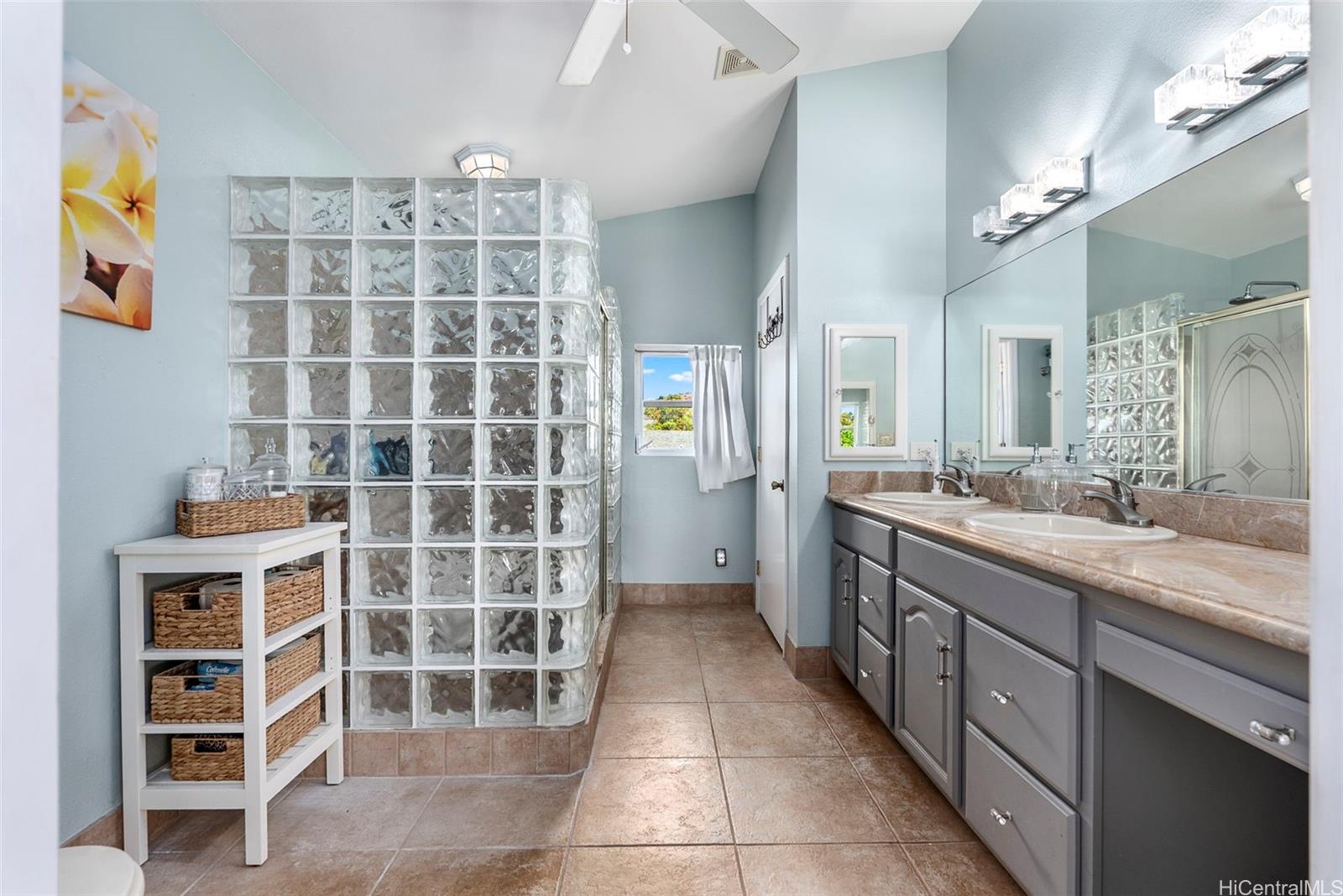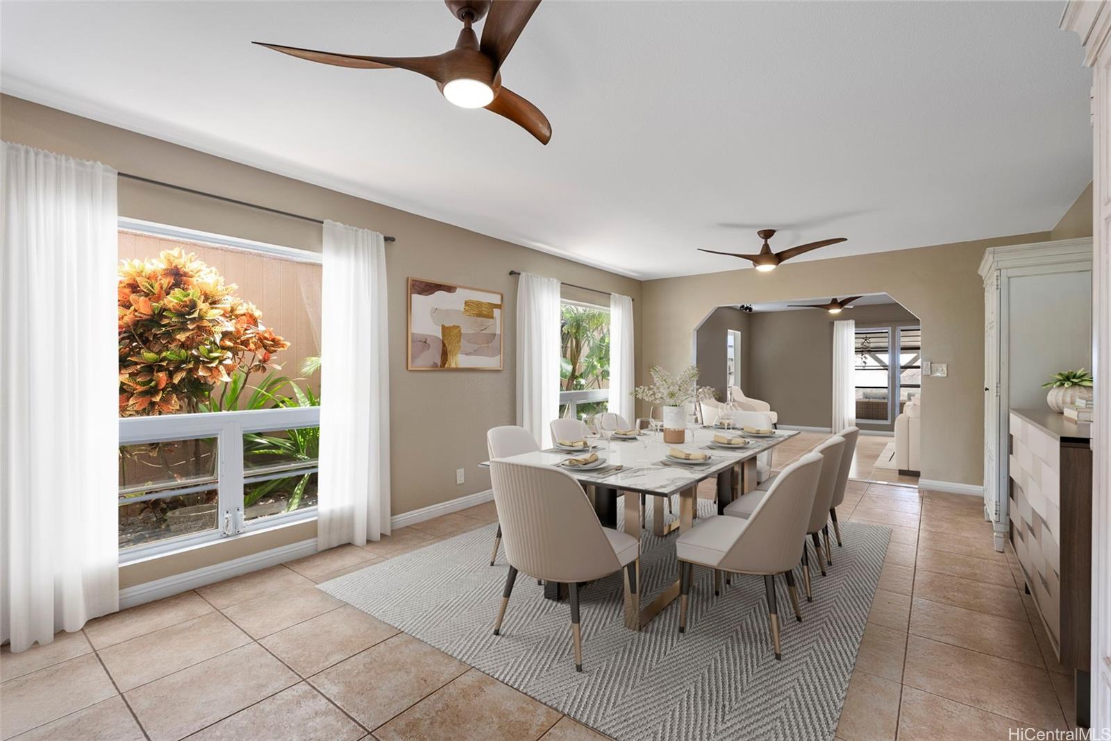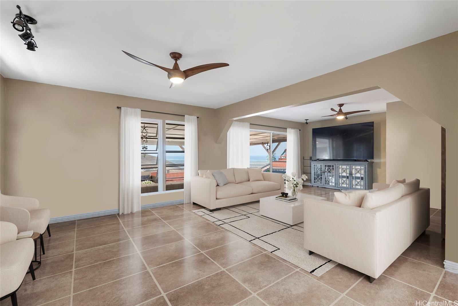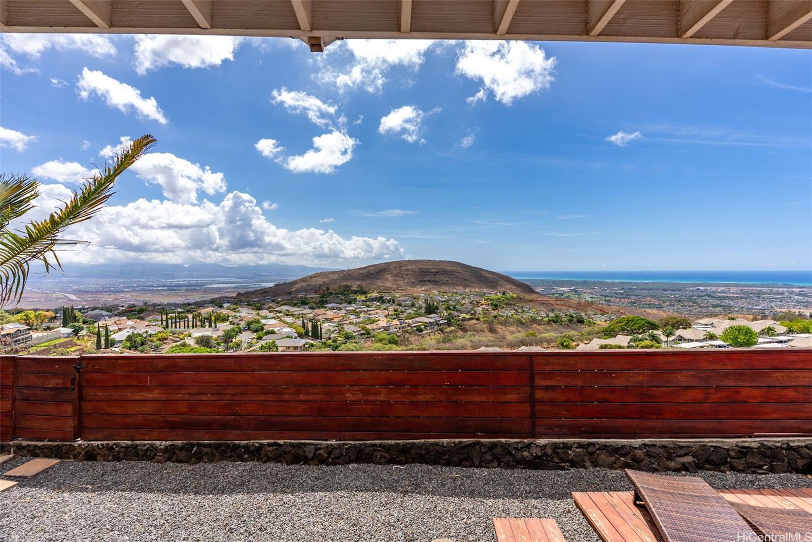 RARE PERIMETER LOT WITH PANORAMIC VIEWS! Perched on the breezy & cool Makakilo hillside, this beautifully renovated 4-bed, 3-bath gem is all about the VIEWS! Wake up to sweeping vistas of the city skyline, mountain ranges, Pearl Harbor, the Ewa/Kapolei plain, & endless ocean blues. This home features a modern kitchen, upgraded windows & flooring, & an expansive covered lanai that truly sets it apart. Whether you’re enjoying morning coffee, hosting weekend BBQs, working outdoors, or simply relaxing in your jacuzzi, this lanai is the ultimate indoor-outdoor retreat. Elevated & open to the views, it’s your front-row seat to island living at its best. The thoughtful layout includes 3 bedrooms & 2 full baths on the main level—one of which is a primary suite—providing ideal flexibility for multi-generational living, or guests. Upstairs is dedicated to an oversized GRAND SUITE, offering privacy & comfort. Additional highlights include a spacious 2-car garage, driveway parking, a fully fenced yard for pets or play, 23 leased PV panels & 2 batteries to help keep energy costs down year-round. This is more than a home—it’s a front-row seat to Hawai‘i’s natural beauty & lifestyle.