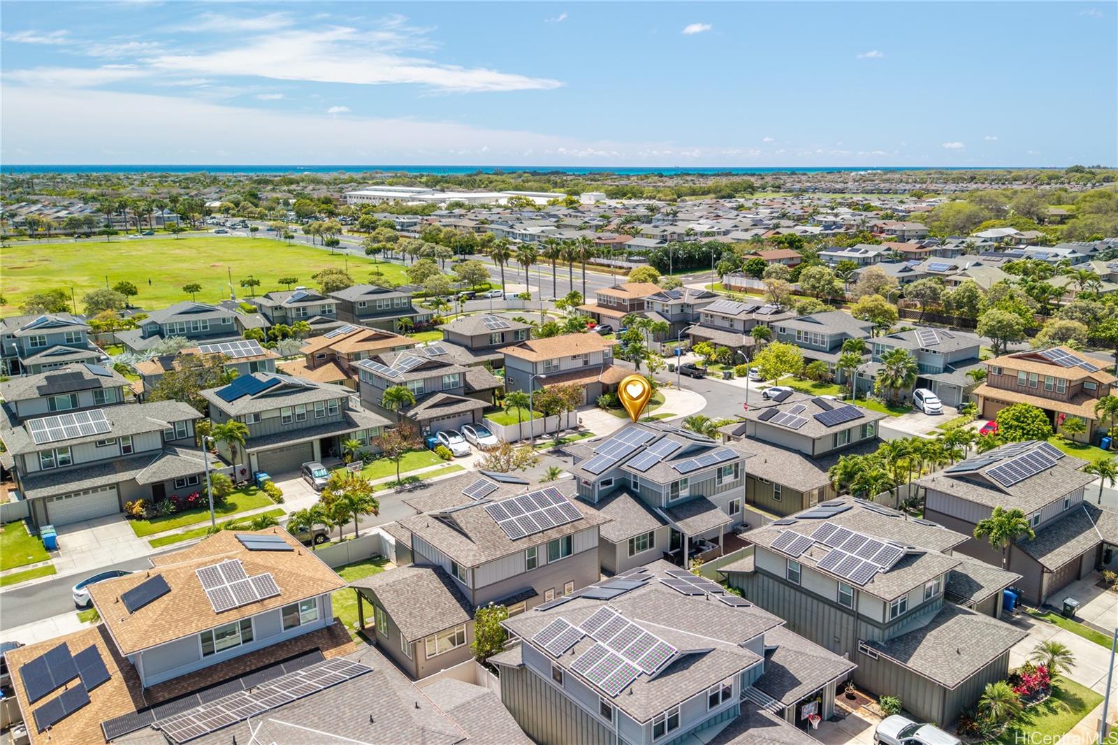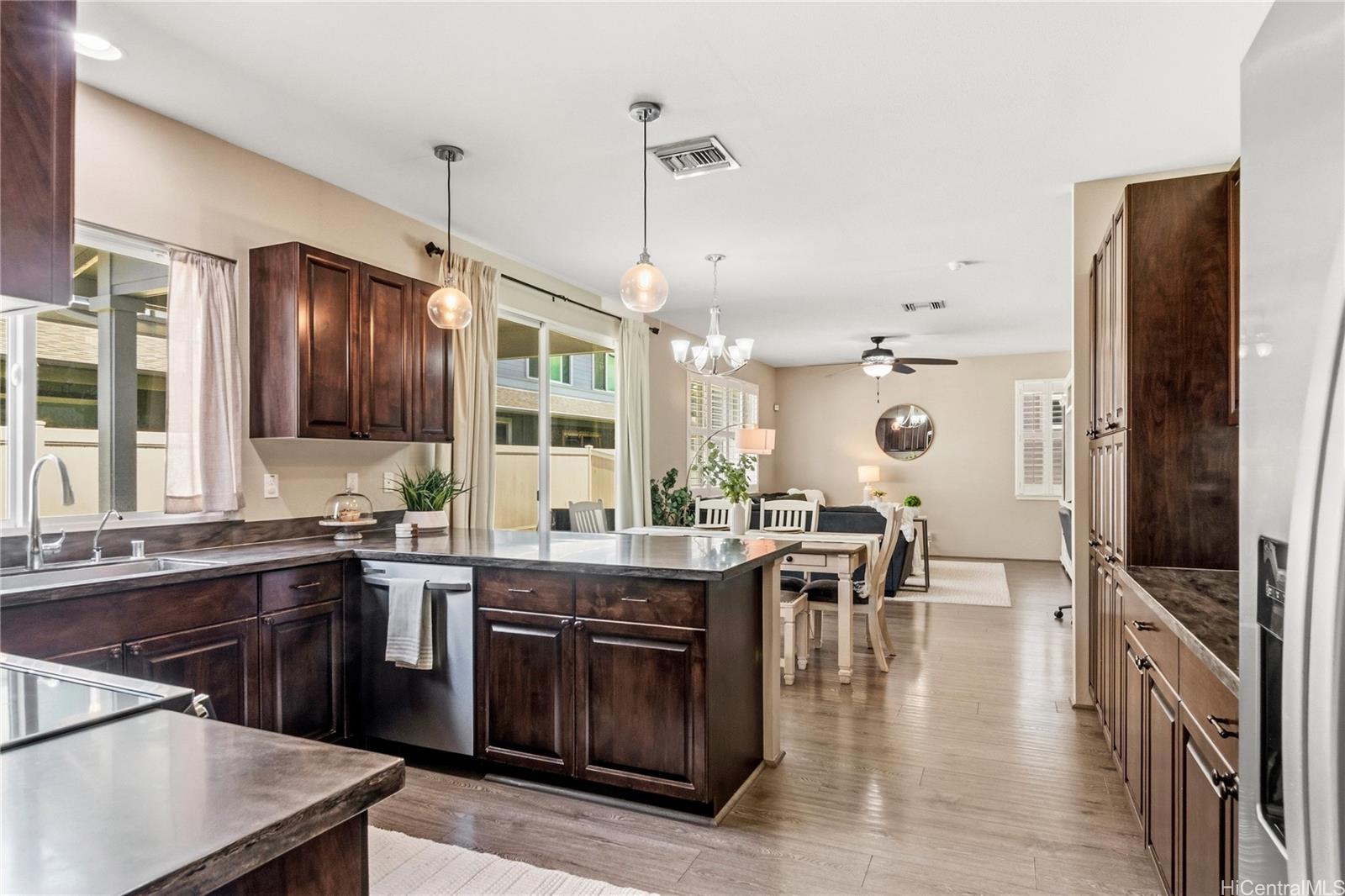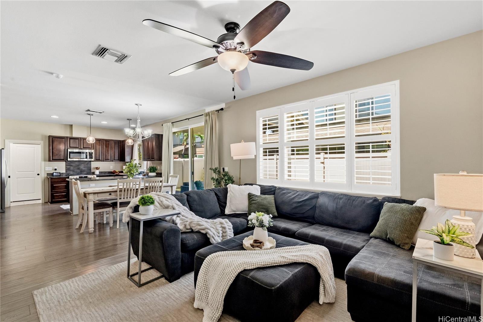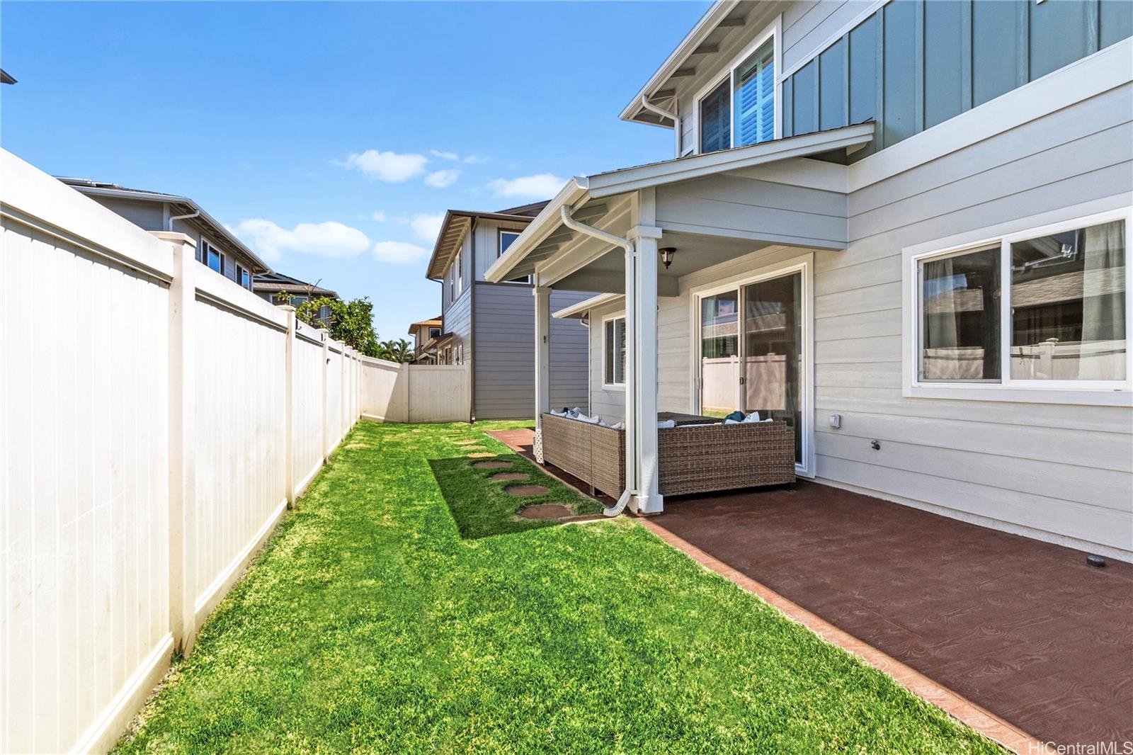 Located in the highly desirable Ewa by Gentry Sandalwood community in Ewa Beach, this home offers a prime location with a low HOA of just $53 a month, just minutes from schools, shopping centers, restaurants, and golf courses. This well-maintained 4-bedroom, 3-bathroom detached single-family home offers a functional layout with a full bedroom and bathroom on the first floor, ideal for guests, in-laws, or a home office.Fresh interior and exterior paint, new carpets on the second floor, and a beautifully upgraded kitchen featuring a gourmet double oven, perfect for cooking and entertaining. Enjoy a nice-sized backyard with an extended lanai, great for relaxing or hosting.Leased PV panels help with energy efficiency and savings. Parking includes a 2-car garage, driveway, and additional street parking.A great opportunity to own in one of Ewa Beach’s most sought-after communities.