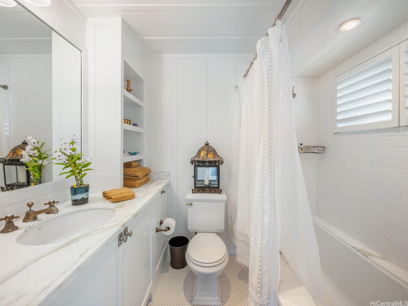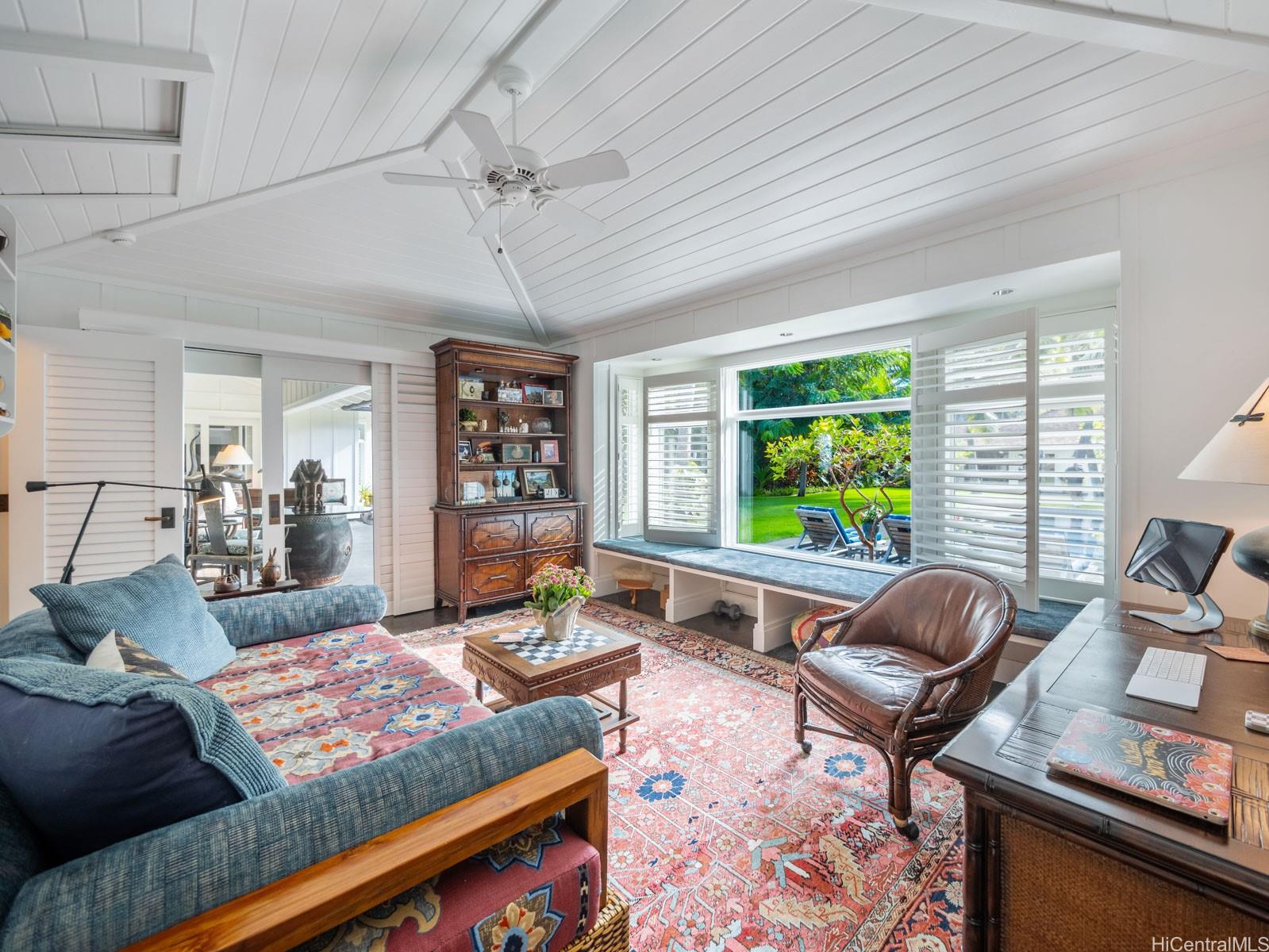 A charming jewel box on the bright blue waters of Lanikai — at the very end of the coveted Lanikai Loop — this 5-star couples’ retreat feels like a private resort. Gated, secluded, and beautifully manicured, it’s a newer-built Hawaiiana-style oasis. Enjoy a long, heated, tiled saltwater pool, jacuzzi, infrared sauna, gym area, and expansive green lawns. Dine or entertain under a trellis, with gas tiki torches glowing as the sun rises and the moonlight shimmers over the water. Spacious oceanfront lanais and thoughtful landscape lighting complete the setting. Impeccably built by Chris Emerson, the quality and craftsmanship are unparalleled — board-and-batten inside and out, soaring vaulted ceilings, and fully custom interiors throughout.