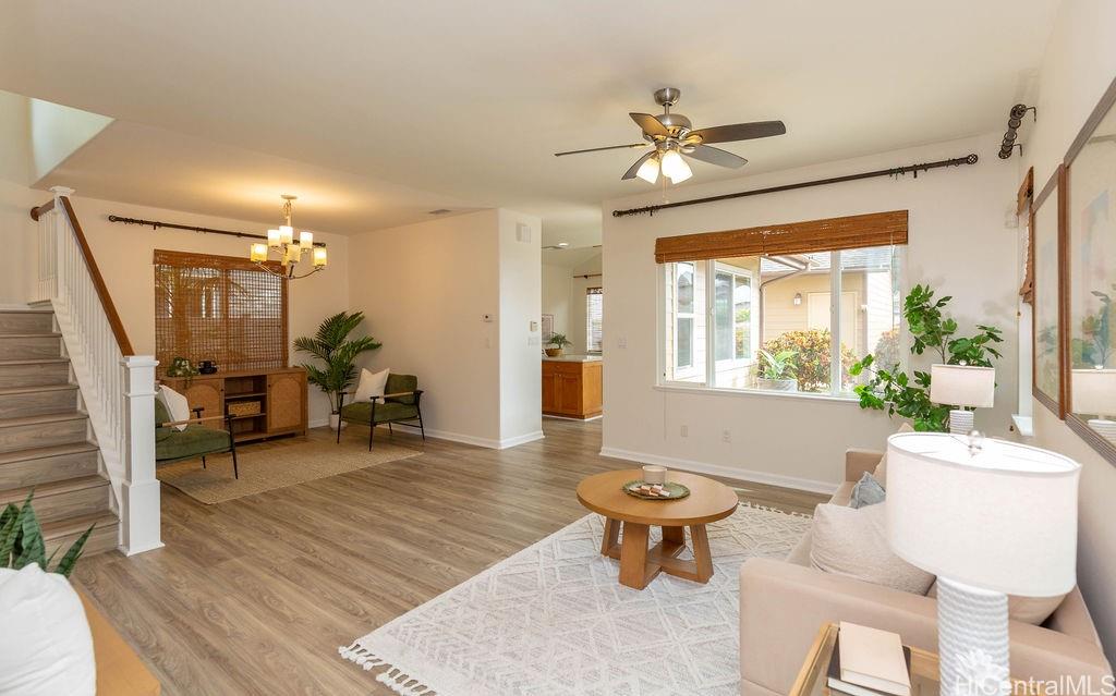 2010年築(モデルハウス)のこの美しい4ベッドルーム・3バスルームの戸建住宅は、エバビーチにあるリゾートコミュニティ「カ・マカナ・アット・ホアカレイ」に位置しています。 この住宅には20枚のパネルからなるリース契約の太陽光発電システムが設置されており、電気代を削減します。 この2階建て住宅は、1階に寝室、浴室、洗濯室を備えています。キッチンは改装済みで、花崗岩のカウンタートップ、木製キャビネット、ステンレス製家電が装備されています。内外装は新塗装済みで、家全体に新しい高級ビニールプランク(LVP)フローリングが敷かれています。さらに、太陽熱温水器、雨どい、ビニールフェンスが設置されています。 美しく造園され、フェンスで囲まれた庭と、2台収容の独立ガレージへお出かけください。 .