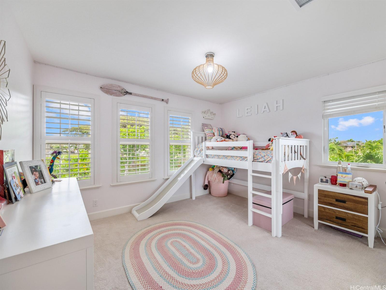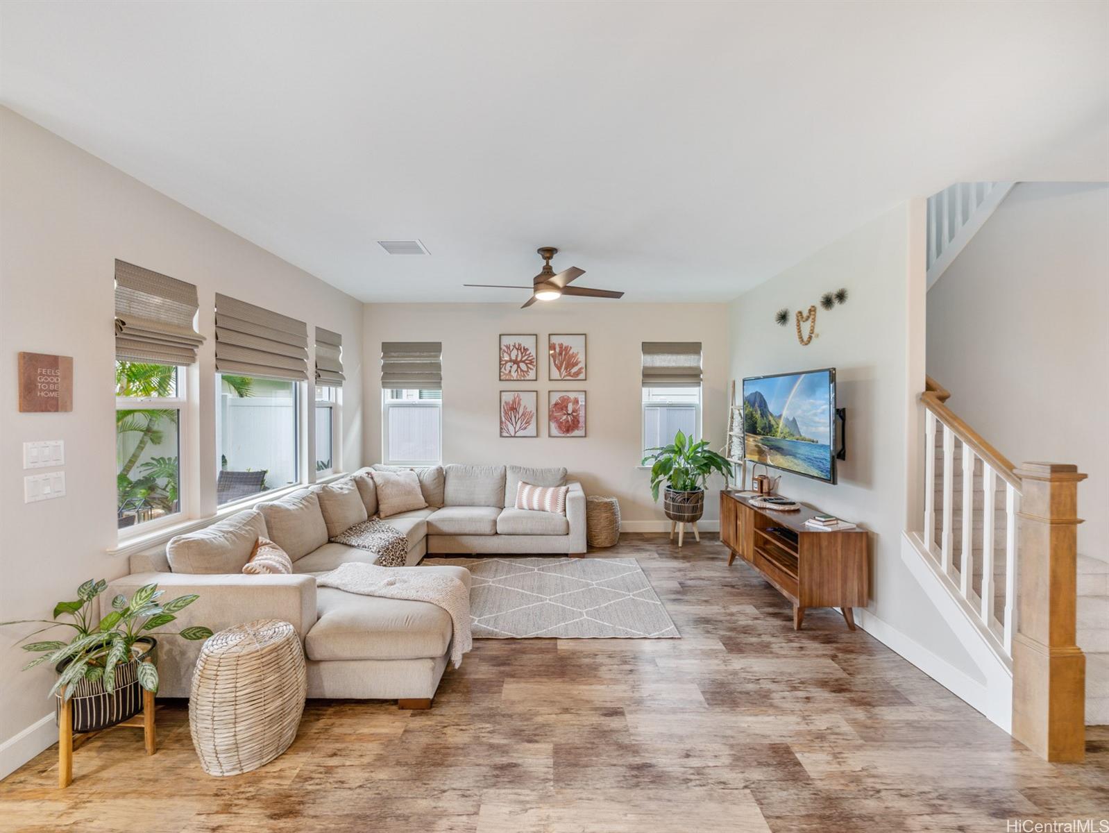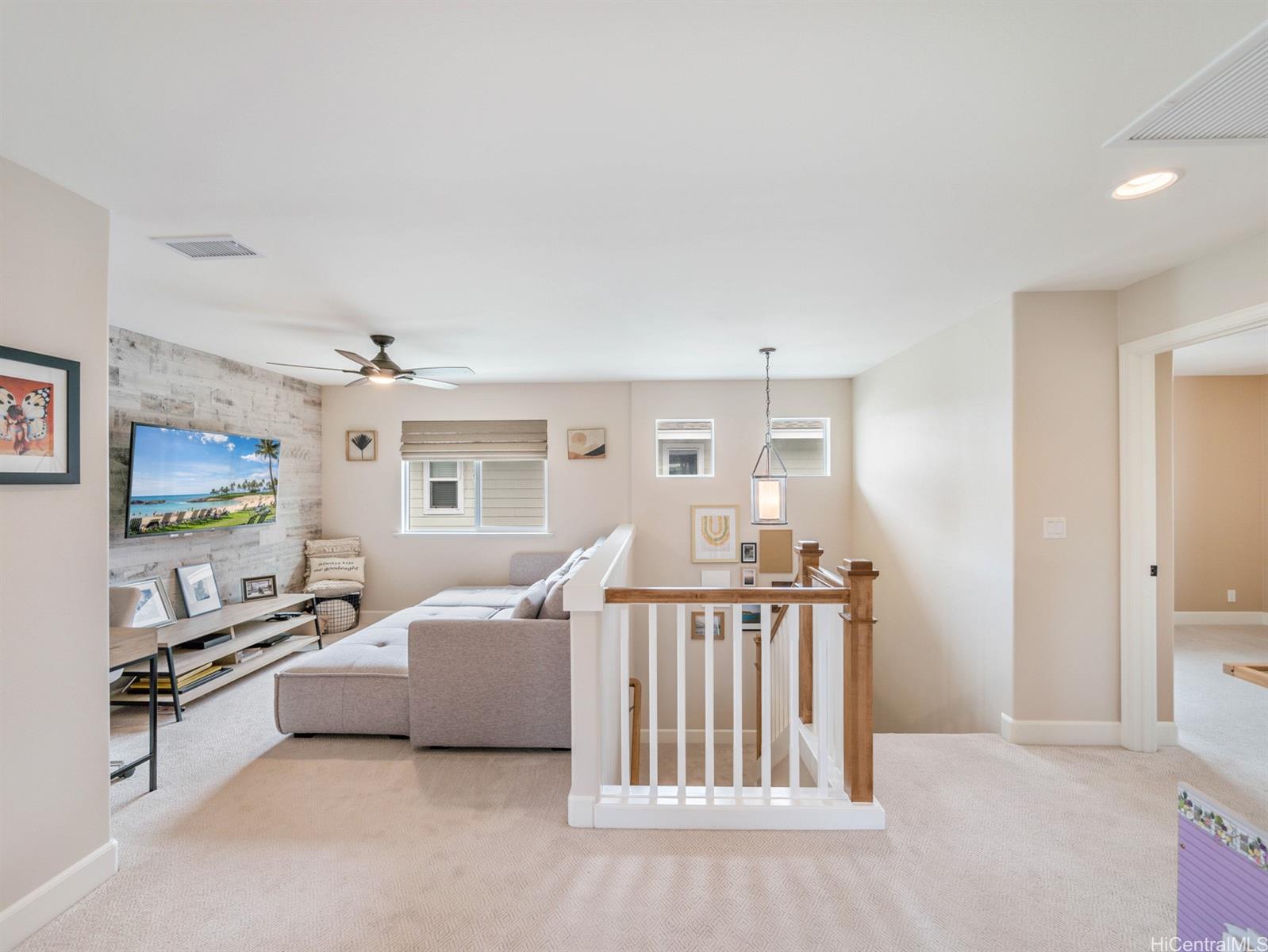 Enjoy elevated island living in this beautifully upgraded home in the desirable Kuapapa at Hoakalei community. The spacious layout includes a first floor bedroom and full bath, plus an office or study featuring neutral linen wallpaper and custom open shelving. High ceilings and an open concept floor plan design create a bright living and dining area that flows into the fully upgraded modern chef’s kitchen. Upstairs offers a spacious loft with a wood plank accent wall, a large primary suite with a designer tray ceiling, large walk-in closet and primary bathroom with a soak-in tub, two additional bedrooms, bathroom and a beautifully designed laundry room.Fenced-in landscaped backyard features a covered lanai and custom deck, perfect for relaxing and entertaining. The two car garage includes a Chamberlain smart garage system with WiFi, finished concrete flooring, built-in shelving, and wall mounted storage.HOA fees include cable/internet, access to the Wai Kai Hale Club and Kuapapa Swim Club with pool, spa, and BBQ areas. Located near the Wai Kai recreation center, beaches, golf courses, schools, restaurants, and shopping. Tenant occupied. Photos are from previous listing entry.