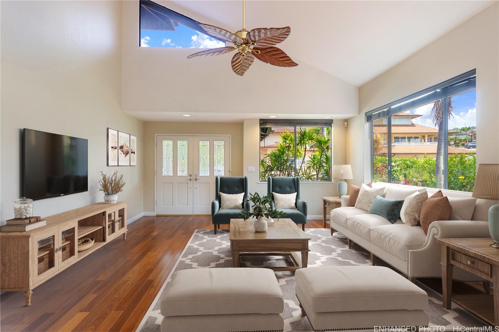 Move-in ready 4-bedroom, 3-bath custom home in the gated Kumulani community of Upper Makakilo. Well-designed floor plan includes 1 bed and full bath downstairs, ideal for guests or multi-gen living. Spacious great room features vaulted ceilings and flows seamlessly into the dining area and kitchen, which boasts Maple cabinetry, Corian countertops, and stainless steel appliances. Upstairs, you’ll find 3 additional bedrooms, including a large primary suite with ocean views, 2 walk-in closets, dual vanity, soaking tub, and separate shower. Stay comfortable year-round with split and central A/C. Recent updates include fresh interior (upstairs) and exterior paint, and new carpet with upgraded padding upstairs. Enjoy indoor-outdoor living with an oversized slate-covered patio and an Ipe wood deck surrounded by mature trees for added privacy. Additional features include an enclosed 2-car garage and a separate laundry room with utility sink. Conveniently located near Kapolei’s shopping, dining, and entertainment, and a short drive to Ewa and Ko Olina beaches. Don’t miss your chance to own in one of Makakilo’s most sought-after neighborhoods. One or more photos have been enhanced.