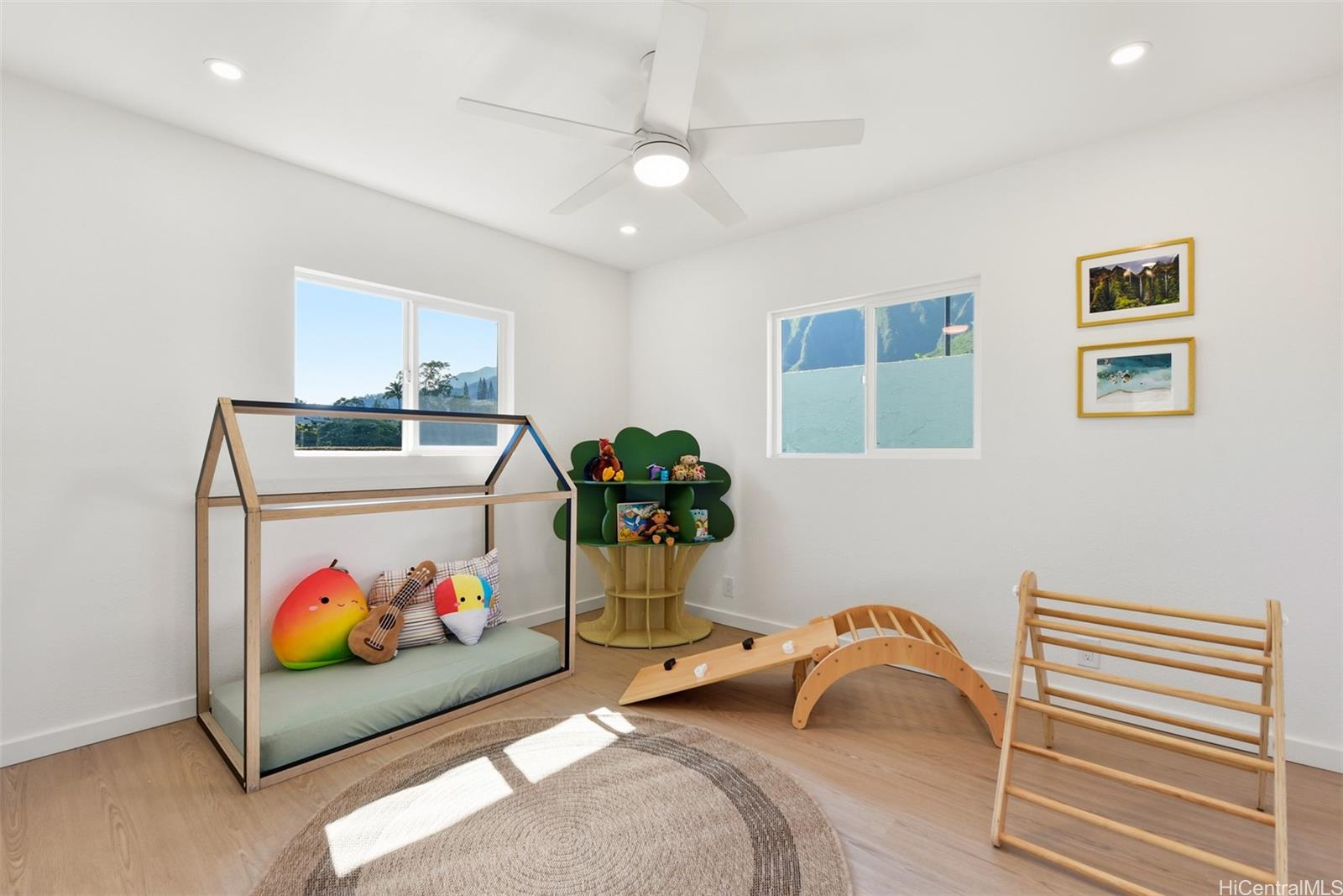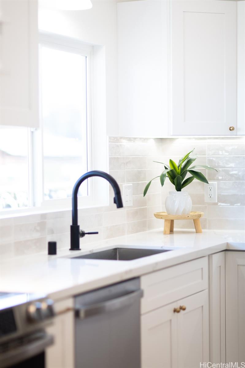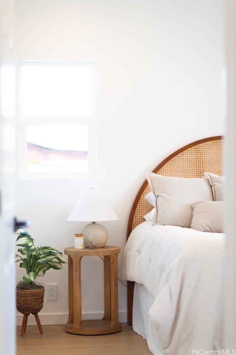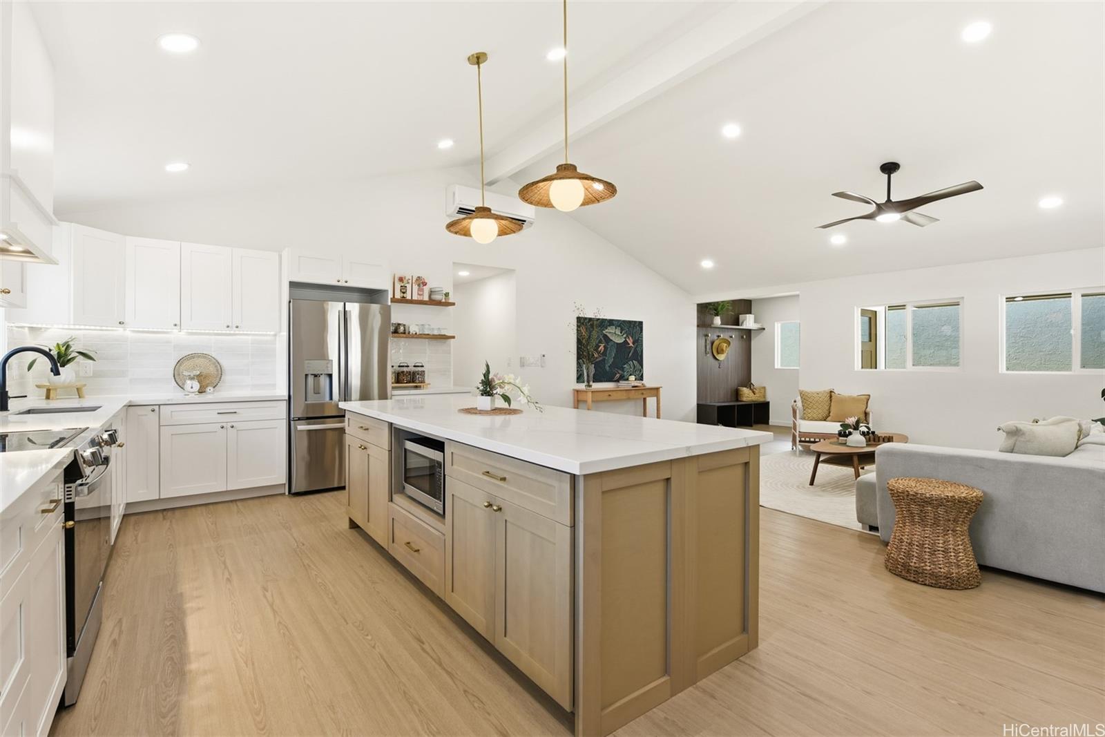 Exquisitely renovated Ahuimanu home with 4 bedrooms, 2.5 bathrooms, plus a bonus room perfect for an office or flex space. Vaulted ceilings and an open layout create a bright, airy interior with clean, natural tones. Chef-inspired kitchen features a 9-foot quartz island, Delta fixtures, and all-new stainless steel appliances, with a walk-in pantry and integrated laundry area. Mudroom-style entry, brand-new windows with built-in tint, roof, split AC, gutters, and irrigation, plus recent fumigation, provide convenience and peace of mind. Breathtaking mountain views complete this serene setting.Located on a private cul-de-sac. $400/year HOA ($200 semiannual) covers insurance, electricity, and road maintenance. Property sold As-Is. Tax records do not reflect the 4th bedroom; buyer to do their own due diligence.
