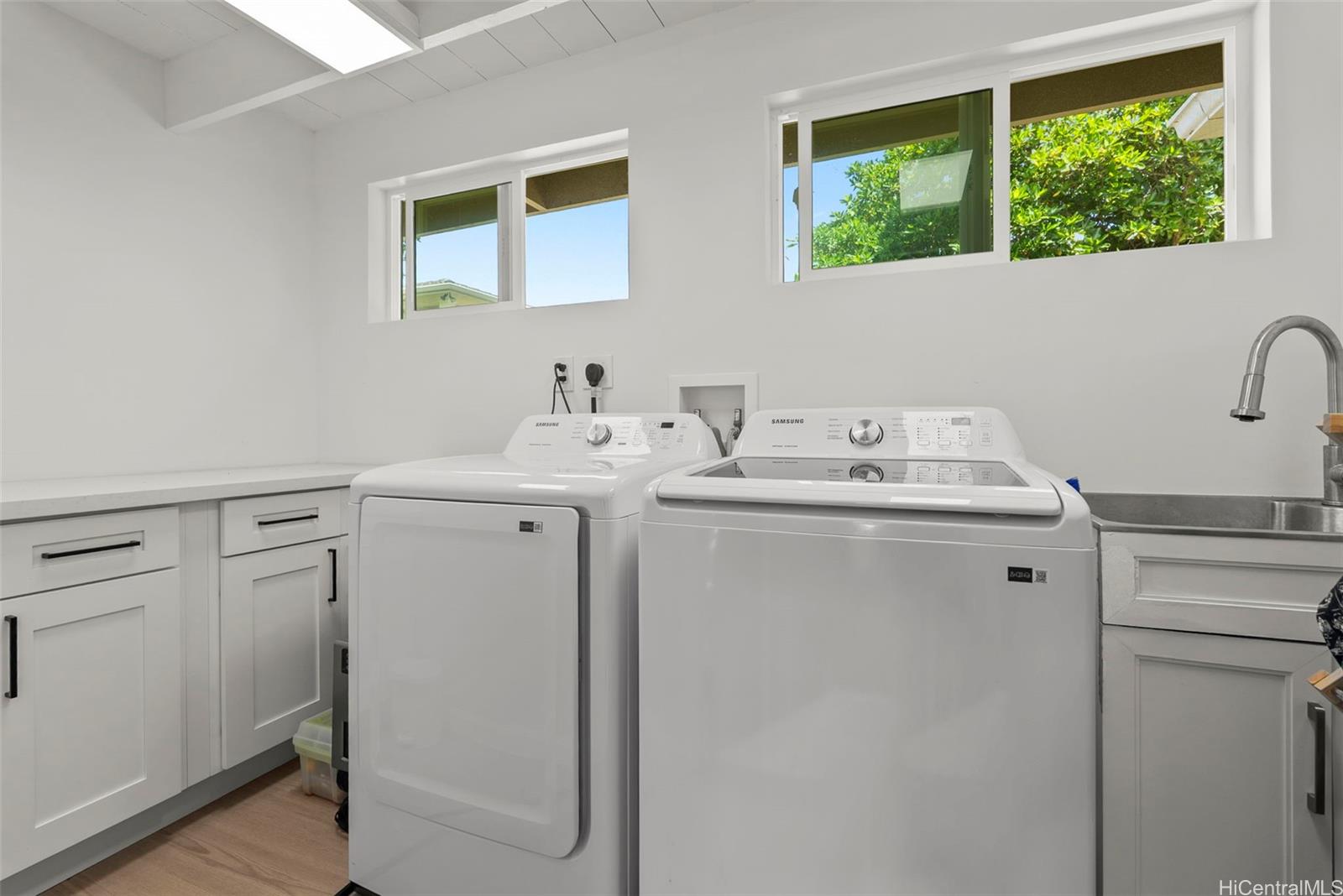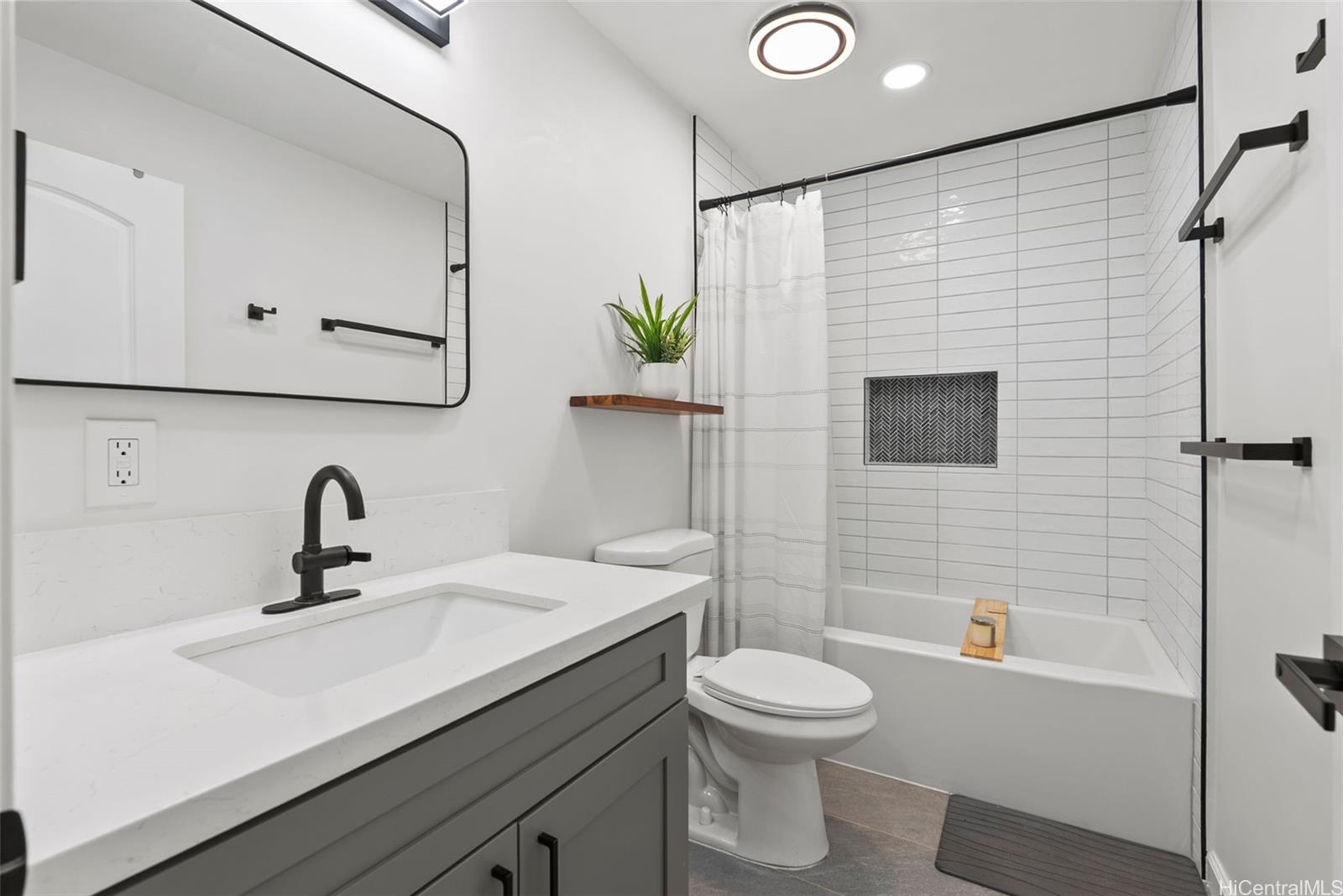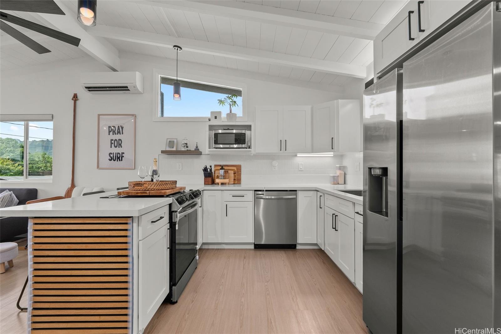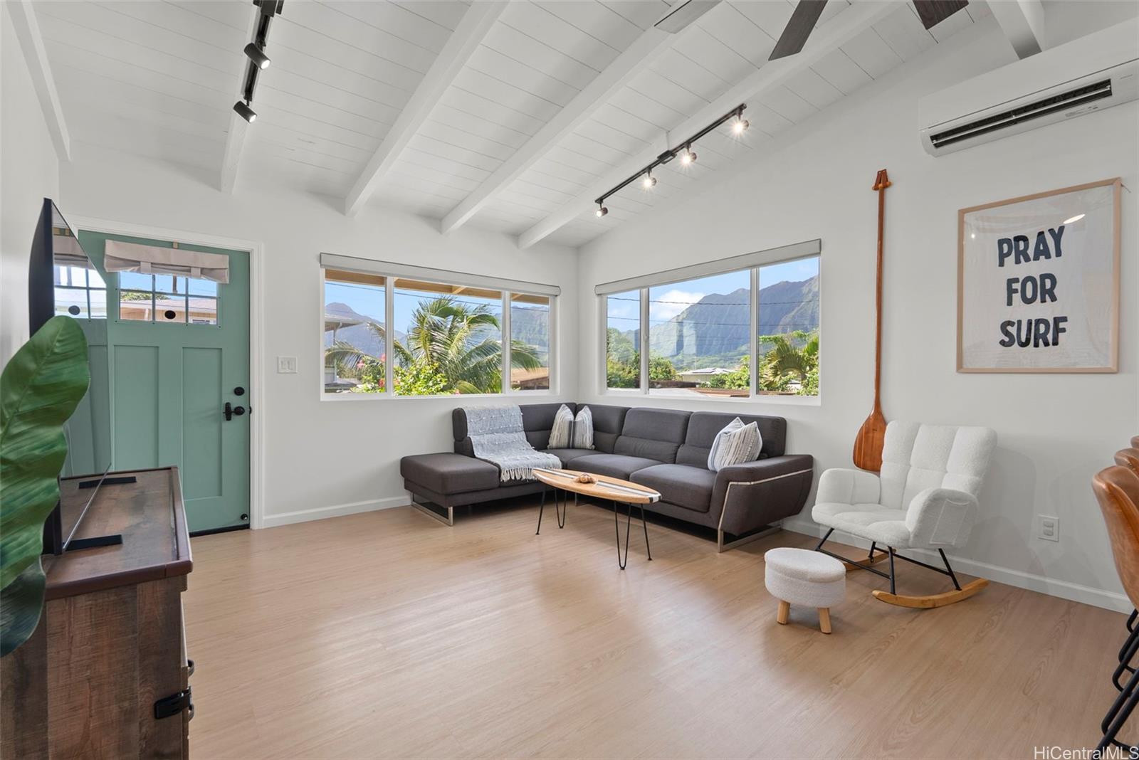 Beautifully renovated, turn key, 4-bed, 2-bath, split level, single family home on a generous 8,127 sqft lot in Kaneohe. Fully renovated kitchen with stainless steel appliances, refreshed bathrooms, split ACs in the living room, entertainment room, primary bedroom, and the room next to the entertainment room. Window ACs in the remaining two bedrooms. Separate washer and dryer room outside by the carport along with a storage room. Carport provides ample space for two vehicles to be fully covered while two additional vehicles can be parked behind. The fully fenced backyard is a tropical escape with mature lychee and orange trees, a young papaya, and fragrant puakenikeni and jasmine trees. Minutes to Windward Mall, Super Target, Kailua Beach, and everyday conveniences, with the stunning Ko’olau Mountains as your backdrop. H-3 access makes island-wide commuting easy, very close to Marine Corps Base Hawaii, access to H-3 takes you across the island for an easy commute to Camp Smith, Joint Base Pearl Harbor Hickam, Tripler, and Fort Shafter. Investor minded owners can turn the entertainment room and attached bedroom into a separate rentable ohana unit. Pictures were enhanced.