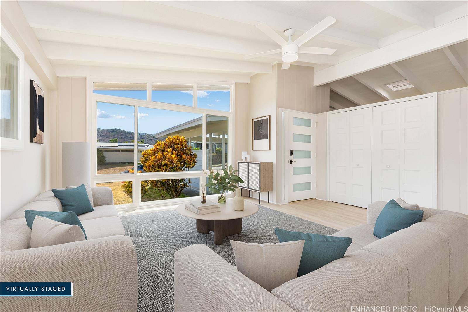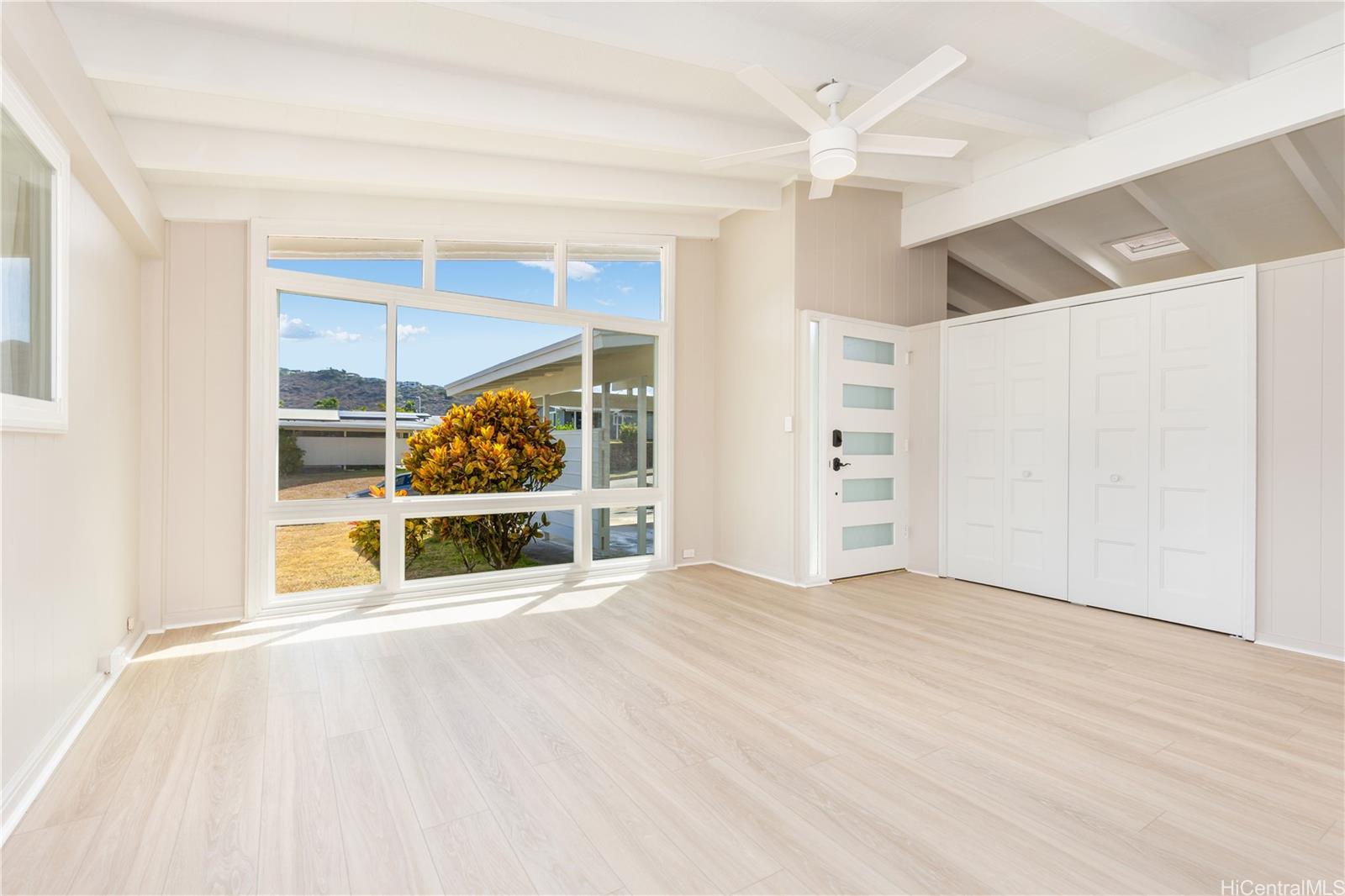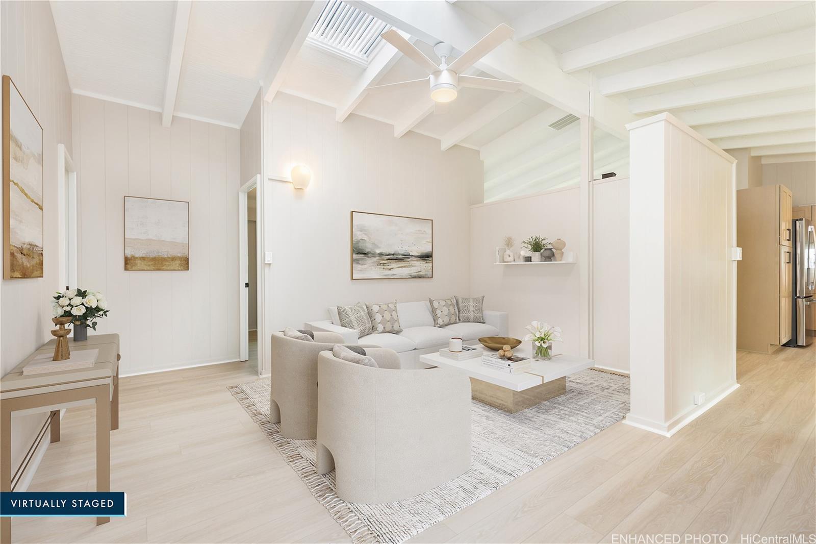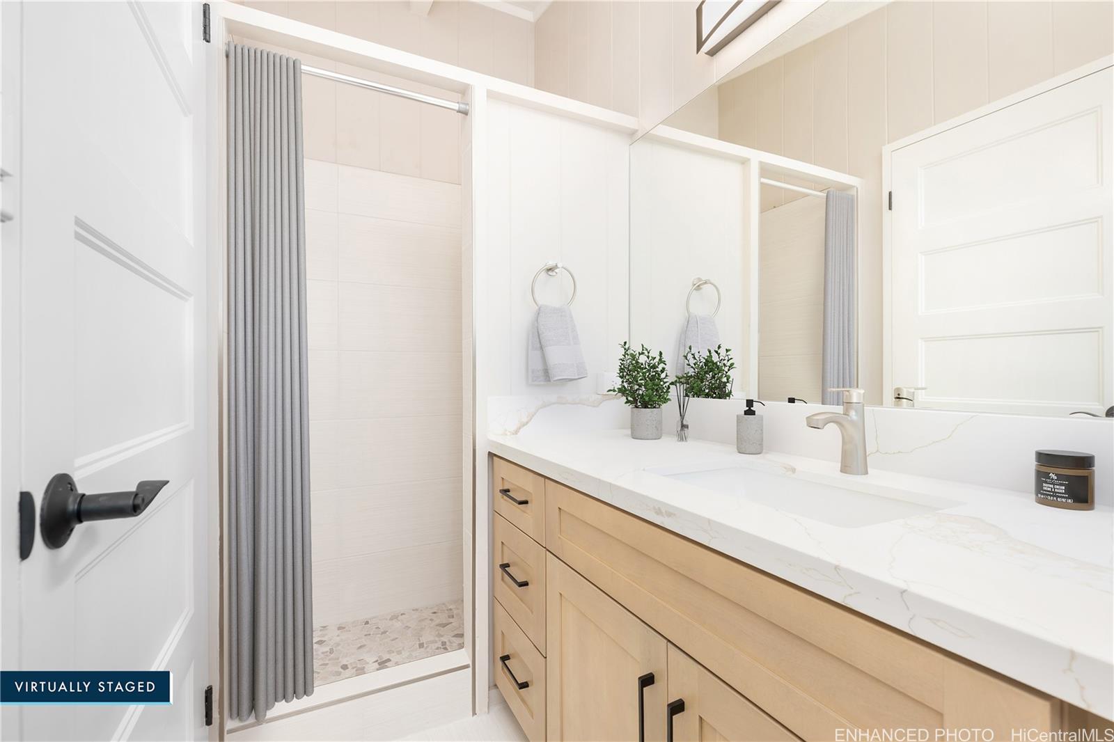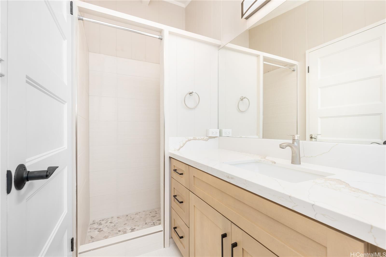 BACK ON THE MARKET!! Newly Remodeled 4-bedroom, 2-bath, all bedrooms have walk-in closets!. This beautifully updated home offers modern comfort and style with a spacious layout perfect for today’s living. Featuring a brand-new kitchen with sleek cabinets, quartz counter tops, appliances, new paint inside and out, the home shines with upgraded finishes throughout. Fresh luxury vinyl plank flooring, ceiling fans, and efficient split A/C units throughout and attic solar fans add both comfort and convenience. Both bathrooms have also been tastefully remodeled with new cabinets, quartz countertops, fixtures, and tiled showers creating a clean, contemporary feel. Puakenikeni tree in front, banana, avocado trees in back. Move-in ready and designed with quality upgrades, this home is ready to welcome its new owners!Seller requests escrow with Old Republic Title & Escrow – Quentin Chun, Officer.