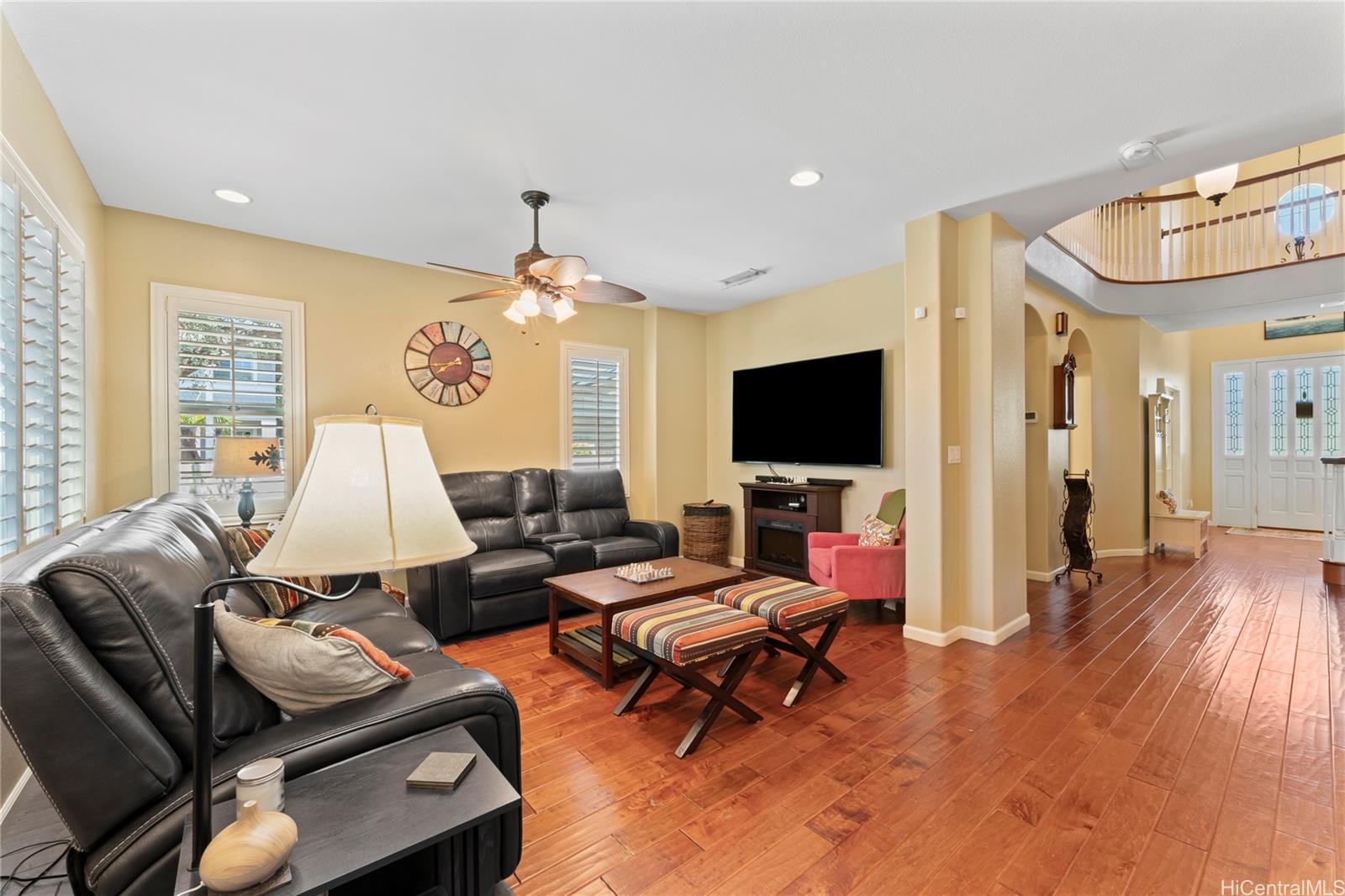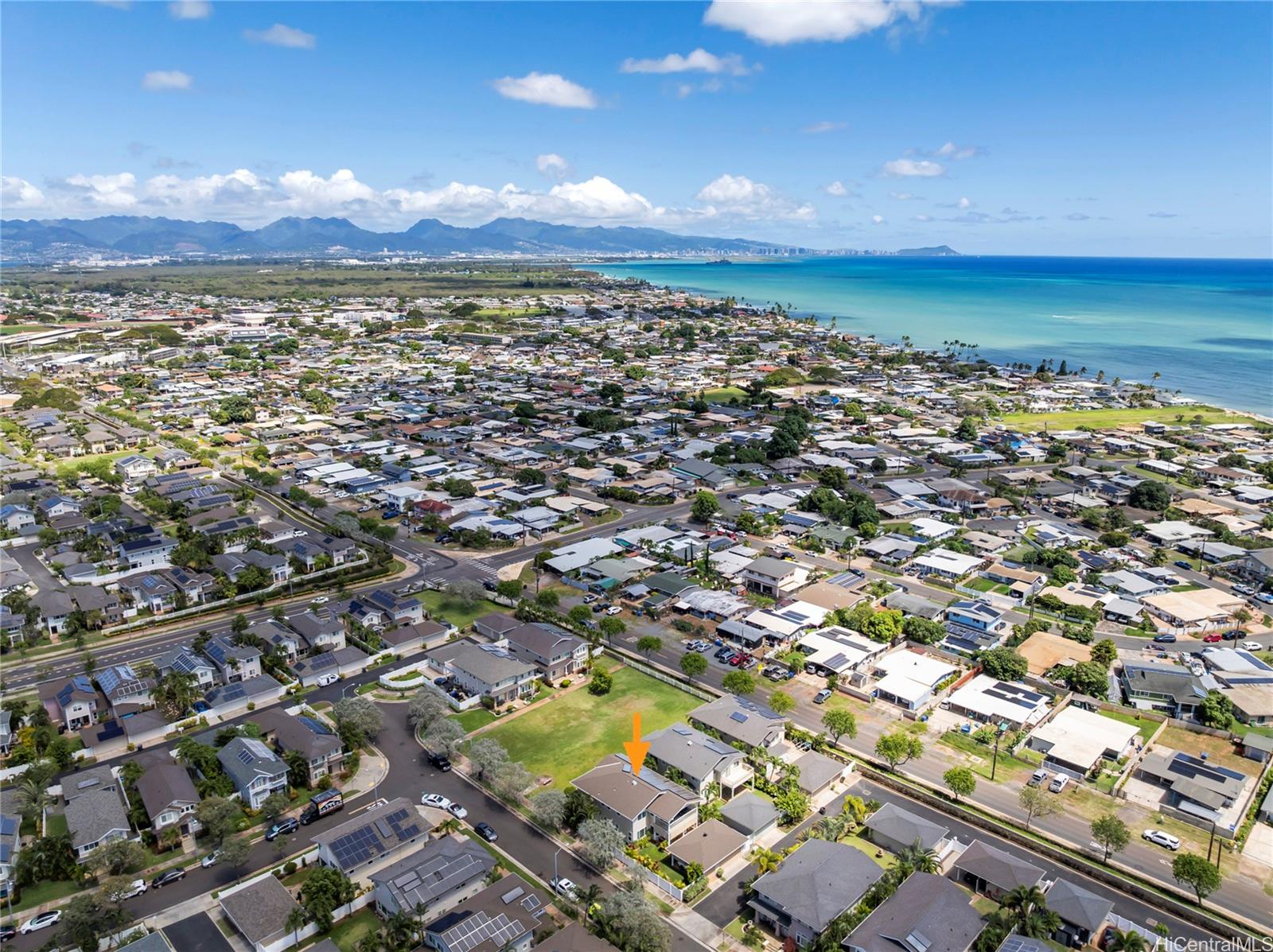 2.8% VA rate! This meticulously maintained corner-lot home features 4 bedrooms and a bonus office on the 1st floor. 43 owned solar panels with transferable 1:1 net metering, a new roof (2024), and a new A/C unit (2020). The property fronts a large shared green space with no houses directly in front or on one side. Interior highlights include hand-scraped bamboo floors, plantation shutters throughout, and dual living areas designed, so everyone has their own space. The gourmet kitchen has granite counter tops, a large pantry and custom cabinetry with dual beverage refrigerators. The primary suite features dual closets and a large private lanai with ocean views, while front bedrooms view Diamond Head. Enjoy built-in Bose speakers, a laundry room, and ceiling fans in nearly every room. Outdoor amenities include a fenced yard, hot tub, dog run and upgraded stone flooring on the lanais and porch. Systems include a solar water heater, new solar inverter (2024), solar fans, and a multi-zone sprinkler. A 2-car garage plus a covered carport provides 3rd parking. Proximity to schools, the beach, and the community center. Drive times:JBPHH (25-40 min), Schofield (25-35 min), HNL (25-40 min).