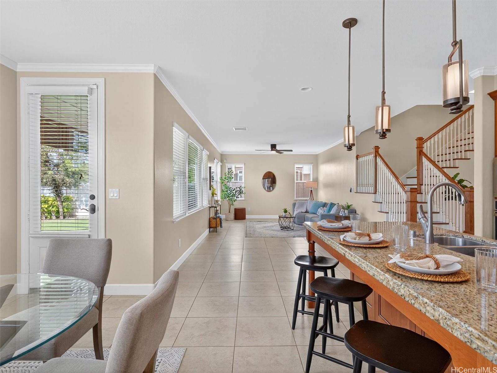 SELLER OFFERING $20,000 CREDIT FOR BUYERS’ CLOSING COSTS OR 2/1 BUYDOWN. Discover relaxed island living with an elegant twist at this beautiful Ka Makana residence—where your backyard opens to the Barber’s Point golf course. The open layout fills the home with natural light and flows effortlessly from the living and dining areas to the backyard, creating a true indoor-outdoor experience. It’s the perfect setting to entertain and embrace the Hawaiian lifestyle with family and friends. On the lower level, a dedicated office or study provides a quiet retreat for work or creative projects, along with a full bedroom and bath. Upstairs, the primary suite features dual walk-in closets and a spa-inspired bath, creating a serene escape. Two additional bedrooms and a full bath complete the upper level, along with a lanai overlooking the golf course. This home is equipped with owned PV panels and solar water heating, helping to reduce monthly energy costs.Resort-style living awaits in Hoakalei, with a $281/month HOA that covers internet, cable, access to the community pool and tennis courts, plus the nearby Wai Kai surf and lagoon destination featuring dining, events, and a vibrant community.