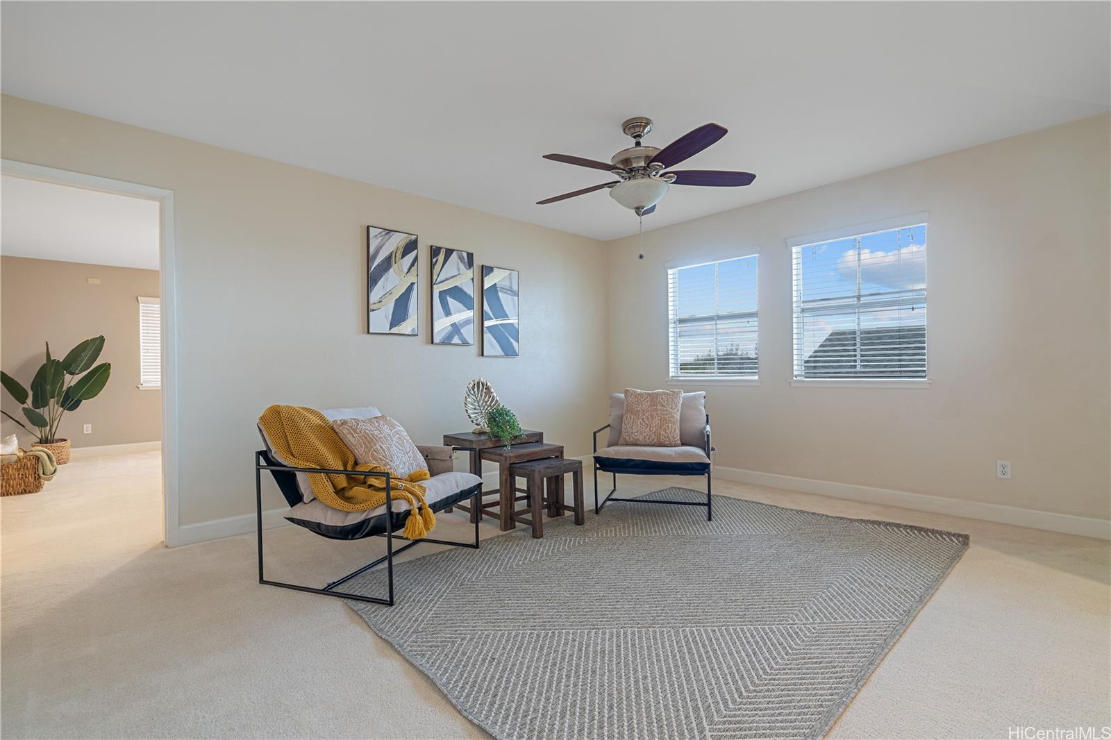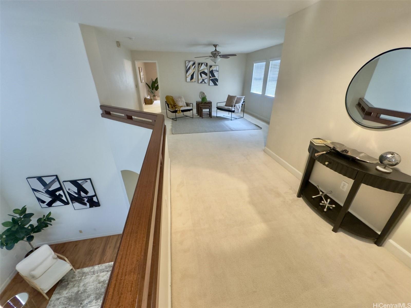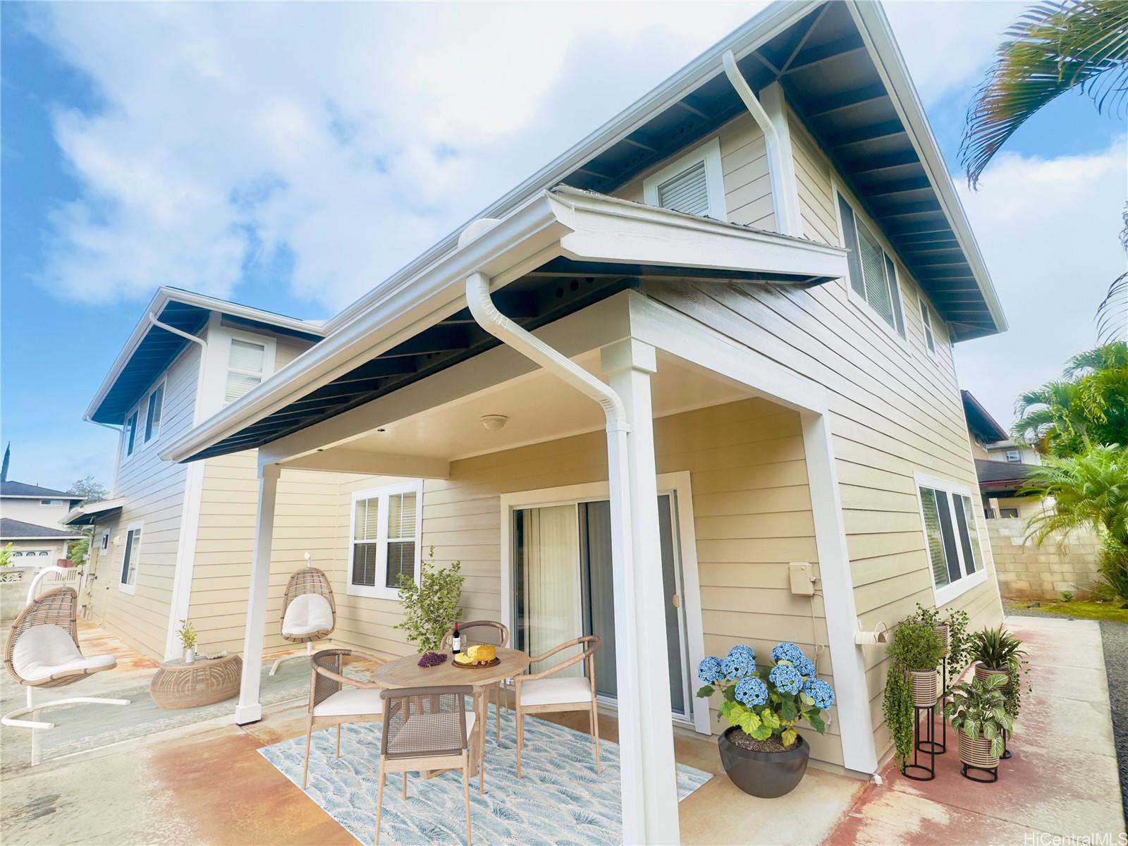 Savor the perfect combination of space and comfort in this beautiful 2-story single-family home, showcasing the popular American Classic Residence Four floorplan. Nestled at the top of Mililani Mauka, it offers over 2,600 sq. ft. of interior living space with an ideal 4-bedroom layout, including one bedroom conveniently situated downstairs. It boasts an expansive executive primary bedroom with a spacious en-suite & a large walk-in closet. Situated on a 5,600 sq. ft. lot, this home boasts multiple entertaining spaces, including an inviting entry sitting room with high ceilings, a roomy living area, an open kitchen at the heart of the living room, a dedicated formal dining space, & a large loft area upstairs. Featuring 2.5 bathrooms, including a convenient half-bathroom downstairs, well-organized closet systems, & a garage equipped with overhead shelves, this residence prioritizes functionality & lifestyle. Step outside to discover a covered outdoor lanai, ideal for alfresco dining or relaxing. The low maintenance fenced backyard & large grassy front yard provide perfect spaces for outdoor activities. Act fast—this gem won’t be available for long!