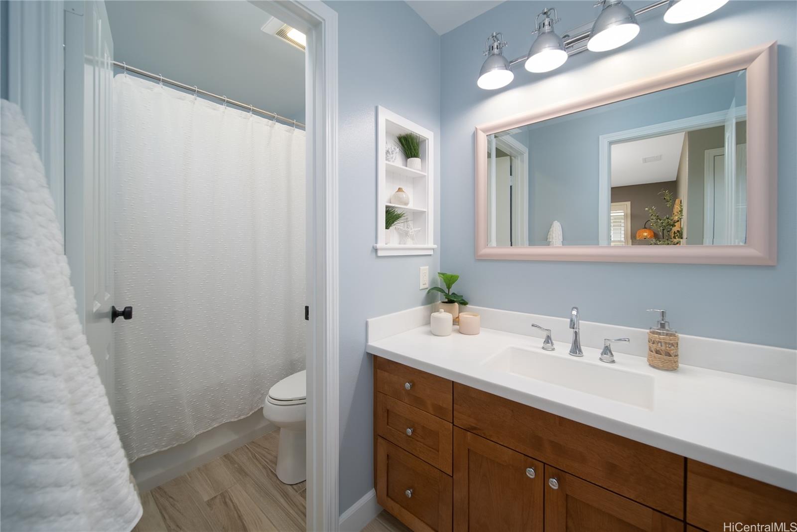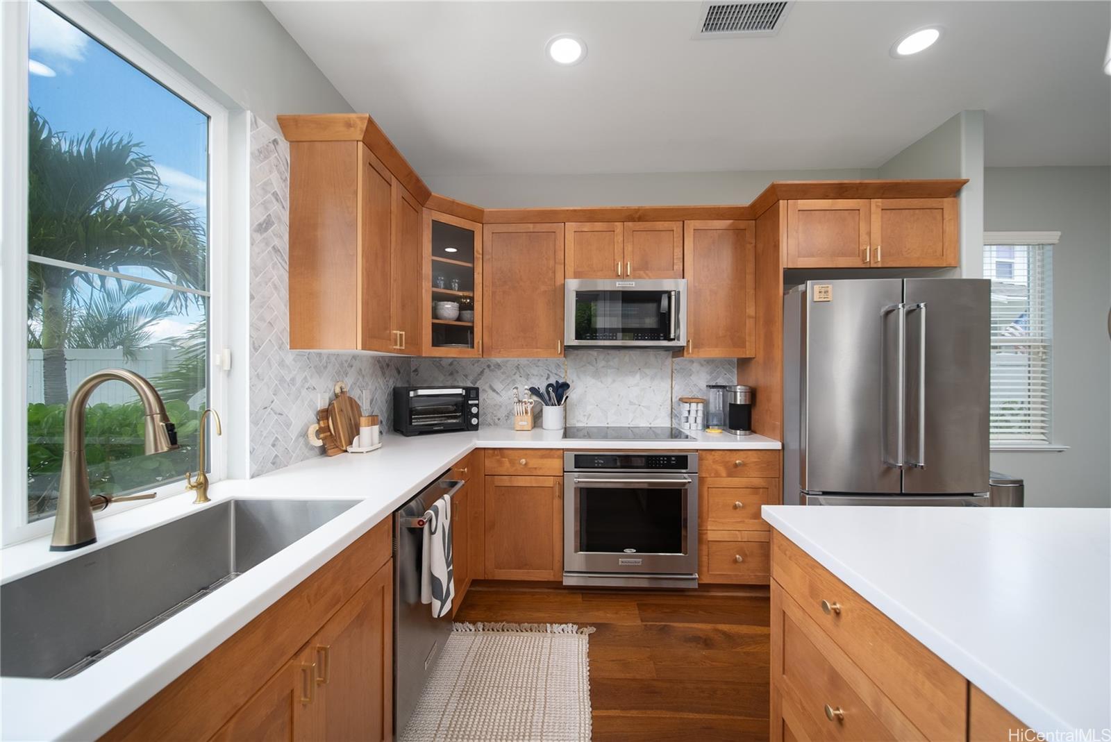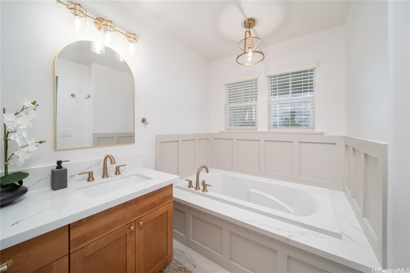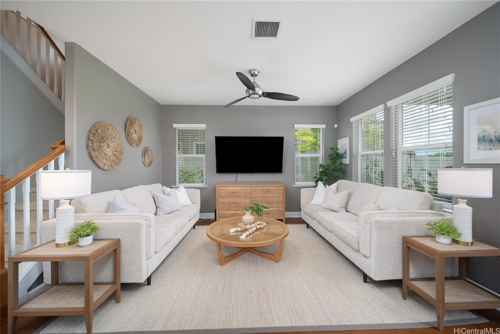 Golf Course Frontage Home & Luxury Upgrades & Stunning Views! This upgraded golf course frontage home offers breathtaking views and is just a short distance to a pristine Hawaiian beach. Never rented and move-in ready, it features real wood flooring, plantation shutters, and crown molding in the primary suite. Stay comfortable with central A/C and six ceiling fans. The upgraded kitchen boasts an expanded island, while the remodeled bathroom adds elegance. OWNED SOLAR PANELS enhance energy efficiency. From the primary suite’s covered lanai, take in stunning sunsets over Hoakalei’s golf course and water features. The lush yard with tropical blooms creates a serene escape. Just a 10-minute walk to One‘ula Beach and close to surf spots and the LineUp at Wai Kai, featuring dining, shopping, and a world-class wave pool. With resort development on the horizon, this home’s value and appeal will continue to grow. Don’t miss this rare opportunity to own a luxury golf course home in paradise!
