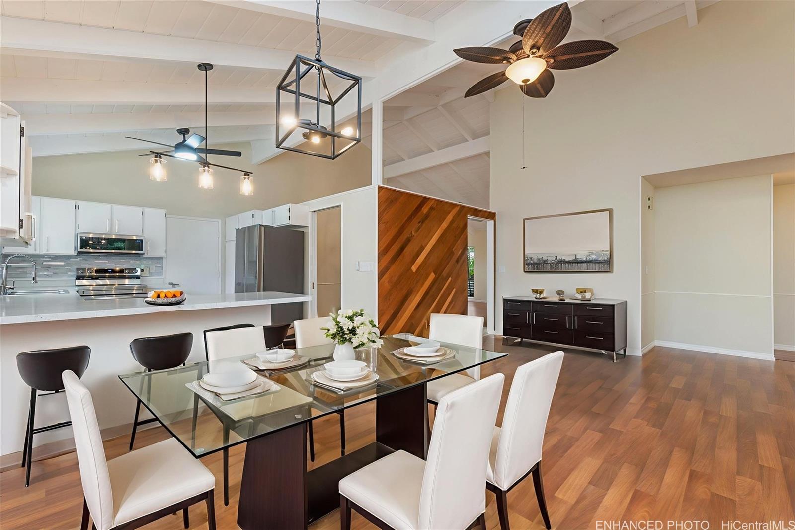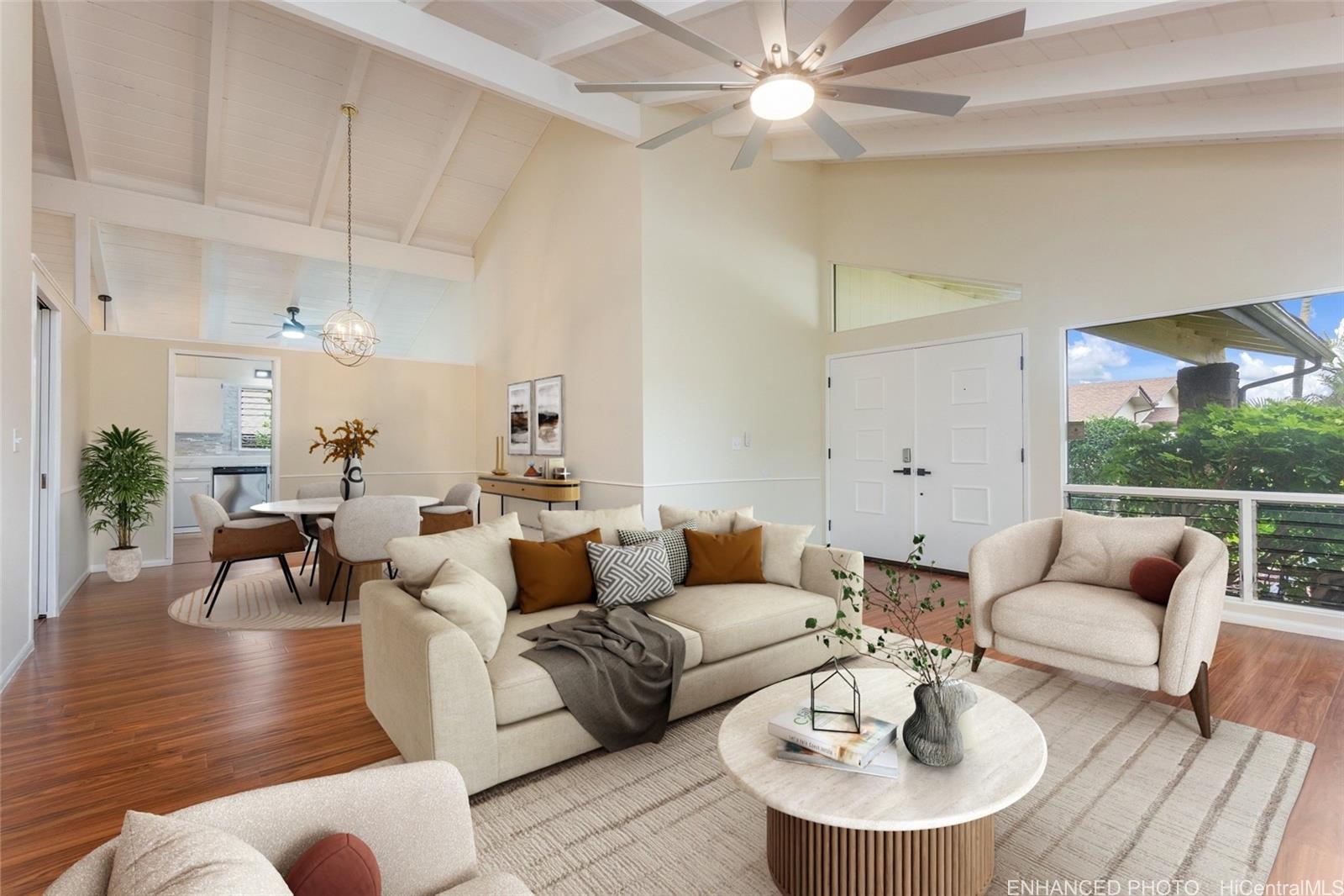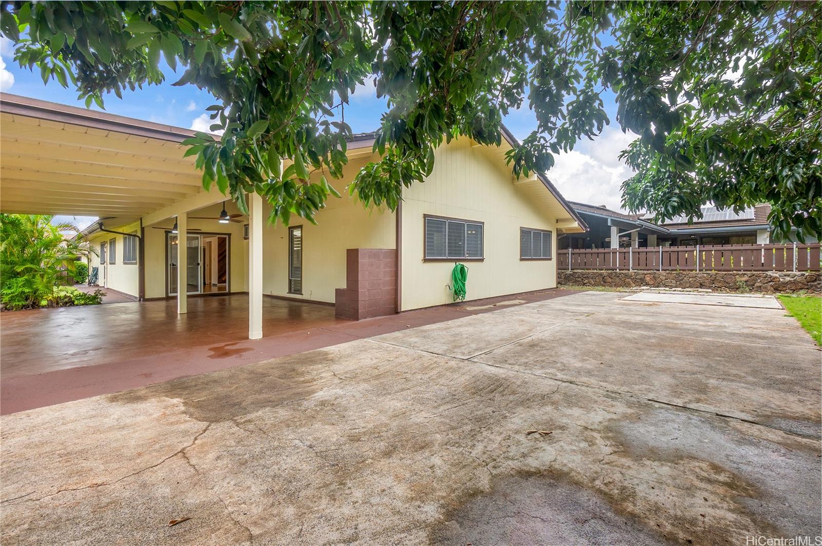This is the one buyers wait for—an exceptionally well-cared-for single-level (no stairs) 4BR/2BA in Newtown Estates with a rare, oversized 0.27-acre lot. Outdoor foyer entry, with contemplation garden past double doors that open into bright, airy living and dining spaces highlighted by vaulted open-beam ceilings. Move-in ready updates include fresh interior paint, Pergo Outlast+ flooring, new lighting/fans/outlets fixtures, & new appliances. Updated bathrooms: new flooring, vanities, mirrors, and reglazed tubs.Outside, enjoy the privacy you rarely find: mostly flat, fully fenced backyard framed by trees and lush greenery. Entertain under the covered lanai and spread out on the expansive patio, new lighting w/ceiling fans—perfect for BBQs, pets, relaxed Hawai?i living. Oversized luxury 2-car garage with fabulous laundry, storage, and workspaces. Large driveway w/extra parking. Community Center membership included as part of the HOA is $55/month includes pool, jacuzzi, pickleball/tennis/basketball courts, + rentable gathering space. Easy access to Pearl Harbor, Pearlridge, transit, and planned new stadium. See it in person—this one is special! One or more photos have been enhanced.