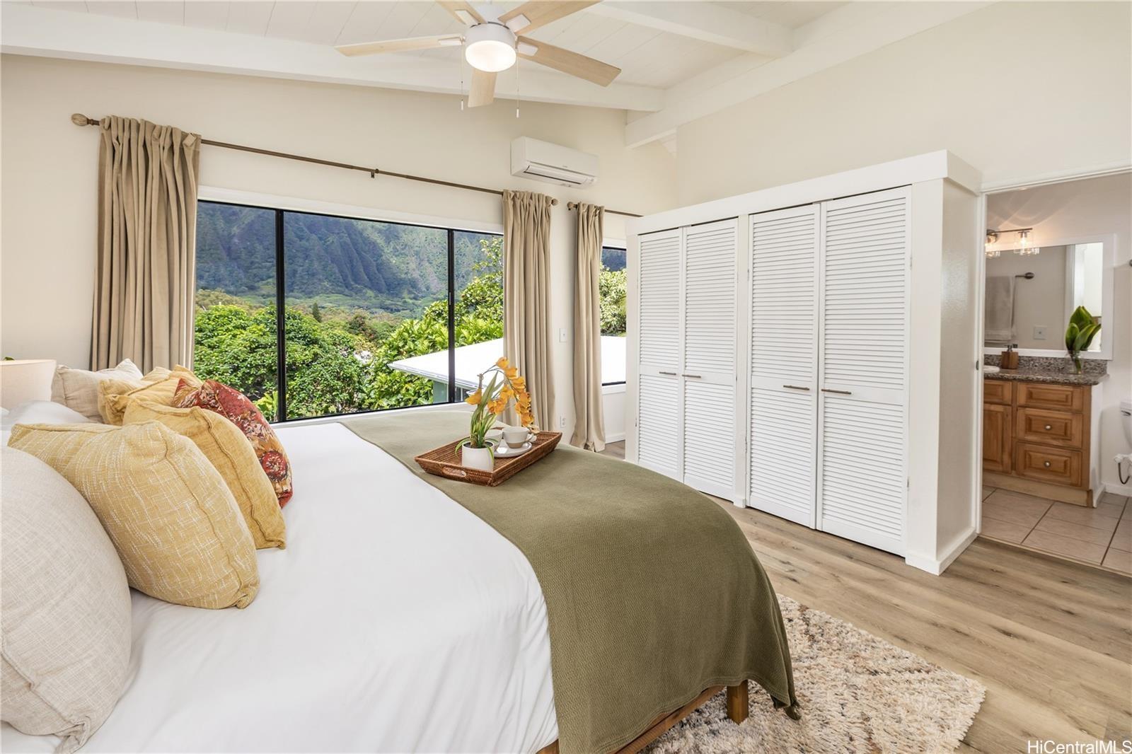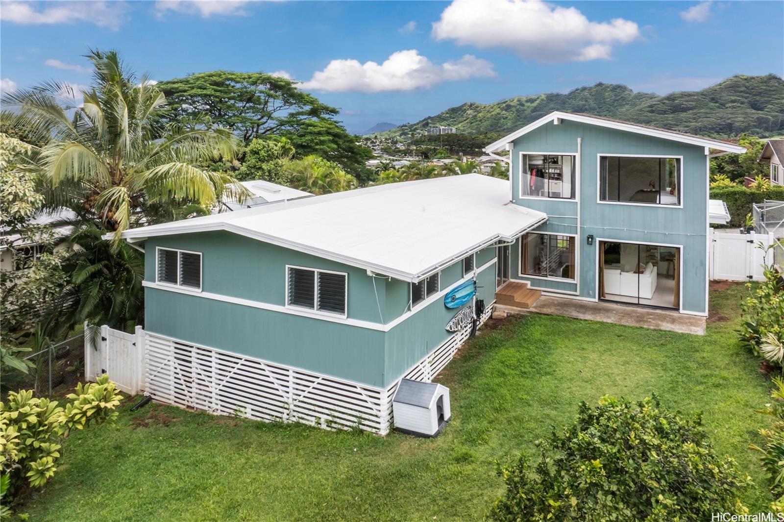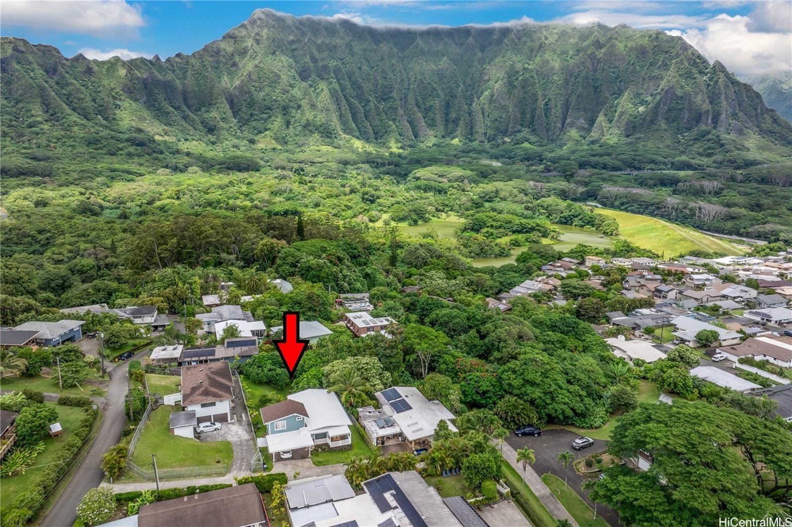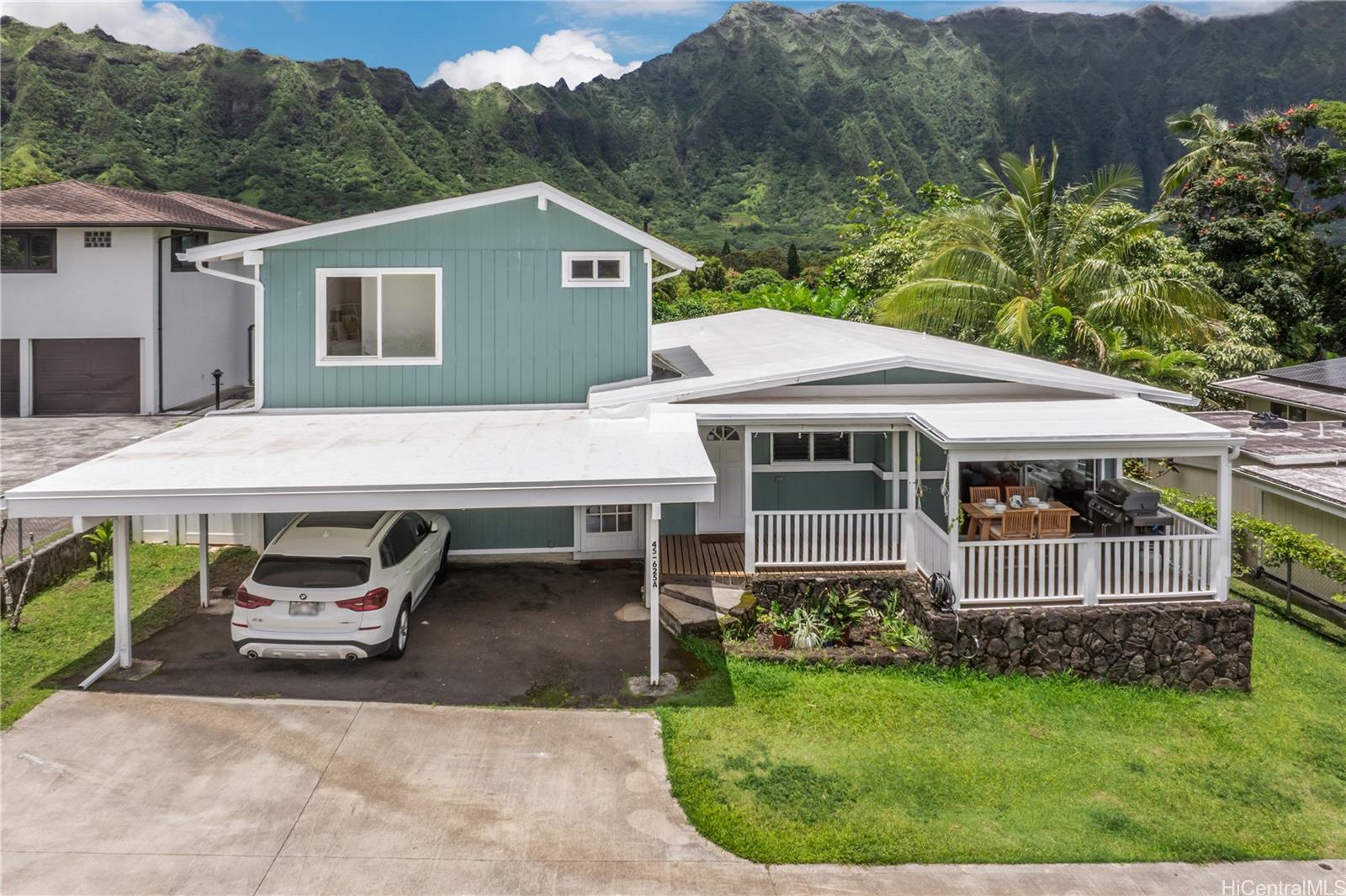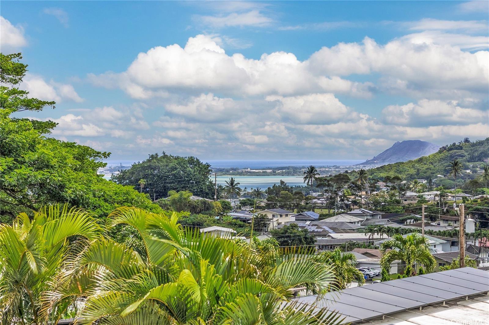 Gorgeous Ko`olau mountain views from this double sized property! The expansive, fenced, lush backyard features fruiting avocado and ulu trees. Two lots, which were purchased separately, were recently combined, creating one TMK. The wonderful front covered lanai opens to the living room and kitchen, perfect for indoor/outdoor living. The kitchen, in the heart of the home, offers expansive countertop seating for 5, a separate dining area, and views into the living room. The entertainment room is just off the kitchen area with large windows and a sliding door to the vibrant backyard. The main primary bedroom suite is on the top floor with incredible views of the striking mountains from the large windows, a high ceiling, split AC, ceiling fan, and en-suite bath. The main level features hardwood floors, great breezes, a second primary bedroom suite with an en-suite bath and walk-in closet, and two other bedrooms, all of which have split AC, hardwood floors, and ceiling fans. This wonderful home is conveniently located close to Kaneohe town, Kailua beaches, a dog park, Windward Mall, Le Jardin Academy, freeway access, and beautiful Ho`omaluhia Botanical Gardens. A must-see home!