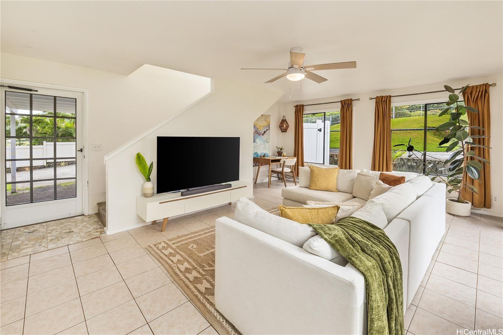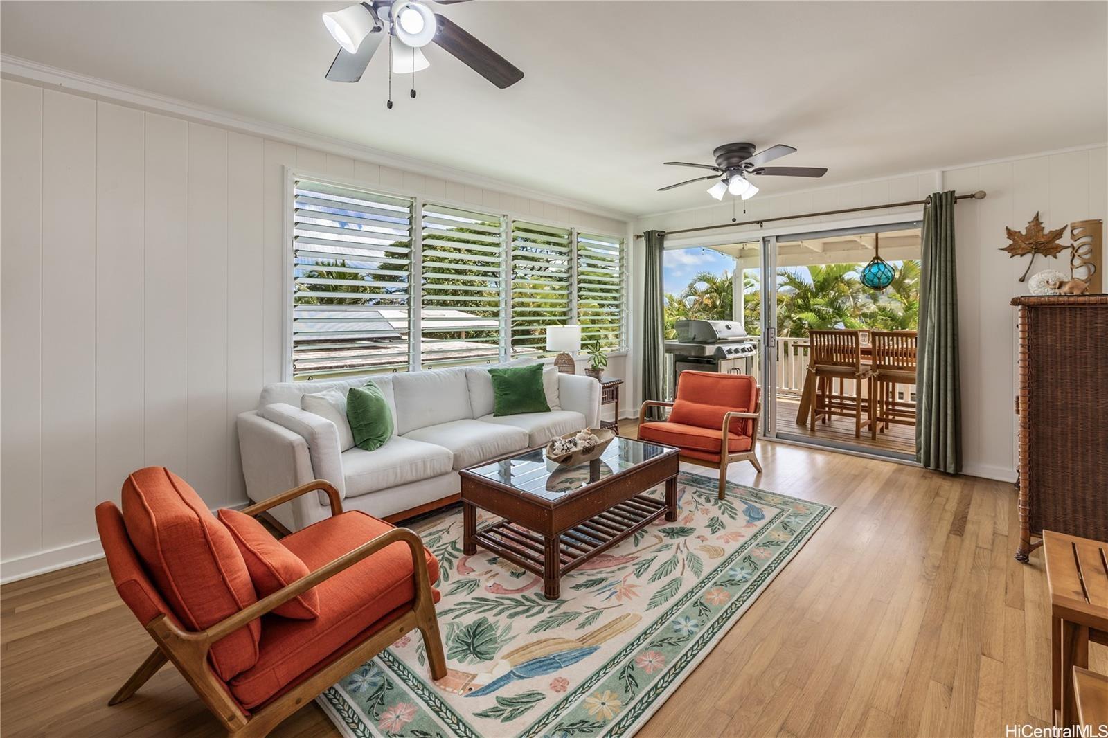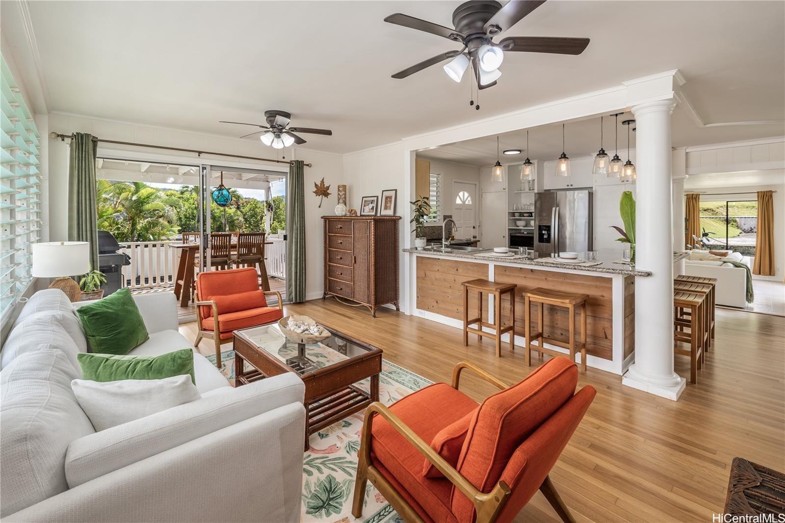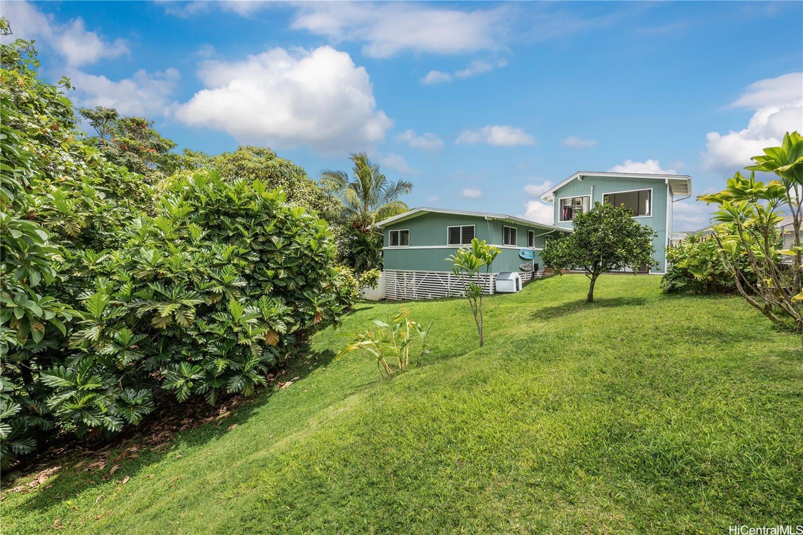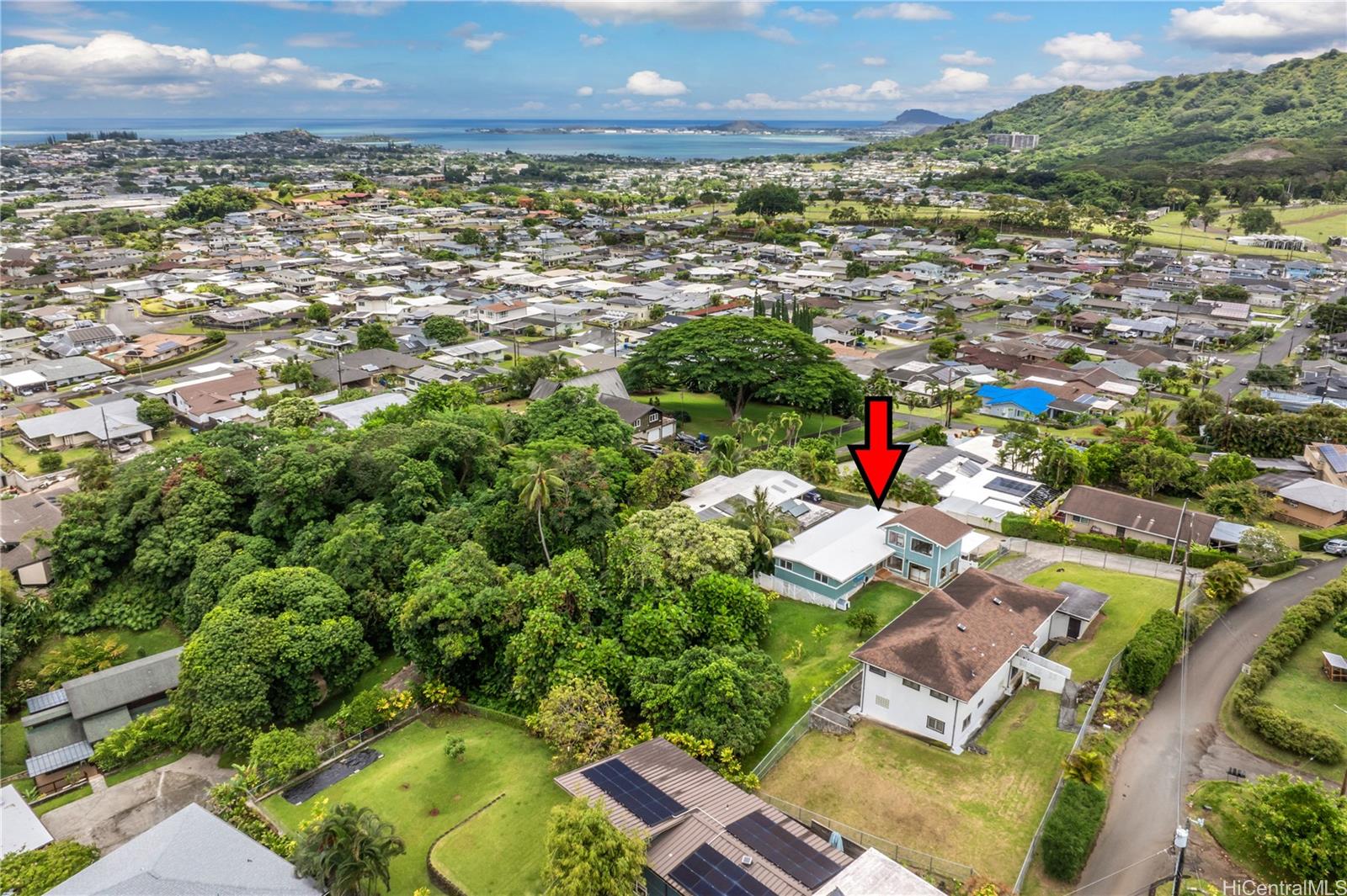Gorgeous Ko`olau mountain views from this double sized property! The expansive, fenced, lush backyard features fruiting avocado and ulu trees. Two lots, which were purchased separately, were recently combined, creating one TMK. The wonderful front covered lanai opens to the living room and kitchen, perfect for indoor/outdoor living. The kitchen, in the heart of the home, offers expansive countertop seating for 5, a separate dining area, and views into the living room. The entertainment room is just off the kitchen area with large windows and a sliding door to the vibrant backyard. The main primary bedroom suite is on the top floor with incredible views of the striking mountains from the large windows, a high ceiling, split AC, ceiling fan, and en-suite bath. The main level features hardwood floors, great breezes, a second primary bedroom suite with an en-suite bath and walk-in closet, and two other bedrooms, all of which have split AC, hardwood floors, and ceiling fans. This wonderful home is conveniently located close to Kaneohe town, Kailua beaches, a dog park, Windward Mall, Le Jardin Academy, freeway access, and beautiful Ho`omaluhia Botanical Gardens. A must-see home!